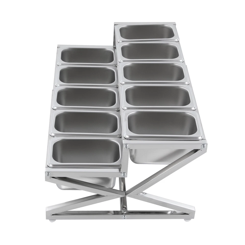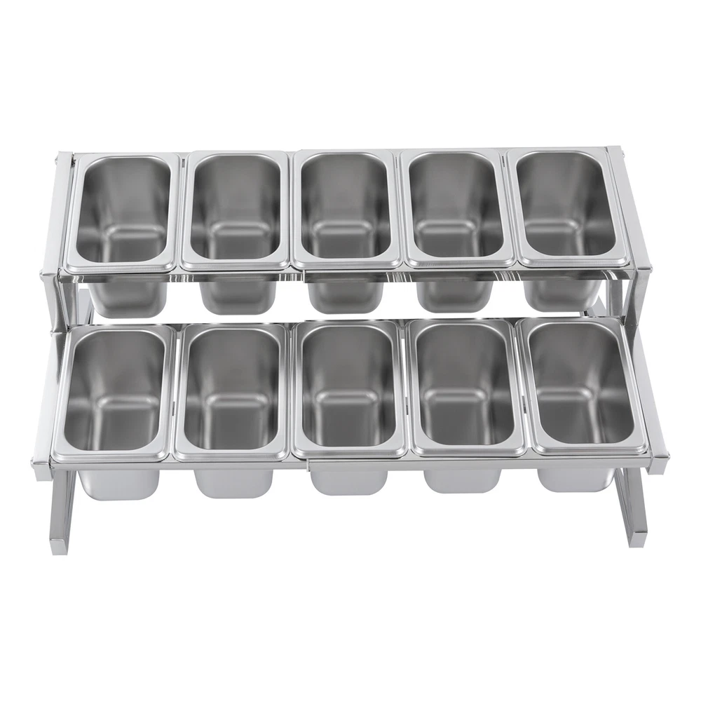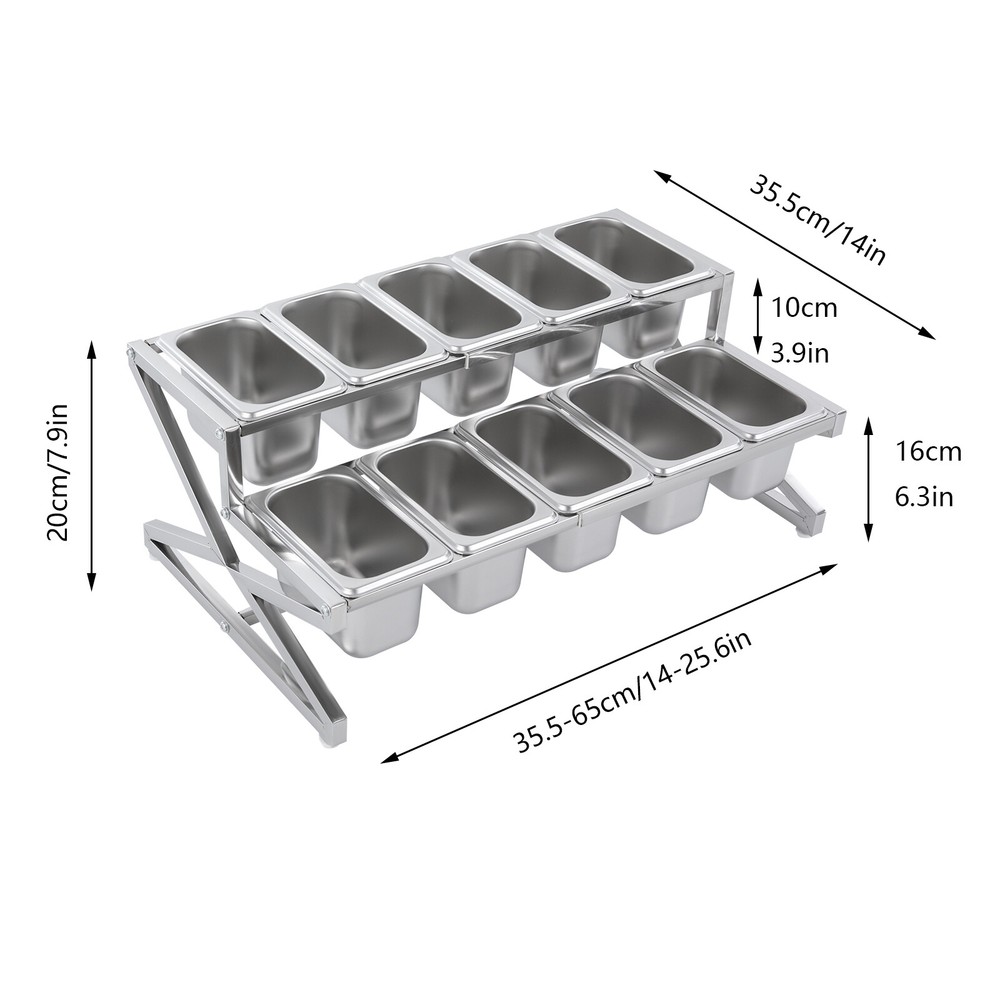 Description This expandable spice rack set allows you to organize your kitchen spices in a unified way, so you can say goodbye to the chaotic arrangement. The product is made of stainless steel with a triangular structural design that is durable and resistant to warping. It features 10 stackable pans and a length-adjustable rack, so you can easily store the product in cabinets when not in use, or accommodate different numbers of pans according to your needs, making your kitchen tidier and your cooking easier. Key Features Build to Last: The 201 stainless steel is rust-resistant, abrasion-resistant, and hard to deform, which makes this product sturdy and durable. 10*spice Box W/ Handle Organizer Shelf,2-tier,201 Stainless Steel Seasoning Rack Description This expandable spice rack set allows you to organize your kitchen spices in a unified way, so you can say goodbye to the chaotic arrangement. The product is made of stainless steel with a triangular structural design that is durable and resistant to warping. It features 10 stackable pans and a length-adjustable rack, so you can easily store the product in cabinets when not in use, or accommodate different numbers of pans according to your needs, making your kitchen tidier and your cooking easier. Key Features Build to Last: The 201 stainless steel is rust-resistant , abrasion-resistant , and hard to deform, which makes this product sturdy and durable. Expandable Design: The retractable length (14-25.6 inches) allows you to adjust it to fit different-sized platforms or let it carry different numbers of pans according to your needs. Strong Structure: The product with a triangle structure, thick materials, and reinforced screws allows it to hold less than 88.18 lbs without deformation or wobbling. User-friendly Design: Each lid comes with a handle and a small opening for the spoon to protect against dust and moisture while allowing you to easily access it with its small spoon to avoid flavor cascading. Excellent Spice Organizer: The 10 1.59 quart pans allow you to store spices, seasonings, dried fruits, dried fruits, or other food items in categories for easy daily access while saving space in your kitchen. Easy to Store: The rack can be retracted to 14 inches and the pans are stackable, so you can easily store them in your cabinets when not in use. Effortless Clean: Individually removable pans and smooth surfaces allow you to easily disassemble them for cleaning with water or a damp cloth. Customer Service: We aim to provide quality products and services. If you have any problems, please feel free to contact us. We will reply and solve the problem for you as soon as possible. Details Non-slip Feet: They provide the product with sturdy support without easily sliding on a smooth surface and protect the table surface from being scratched. Rounded Corners: The corners are smooth and rounded, so you can use them without hurting or scratching your hands. Application The products can be used to store seasonings, spices, sauces, jams, sweet soups, coffee beans, fruits, vegetables, and other food products in homes, commercial kitchens, pantries, cafes, beverage stores, restaurants, cafeterias, food trucks, and catering events. Specifications Color: Silver Style: Modern Material: 201 Stainless Steel Mount Type: Table Standing Assembly Required: Yes Number of Tiers: 2 Food Pan Quantity: 10* 1/9 Pans Load Bearing Capacity: <40kg/88.18lbs Each Pan Capacity: 1.5L/1.59qt Product Size: 35.5-65*35.5*20cm/14-25.6*14*7.9in Packaging Size: 41*31*16cm/16.14*12.2*6.3in Gross Weight: 4.3kg/9.48lbs Net Weight: 4kg/8.82lbs Package Included 1*Stainless Steel Frame 10*Pans 10*Lids 10*Ladles 1*Chinese Installation Instruction Other Needed Accessories Notes Please check the size carefully before ordering. Please allow the slight color difference caused by the shooting light and 1-3cm error due to manual measurement, and make sure you do not mind before you order. Payment Delivery details Terms of sales About us Contact us Payment We accept ebay payment 。 Fees such as import duties, taxes are not included in the item price or shipping costs. These charges are the buyer's responsibility. Delivery details Shipping: 2-9 working days to: USA Terms of sales We maintain high standards of excellence and strive for hundred percent customer satisfaction. Feedback is very important to us. We hope that you contact us immediately before you give neutral or negative feedback, so that we can address your concerns. It is impossible to address issues if we do not know about them! About us Your satis faction is our ultimate goal. We work hard to earn your trust and future business. Our certified technicians have tested each item before shipping. The unit comes with 1 year limited warranty on all manufacturing defects. a) If you receive a defective item, you may return it or ask for a discount. Please contact us within 14 days after you receive the package. b) What you returned must be intact and in its original packaging as re? u. Customer is responsible for shipping costs of the returned item. c) We will cover the cost of shipping back t with the shipping rate indicated in the registration page. We will send you a new unit or refund the full payment you paid. Thank you. Contact us Business Hour Business Hour: Monday To Friday: 8:30 AM to 5:00 PM (Beijing China time) Due to time zones, our reply to your questions may not be immediately. But within above working time, we will reply your email within 24 hours. If it's non-workdays, please kindly be patient and wait till Monday. Please contact us with ebay message. Please feel free to contact us if you have any questions. Monday To Friday: 8:30 AM to 5:00 PM (Beijing China time) Due to time zones, our reply to your questions may not be immediately. But within above working time, we will reply your email within 24 hours. If it's non-workdays, please kindly be patient and wait till Monday. Please contact us with ebay message. Please feel 