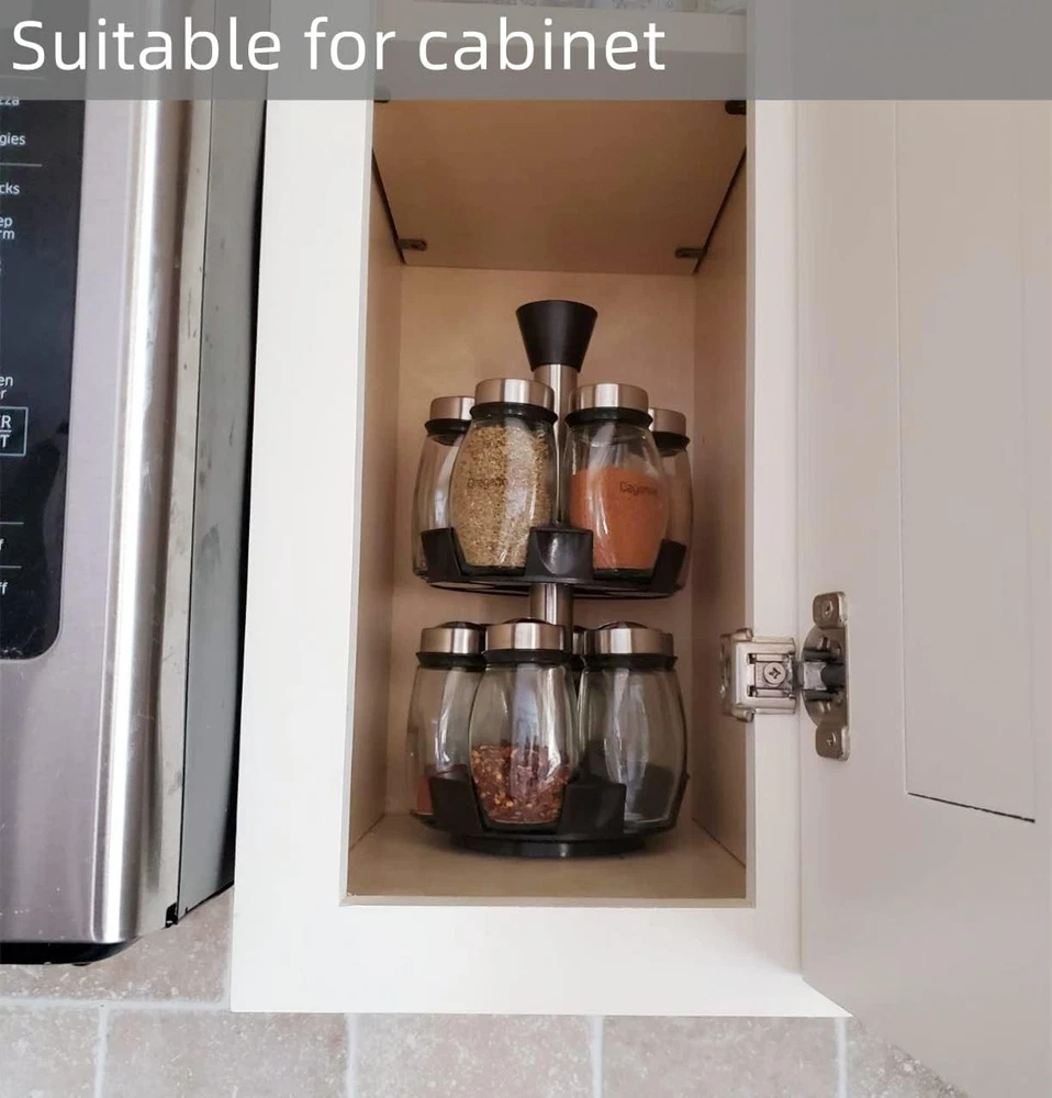Organize Your Kitchen with Style – 12-Jar 360° Rotating Spice Tower Tired of searching through messy cabinets for the right spice? Elevate your cooking experience with our elegant Rotating Spice Rack. This space-saving organizer keeps your favorite seasonings within reach and beautifully displayed. Key Features: 360° Smooth Rotation: The revolving design allows you to find your spices in seconds. Perfect for busy kitchens and quick meal prep. 12 Premium Glass Jars: Includes 12 lead-free, high-quality glass jars that keep your spices fresh, dry, and safe. The clear glass makes it easy to identify what's inside. Space-Saving Tower Design: The vertical orientation saves valuable counter and cabinet space. Ideal for apartments, small kitchens, or professional cooking stations. Sleek & Modern Look: The stylish combination of glass and durable housing fits any kitchen decor—from modern to traditional. Airtight & Mess-Free: Each jar comes with a secure lid to preserve the aroma and flavor of your herbs and spices while preventing spills. Product Specifications: Material: Lead-Free Glass (Jars) + High-Quality ABS Plastic (Rack) Capacity: 12 Jars Rotation: 360 Degree Revolving Usage: Perfect for Salt, Pepper, Oregano, Chili Flakes, Cumin, and more. Package Includes: 1 x Rotating Spice Rack Tower 12 x Empty Glass Jars