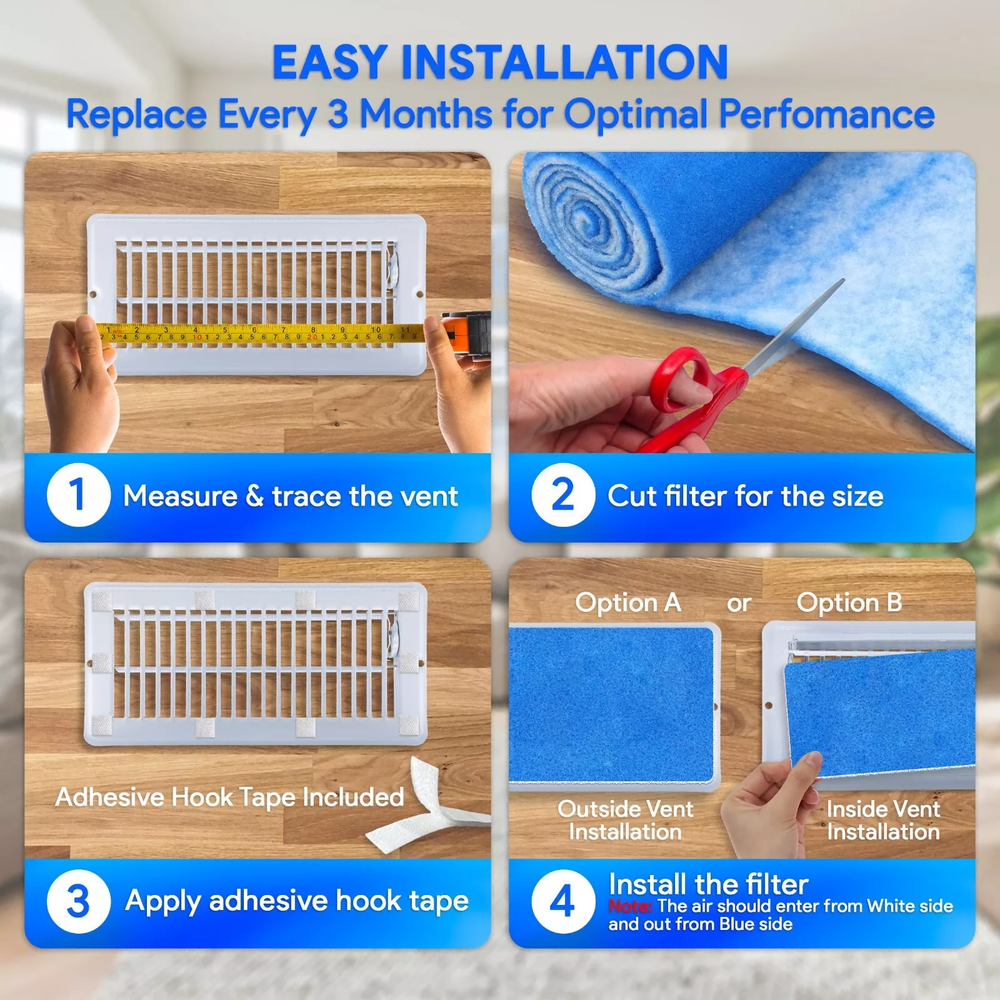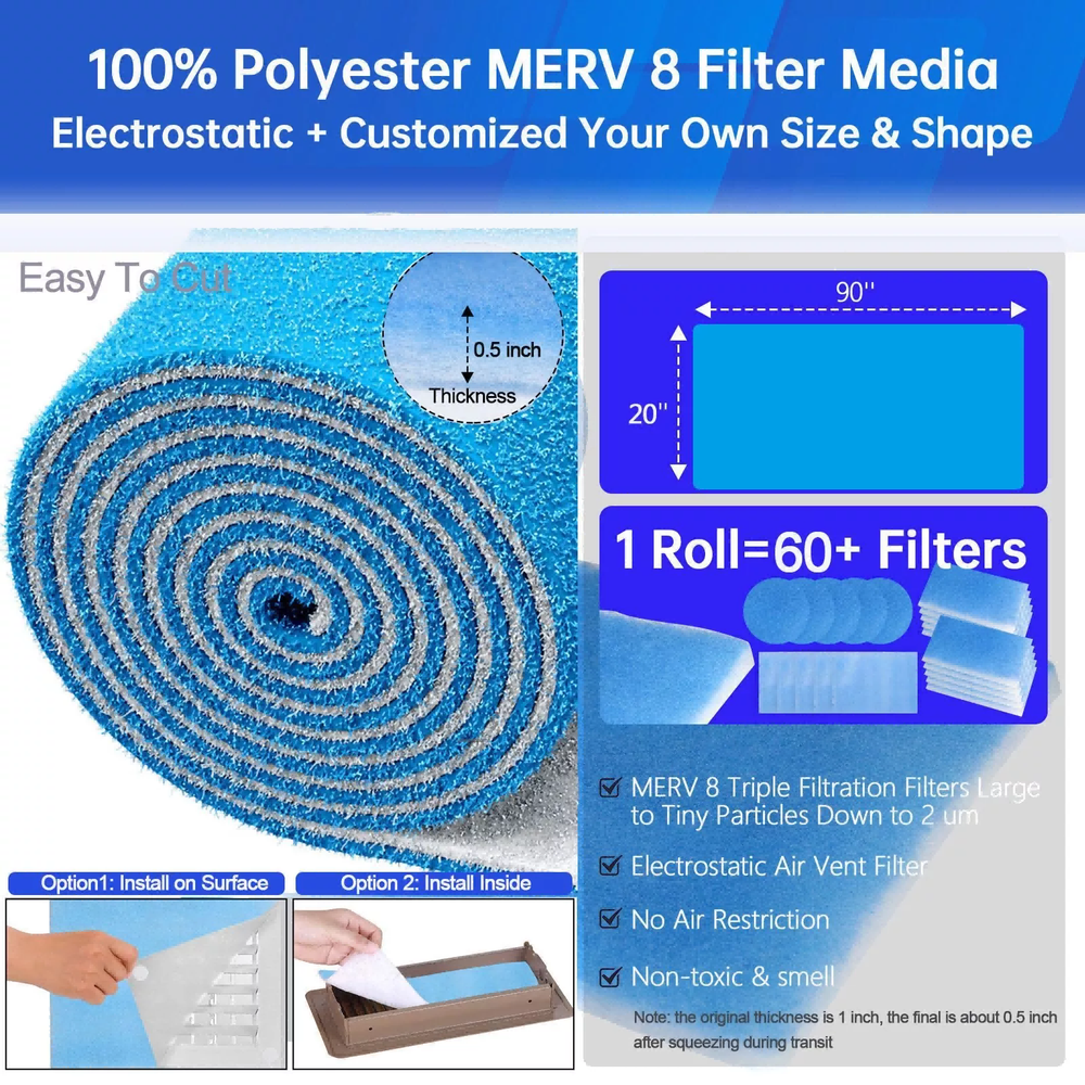 Item Description: ➣Material: 100% Polyester ➣Color: Blue & White ➣Item Length: 355CM = 140" ≈ 12Feet ➣Item Width: 30CM = 12" ➣Item Thickness: 0.5" = 500MIL = 12MM ➣Item Size: 140" x 12" =11.4Sqft Included Components: 1PCS Air Vent Filters Kit Features: 【High quality】 Maitisouth Your Best Online Business Partner Dust Reducing Air Vent Filters 12"x12' (Register Vent Filters) 1 Pack of 11Sqft Item Description: ➣ Material: 100% Polyester ➣ Color: Blue & White ➣ Item Length: 355CM = 140" ≈ 12Feet ➣ Item Width: 30CM = 12" ➣ Item Thickness: 0.5" = 500MIL = 12MM ➣ Item Size: 140" x 12" =11.4Sqft Included Components: 1PCS Air Vent Filters Kit Features: 【High quality】 MADE FROM 100% NON-WOVEN POLYESTER: VERY LITTLE TO ZERO REDUCTION IN AIR FLOW! This series of filter is engineered from 100% non-woven blue and white polyester. Two distinctly different plies of media are utilized, each being more dense than the one preceding it.The progressively dense fiber orientation of each media layer enables the small micron size particles to depth load within the filter. Followed by a Non-toxic Adhesive Stage on the MERV 8 only for the final triple filtration stage 【Filter harmful substances in the air】 During the use of air conditioning, harmful substances such as dust, bacteria, viruses, pollen, etc. in the air will be sucked into the machine with the air. These substances not only affect people's health, but also accelerate the wear and tear of air conditioning equipment, reducing its service life. The air conditioning filter cotton can effectively filter these harmful substances, ensure air quality, and reduce harm to human health. 【Increase the service life of air conditioning】 If there is a large amount of dust accumulation inside the air conditioner, it will affect the heat dissipation effect of the equipment, cause the machine to heat up, and greatly reduce its service life. The air conditioner filter cotton can filter out a large amount of dust in the indoor air, avoiding the accumulation of dust that affects equipment heat dissipation and ensuring the normal service life of the air conditioner. In addition, regularly replacing the filter cotton of the air conditioning filter can also avoid pipeline blockage and ensure the normal operation of the air conditioning equipment. 【Protecting indoor environmental hygiene】 Air conditioning filter cotton can filter out harmful substances such as bacteria, viruses, and pollen indoors, purify indoor air, and protect the health of family members, especially for people with respiratory and allergic diseases. 【Save Time Cleaning】 Save money by not having to clean your air ducts!BREATH CLEANER AIR EVERY DAY!Replace Furnace Filters less often by using this as a superior pre-filter air vent filter, return vent filter, air duct filter, heating vent filter, RV air filter or Dryer Filter Replacement for Indoor Dryer Vents. 【Easy and Fast DIY Installation】 To install remove the vent deflector and any air vent cover. Grab the vent register from the floor and pull up.Flip the vent register over and insert the filter between the grates and the vent. Reinstall the floor vent register with air filter and replace the air deflector. Application: 【Optimal Choice for Your Aquarium】 : If you want to keep your tank or pond crystal clean, our dual density filter pad is what you need! Thick, versatile and filtration-efficient, this aquarium floss pad keeps the tank clean and smoothly running! 【Excellent Filtration】 : Our filter pads for aquariums and ponds feature a 1-inch thick bonded structure that provides excellent filtration, capturing all impurities, dirt, uneaten food, debris and residues and ensuring clean water. 【Washable and Reusable】 : filter floss is made with superior quality materials that ensure safe, reliable use! These filter floss rolls are also washable and can be reused countless times. 【Wide Range of Uses】 : This filter media for aquariums is suitable for wet/dry filters, indoor and outdoor ponds, as well as any freshwater and saltwater aquariums. 【USA Superior Quality】 : aquarium media filter floss rolls are with high-grade materials to help create a safe, clean environment for aquatic pets. The floss rolls measure 12 inches X 140 inches and come in various sizes that can be cut to fit in. Installation Tips: ➣ 1. Clean register or vent to be filtered. ➣ 2. Measure the inside or outside vent opening that is to be filtered. ➣ 3. Measure the filter media, transfer dimensions to the filter using a pen or pencil. ➣ 4. Cut the filter to size. ➣ 5. Cut pieces of adhesive hook tape and adhere to the vent (if needed). ➣ 6. Insert the filter So that the air flows over the white side of the filter first. Note: ➣ Please allow 1-2cm differs due to manual measurement ➣ As different computers display colors differently, the color of the actual item may vary slightly from the above Wish you have a good shopping time~ Item Specifics Brand MODIGT Type Filter Cartridge Application 1 Air Conditioner,Furnace ,Wet/Dry Systems,Sumps. Application 2 Fish Tanks, Aquariums, Fish Ponds, AC vents,Filters. Application 3 HVAC, Ceiling fan, Floor Vent, AC/RV Vent, Ceiling Vent Number in Pack 1 Water Type All Water Types Color Blue & White Material Polyester Features 1 Easy to installation and cut, Diy to use Features 2 MERV 8 Triple Filtration, 85% Capture Rate, Item Size 140" x 12" =11.4Sqft Item Length 355CM = 140" ≈ 12Feet Item Width 30CM = 12" Item Weight 189g Item Thickness 1/2 inch Fitment Type Direct Replacement Payment ✎1. It will be much appreciated that you finish your payment asap or it will make UPI (unpaid item case) on your account leading to be suspended or restricted by eBay when those UPI cases carry over to certain amount. ✎2. Any problems please contact us for more details. Shipping ✌1. All items will be shipped to buyer's ebay address. ✌2. All items will be shipped within 24
