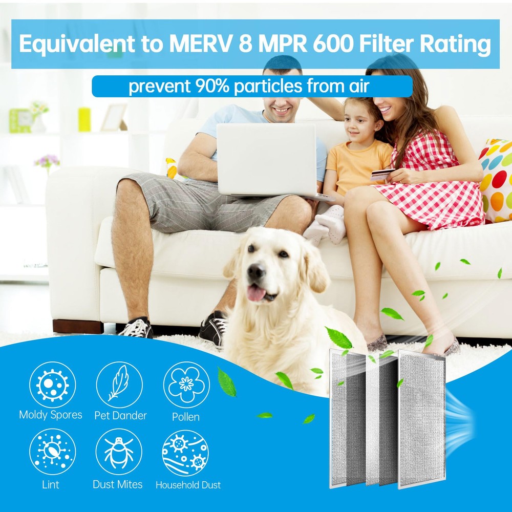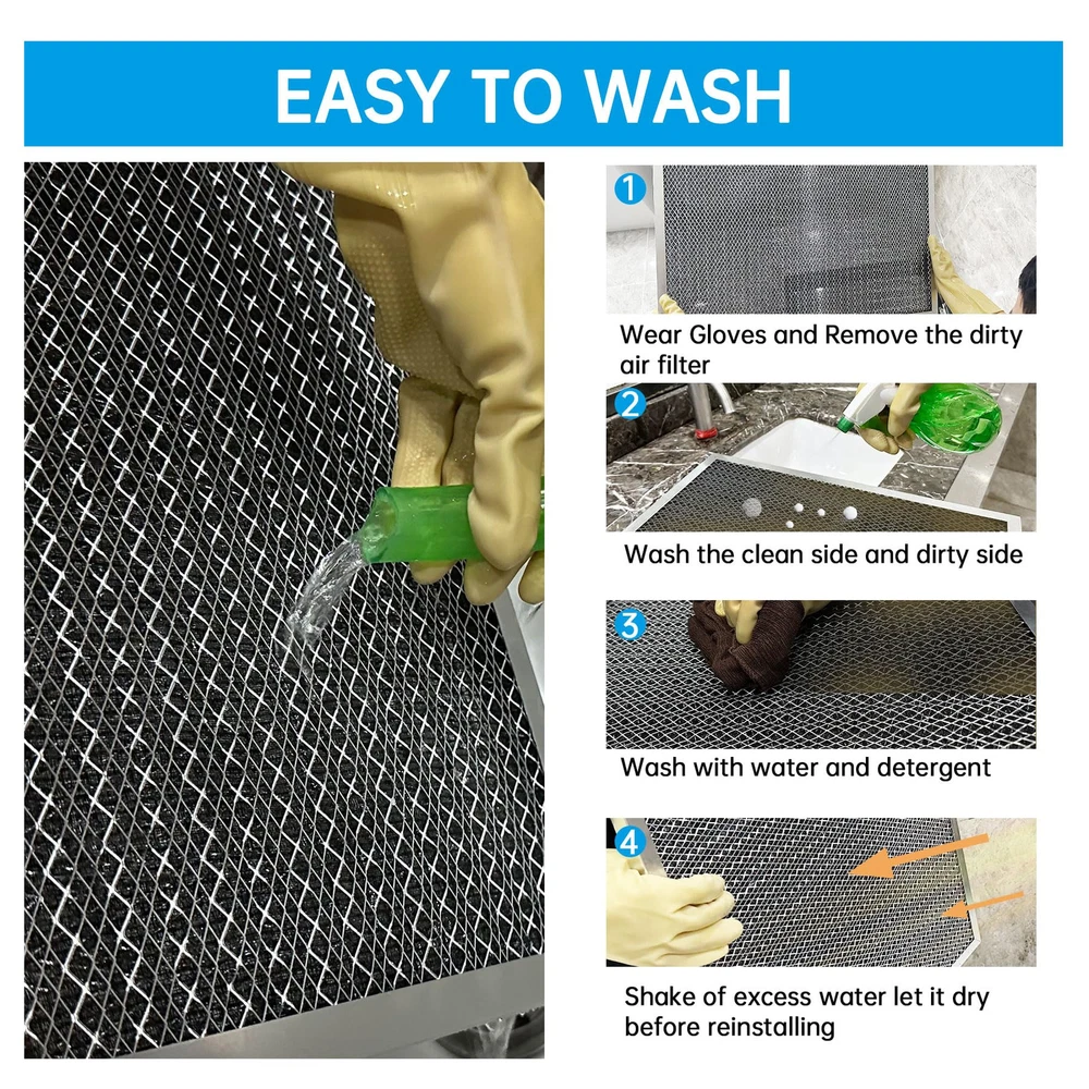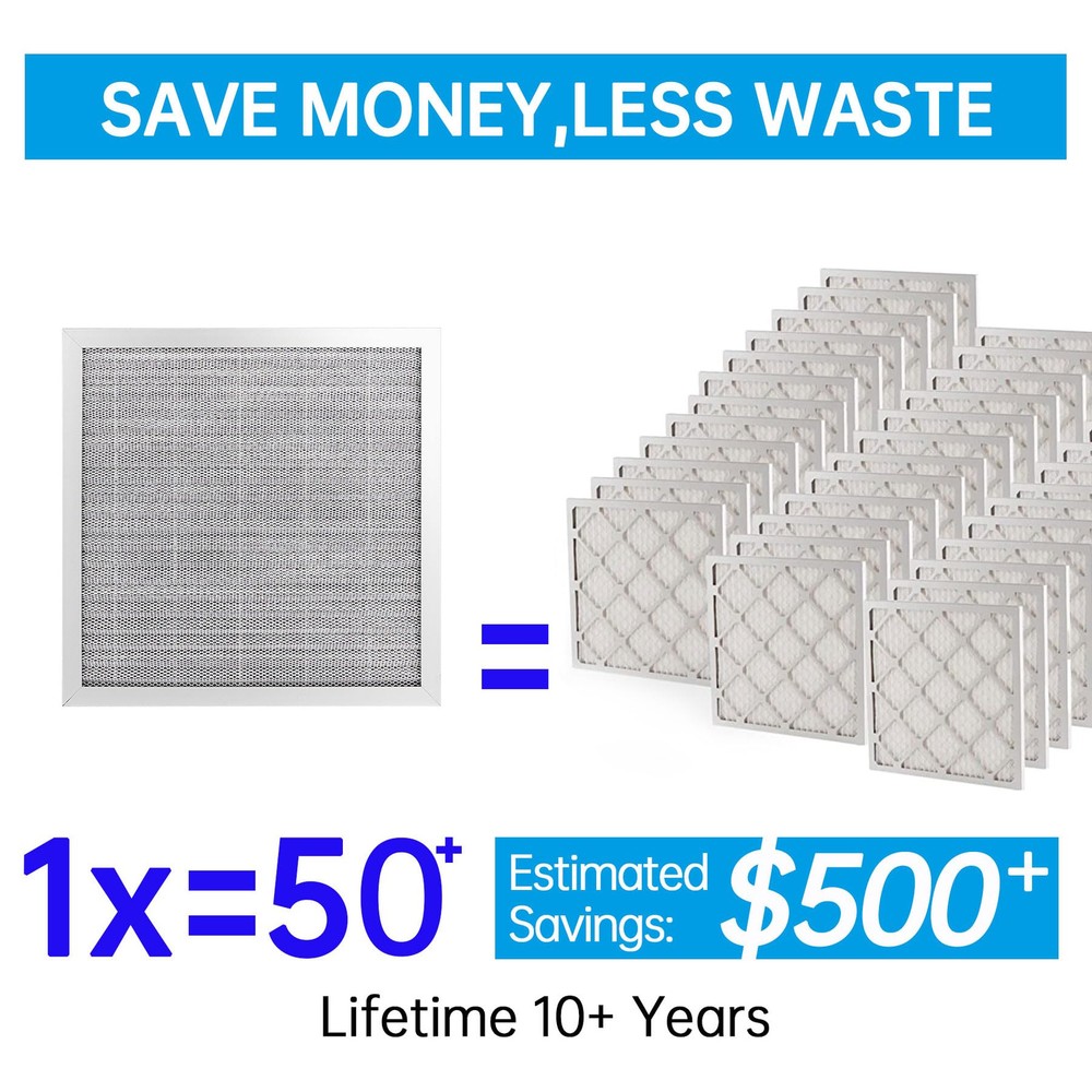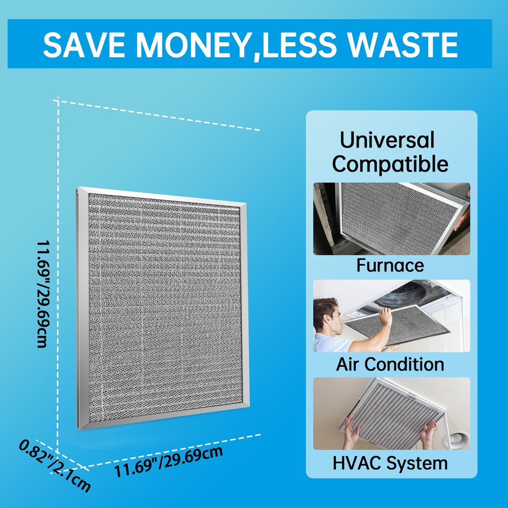 12x12x1 Electrostatic Air Filter HVAC AC Furnace Filter,8,Reusable Washable, Lasts a ,Permanent Air Filter,Breathe Fresher,Home And Office(Actual Size:11.69x11.69x0.86 Inch) Durable and Long-lasting:The Electrostatic Air Filter is built to last. Made with an aluminum frame, it can withstand strong winds without deforming or breaking. This means you won't have to replace your air filter as frequently, saving you time and money in the long run Improved Air Quality:With its pleated layers, the air filter is more efficient at capturing particles than other filters on the market. It can absorb up to 90% of dust, pollen, pet hair, and other particles, making the air in your home cleaner and healthier to breathe. Plus, its 8 level ensures that it meets industry standards for air filtration Easy to Install and Maintain:Installing the air filter is a breeze. Simply place it in the slot of your furnace, HVAC, or AC system. And when it's time to clean it, just wash it with water and a little detergent. The filter dries naturally and can be re-installed. We recommend cleaning it every 3 months and using gloves (not included) to change Waste Less And Friendly:The air filter is reusable, which means you won't have to constantly replace it like disposable filters. This not only saves you money, but it also reduces waste and helps protect the environment. Plus, its washable design means you won't have to worry about disposing of it properly Versatile Compatibility:The air filter is with a wide range of furnace, HVAC, and AC systems. This means you won't have to worry about finding a specific filter for your system. Plus, its universal design makes it easy to install and maintain, no matter what type of system you have