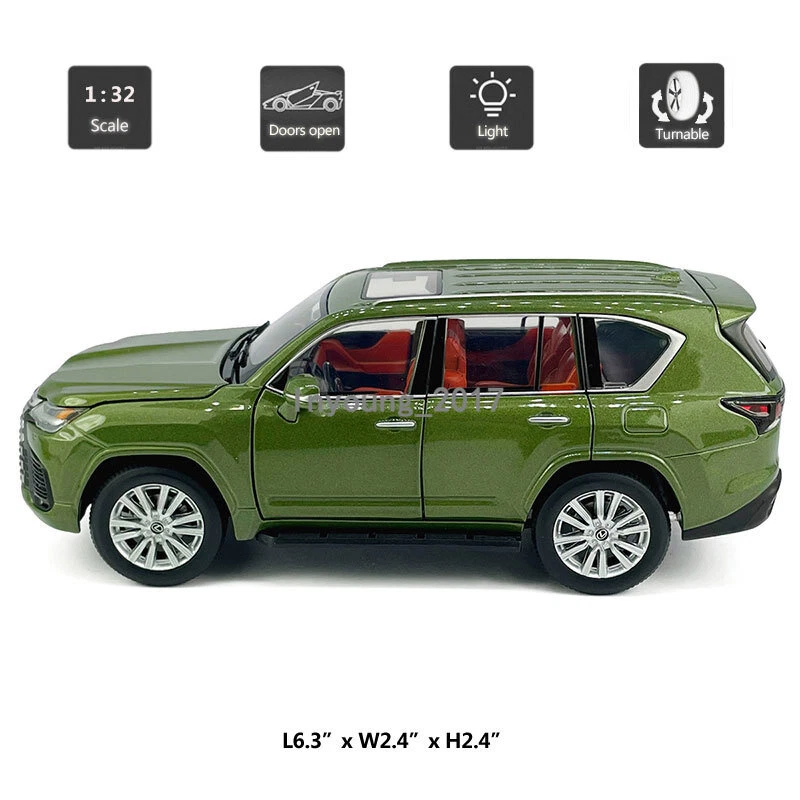 1:32 2022 LX600 SUV Diecast Model Car Metal Toy Cars Toys for Boys Kids Gifts Item Type Diecast & Toy Vehicles Scale 1:32 Material Diecast and ABS Color White, black and green Dimension About L6.3" x W2.4" x H2.4" (L16.0 x W6.0 x H6.0 cm) Vehicle Type SUV Vehicle Year 2022 Function *No pull-back function, can be push forward and backward *The front two wheels can turn left and right *Four doors, engine cover and trunk lid can be open *Turn on the button under the car, it will make light Packing Packed in original color box, in excellent condition Power 2 x AG13/LR44 button cell, power is just for light Tips *Great choice of gift for kids, especially for Birthday, Christmas and New Year Gift *Great item for collector, business gift, home decoration, office decoration, display Warning Don't put in mouth/Keep Away from Fire/Not for Children under 3 Years Notice Due to manual measurement, please allow a little error Package include 1 x 1:32 Scale LX600 Model Car (Batteries Not Included) Payment Delivery details Terms of sales Payment We accept paypal only. Delivery details We ship orders within 24 hours upon receipt of payment. Terms of sales We provide great products and service. If you have any problems with the order,please do contact us before leaving negative feedback and opening case on eBay.