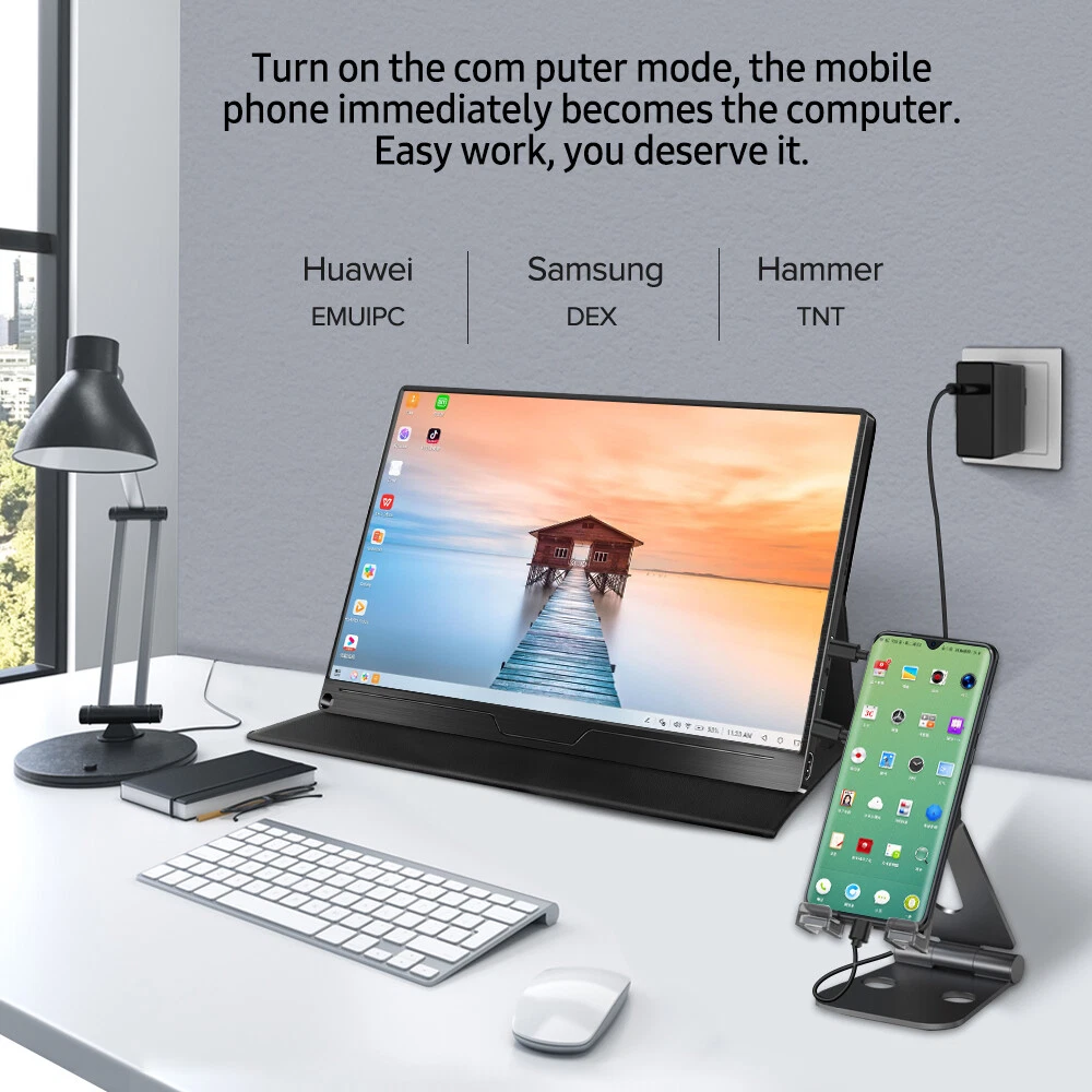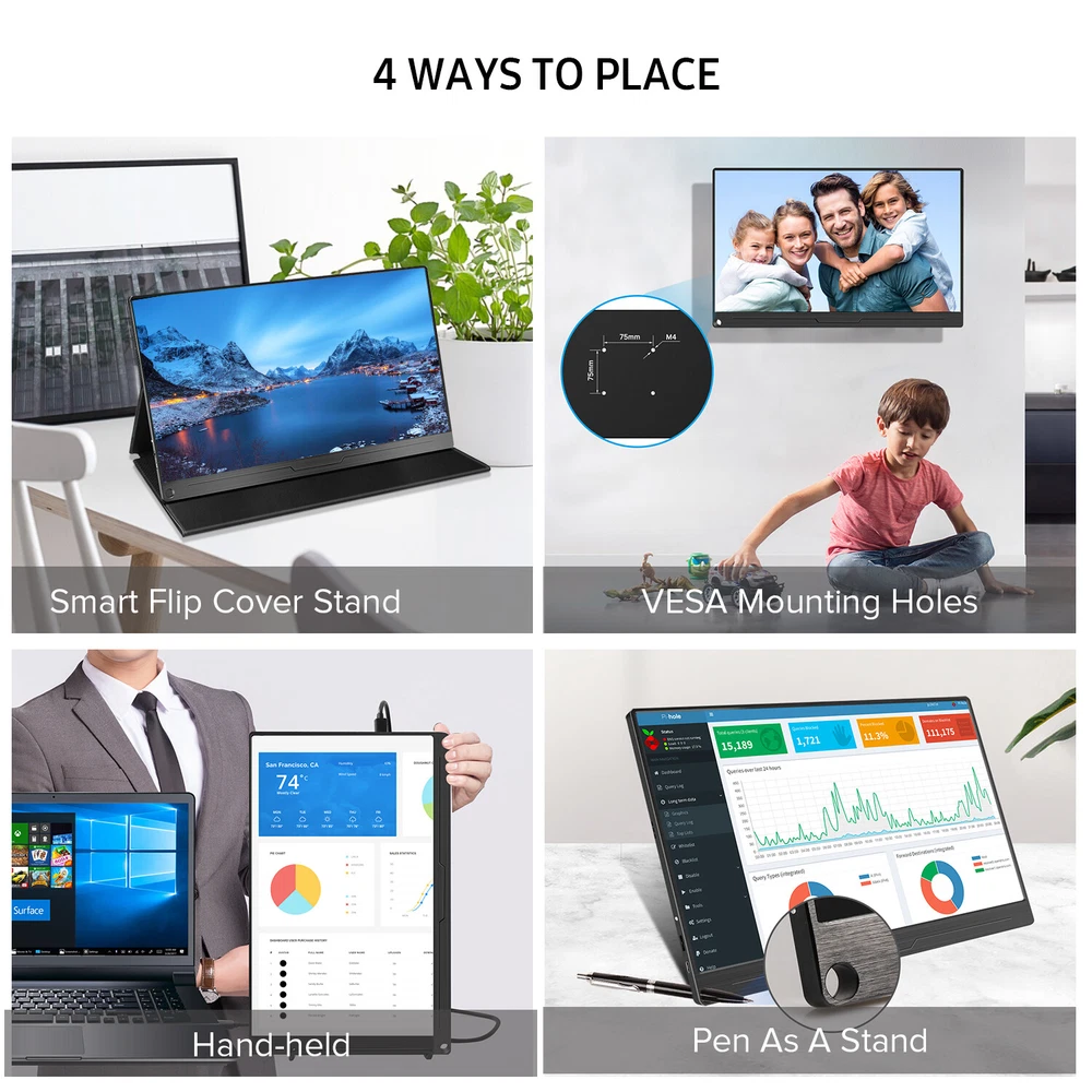 17.3" Portable Monitor USB-C 1080P 144Hz VESA For Computer Laptop Work From Home Features 【Advanced HDR 72% sRGB Gaming Screen】The portable game monitor delivers a vivid image and truly immersive viewing experience with stunning 1920 x 1080 resolution visuals & awesome color reproduction. Clear motion and detail with built-in FreeSync and HDR feature, 72% NTSC color gamut, 16.7M colors, 178° viewing angle, 60Hz refresh rate, and fast response speed. Eye Care tech minimizes blue light to reduce eye strain. 【Single Type-C Connect to Signal & Power】The USB C portable monitor features an innovative hybrid-signal solution with an integrated 3-in-1 function Type-C interface for simultaneous power, signal transmission, and USB interface functions. Note: The below Type C port is for Power & Display and the top Type C port is only for Power. 【Upgraded Configuration & Eye Care】Built-in dual stereo speaker delivers loud and immersive 360-degree sound with deep and accurate bass; Flicker-free backlighting and blue light filter minimize eye fatigue. 【Versatile Digital Connection】Portable screen with HDMI, Type-C, Mini DP, OTG, and PD port makes it easy to connect with Laptops, PCs, Phones, Gaming Devices, or Mouse and keyboard, great ideal for extending your screen or playing games on a business trip, travel, or home entertainment. 【Smart Cover】The Smart Cover is made of a durable PU leather exterior, and a soft lining to keep your monitor safe. Please feel free to contact us if there are any missing accessories. (We have 2 kinds of smart covers, they will be shipped out randomly between different batches. If you have questions, please feel free to contact us!) 17.3-inch Portable Monitor, New View, Show You! VESA Mountable, Two Modes to Place Anywhere You Want! FHD 1080P+HDR It delivers stunning FHD 1920*1080 resolution visuals with awesome color reproduction. Equip with LCD HDR screen to ensure the monitor fully enjoys zero distortion and sharp image quality. Smart Cover The smart case is made of PU magnetic material to protect your device from dust, impact, and scratches. It can also be folded into a stand for easy use, providing you with a convenient way to use it. Dual 2W Speakers Not only the best display but also a top-level audio experience. Adopts customized 2W long lifetime dual stereo speakers produce huge immersive 360-degree sound with deep and accurate bass. 178° Full Viewing Angle Expansive 178° viewing angles, Zero distortion, sharp image quality, and low blue light for eye care. If you have heavy workloads online and need to switch between different web pages, it is a great help to improve your efficiency. Portable Gaming Monitor For video gamers, this monitor is the best choice for playing PS3, PS4, XBOX ONE, Nintendo Switch, or other systems with USB-C or HDMI output. Full HD 1080P and dual stereo speakers offer you a fantastic and high-definition gaming experience. Extend your Type C Phone This external monitor is compatible with mobile phones that have a full-featured Type-C port. Only through a Type-C cable (included), you can extend your phone screen to a 17.3" large screen of high permanence. Note: For iPhone, you need an adapter. Multiple Ports to Connect Freely! Your Best Business Sharing Screen Partner! Package Included 1x 17.3'' Portable Monitor 1x Standard HDMI cable 1x USB to Type-C cable 1x Type-C to Type-C cable 1x Power Adapter 1x Folding Leather Cover Stand 1x User Manual