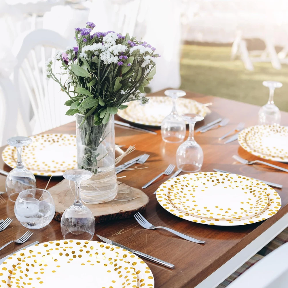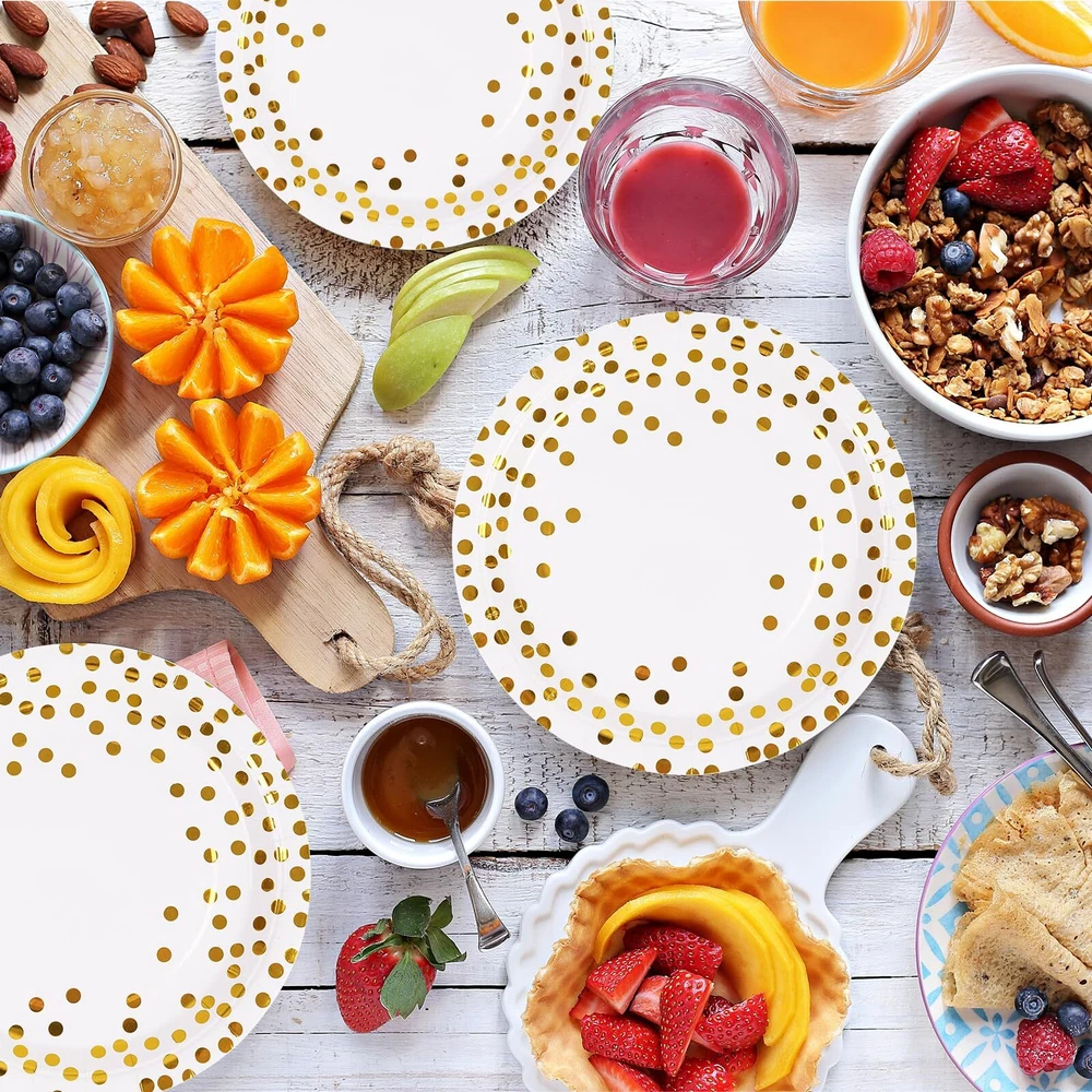 🎉EXQUISITE BIRTHDAY PARTY TABLEWARE SET:This white gold birthday party supplies set for up to 25 guests. Includes 25pcs 9 inch paper dinner plates, 25pcs 7 inch dessert plates, 25pcs Napkins, and 25 sets of utensils (knives, forks, spoons) for a total of 175 pieces.Enough to meet your party needs, it's a great choice for your party tableware! 🎉CLASSIC GOLD FOIL POLKA DOT DESIGN:Our white and gold dot party paper plates,napkins and cups are decorated with gold polka dots. Very stylish and beautiful with gorgeous and charming colors. Your guests will love this elegant and premium design. 🎉HIGH QUALITY MATERIALS:Our white and gold dot paper plates are made of 350gsm thickened eco-friendly paper, not easy to break or tear, durable, safe and non-, bpa free biodegradable, convenient and environmentally friendly, no need to worry about harming the environment. These napkins and cups are made of food water-based ink, highly absorbent and very skin-friendly.Knives, forks and spoons are made of high quality plastic, not easy to bend or break. 🎉SAVE TIME AND ENJOY THE PARTY:All party tableware is disposable.This gold dot disposable party dinnerware set can be thrown away after use for easy cleanup after the party, so you don't need to worry about cleanup and environmental issues! Gives you and your guests more time to enjoy the party! 🎉SUITABLE FOR ALL OCCASIONS:This disposable party tableware set is suitable for any occasions, including weddings, engagement parties, birthday parties, children's parties, anniversaries, baby shower, banquets, reunions, business meetings, graduation parties, family dinners, holiday gatherings and other occasions.