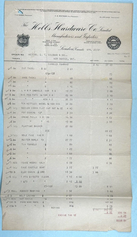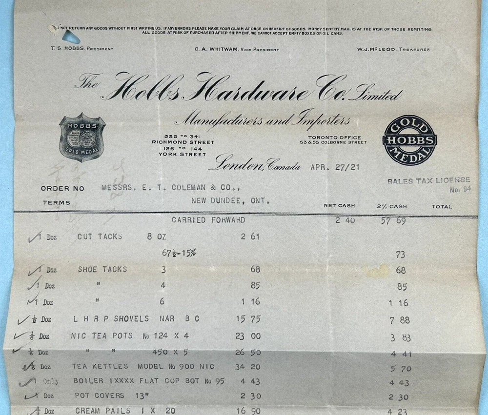 1921 Invoice for various hardware items and home goods, from The Hobbs Hardware Co. London Ontario Canada.
