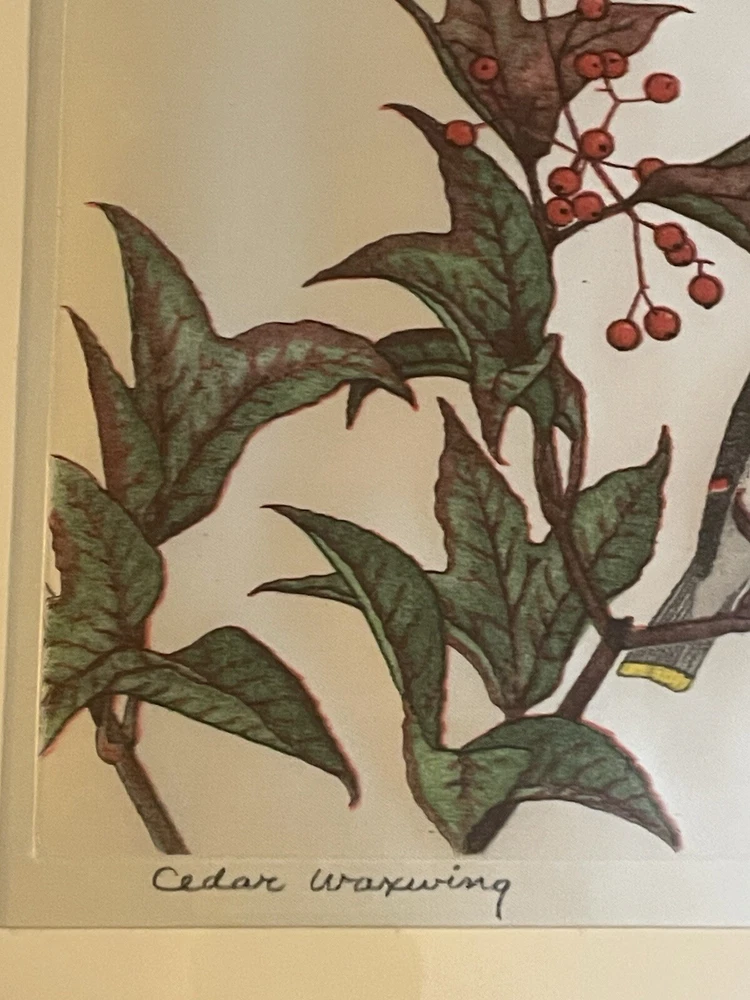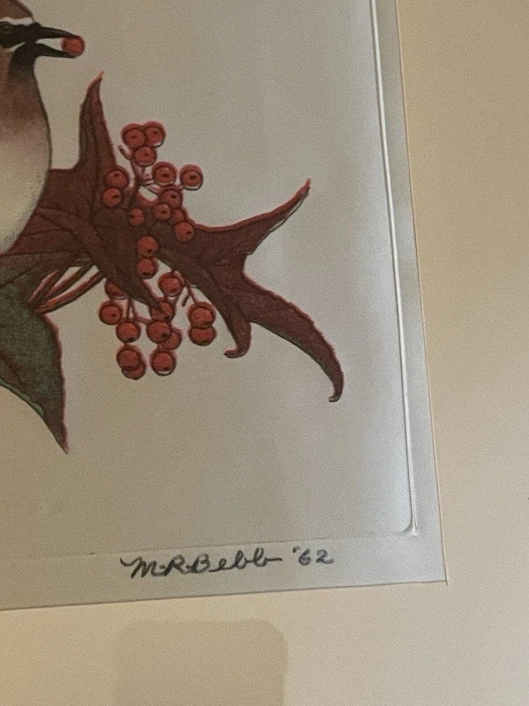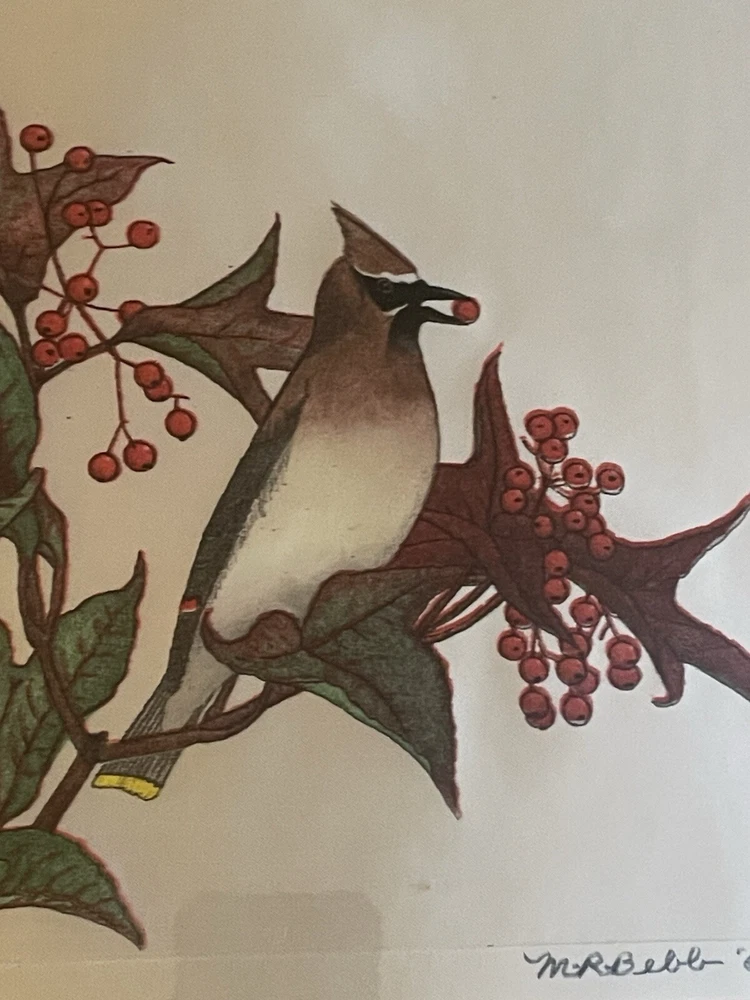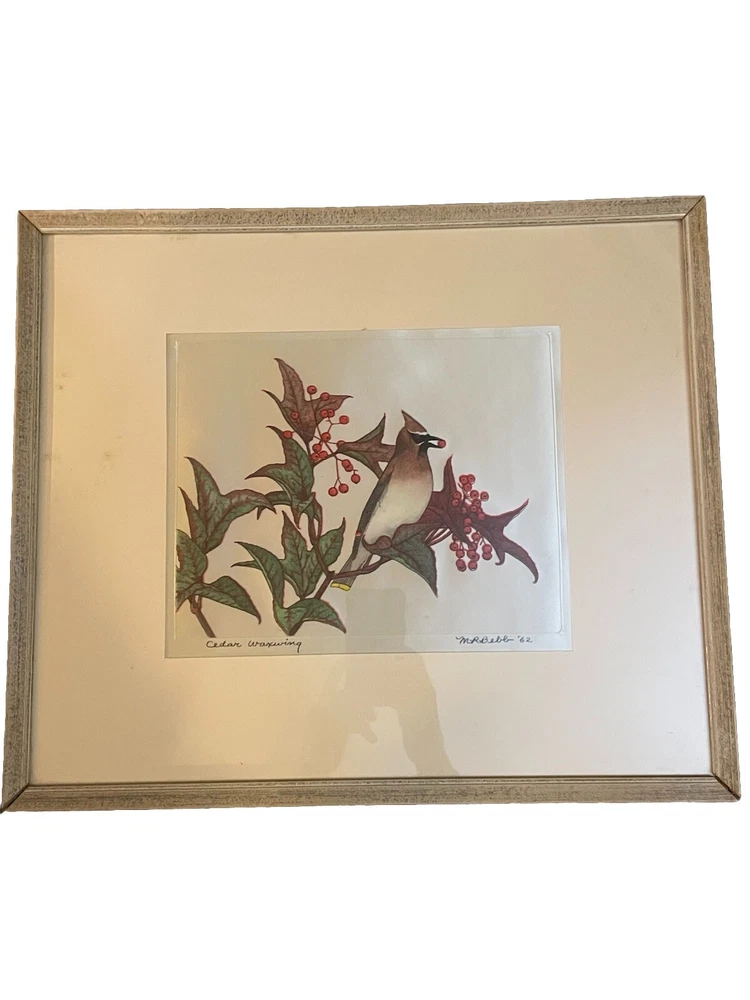 1962 Aquatint By Maurice R. Bebb (1891-1986), Cedar Waxwing, On Satin, Signed. Mat has 3 small blemishes (see photo). “Maurice Bebb had a career as a florist, and did not begin to draw until he was in his 50's. Self taught, he received encouragement from established artist-members of the Prairie Print Makers, an organization Bebb later joined. His fascination and knowledge of the mid-western birds he portrayed are realized with consummate skill in the difficult medium of color aquatint. Here he portrays a Cedar Waxwing plucking bright red serviceberries to eat. The cream colored satin "flashes" as one walks by the print.”