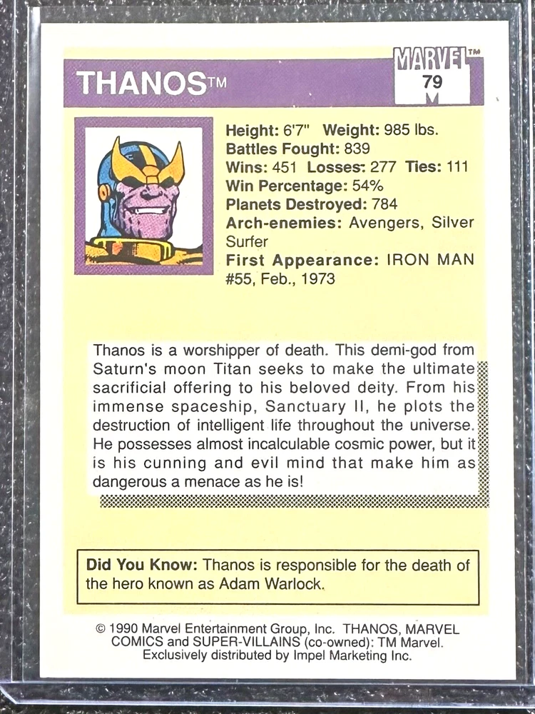 Manufacturer: Impel Type: Non-Sport Trading Card Set: 1990 Marvel Universe I Card Number: 79 Language: English Features: Base Set Franchise: Marvel (MCU) Vintage: Yes Country/Region of Manufacture: United States Year Manufactured: 1990 Original/Licensed Reprint: Original Character: Thanos