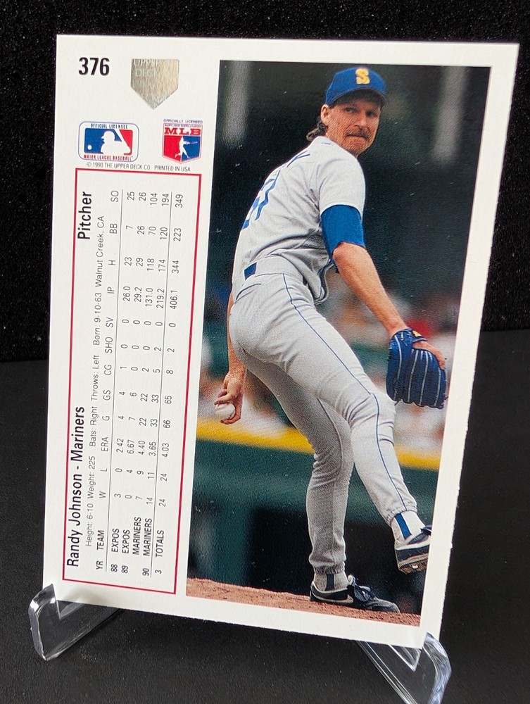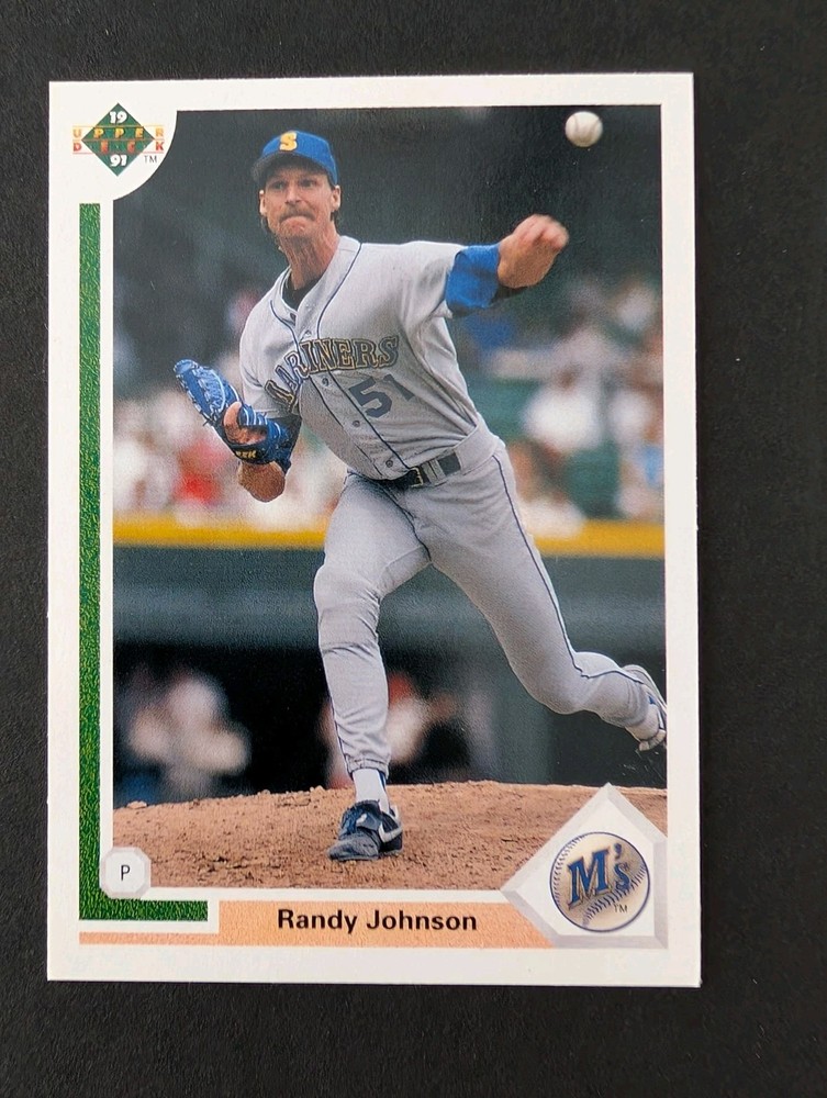 League: MLB Card Name: Randy Johnson Card Size: Standard Year Manufactured: 1991 Manufacturer: Upper Deck Parallel/Variety: None Team: Seattle Mariners Autographed: No Material: Card Stock Signed By: None Card Number: 376 Features: Base Set Season: 1991 Set: Upper Deck Sport: Baseball Card Condition: Near mint or better Vintage: Yes Player/Athlete: Randy Johnson Type: Sports Trading Card