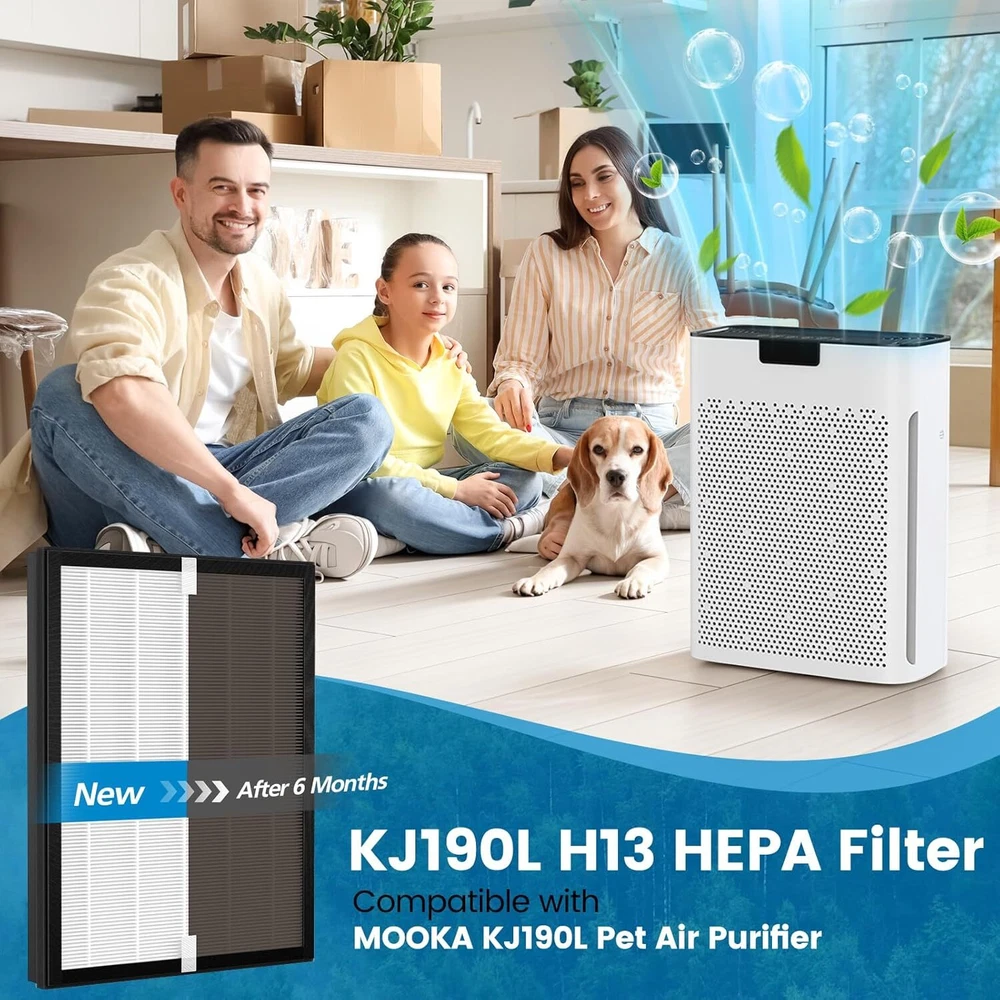 2 Pack KJ190L Filter Replacement Compatible with MOOKA KJ190L Air Purifier For Home Large Room 2000 Ft², 2 H13 HEPA Filters and 4 Washable Pre-Filters Pet Air Purifier Filters for Bedroom Product Details Brand Name: iSingo Model Info: KJ190L Item Weight: 3.16 pounds Product Dimensions: 13.4 x 1.18 x 10.6 inches Item model number: KJ190L Part Number: iSingo Compatible Device: Compatible with Mooka KJ190L Air Purifier Material Type: 2 H13 HEPA Filters and 4 Washable Pre-Filters Included Components: 2 Pack H13 HEPA and 4 Pack Washable Pre-Filters (2+4) Batteries Included?: No Batteries Required?: No Brand: iSingo Material: 2 H13 HEPA Filters and 4 Washable Pre-Filters Product Dimensions: 13.4"L x 1.18"W x 10.6"Th Compatible Devices: Compatible with Mooka KJ190L Air Purifier Number of Items: 1 Manufacturer: iSingo Product Grade: new Unit Count: 2.0 Count 【3-STAGE ADVANCED FILTRATION SYSTEM】KJ190L H13 True HEPA filter for MOOKA KJ190L with 3-in-1 H13 True HEPA Filtration System ( ① Washable Pre-Filters ②H13 Grade True HEPA Filter ③Dual-action Activated Carbon / Gas / VOC Replacement Filter ) to filter 99.97% of air-borne particles down to 0.3 microns in size and adopt advanced lower energy consumption and lower density structure technology, with lower wind resistance, higher efficiency and less pressure to ensure maximum filtration to improve air quality in your living space and promote better health. 【SUPERIOR FILTRATION WITH H13 HEPA AND ACTIVATED CARBON】Our H13 HEPA filter is crafted from finely woven organic fibers, offering exceptional particle capture large adsorption capacity, and excellent high purification efficiency. It effectively filters particles as small as 0.3 microns. The upgraded activated carbon filter, with an increased number of activated carbon pellets, enhances the absorption of unpleasant odors such as pet smells, fumes, and VOCs, resulting in higher and more effective purification efficiency, which ensures energy saving and a longer service life. 【WASHABLE FILTER - EXTEND FILTER LIFE】The pre-filter of this KL190L filter features the latest washable design, allowing it to be cleaned with water or a vacuum cleaner. Regular cleaning of the pre-filter helps extend the lifespan of the H13 HEPA filter and the air purifier, enhancing cost-effectiveness and saving you money. Additionally, our filter is pet-friendly, utilizing medical-grade H13 True HEPA technology, specifically tailored for pollen, pet dander, and fur. It also includes special treatment for pollen and pet odors, promoting a harmonious coexistence between you and your pets.