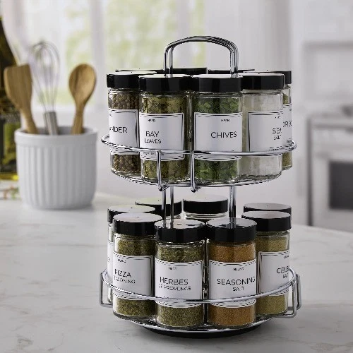 The Kamenstein 16-Jar Revolving Spice Rack includes 16 spice jars with removable sifter discs, and 1 revolving chrome wire spice rack organizer that complements your kitchen decor. Spices include Basil, Bay Leaves, Celery Salt, Chives, Coriander, Crushed Mint, Fennel Seed, Herbes De Provence, Italian Seasoning, Marjoram, Oregano, Parsley, Pizza Seasoning, Rosemary, Sea Salt, and Seasoning Salt (spices may vary). The rotating design keeps spices neat and easily accessible on countertops or in cabinets. Each jar features an easy-to-read label identifying the spice and a removable sifter cap to easily sprinkle, scoop, or pour your desired amount. The built-in handle provides easy transport around your home. Spice rack with spices included are Basil, Bay Leaves, Celery Salt, Chives, Coriander, Crushed Mint, Fennel Seed, Herbes De Provence, Italian Seasoning, Marjoram, Oregano, Parsley, Pizza Seasoning, Rosemary, Sea Salt, and Seasoning Salt (spices may vary) Rotating spice rack for cabinets and countertops keeps your spices neat and easily accessible Each glass jar features an easy-to-read label identifying the spice, and a removable sifter cap to easily sprinkle, scoop, or pour your desired amount Seasoning organizer measures 7.5 x 9.25 x 11in Features a built-in handle for easy transport around your kitchen and home Includes 5 years of free spice refills - simply follow instructions on the box to register your spice rack, and order refills when needed.
