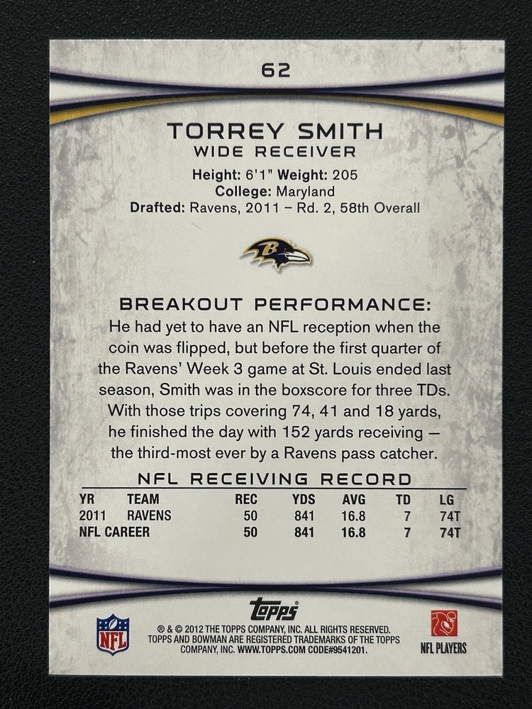 The product is a 2012 Bowman Torrey Smith trading card featuring the Baltimore Ravens wide receiver who played for the Maryland Terrapins. This original sports trading card is part of the 2012 Bowman set and is a base set card. It is a standard size card made of 20 Pt. card thickness and is manufactured by Bowman in the United States. The card is a valuable collectible for fans of the NFL, Maryland Terrapins, and Baltimore Ravens.