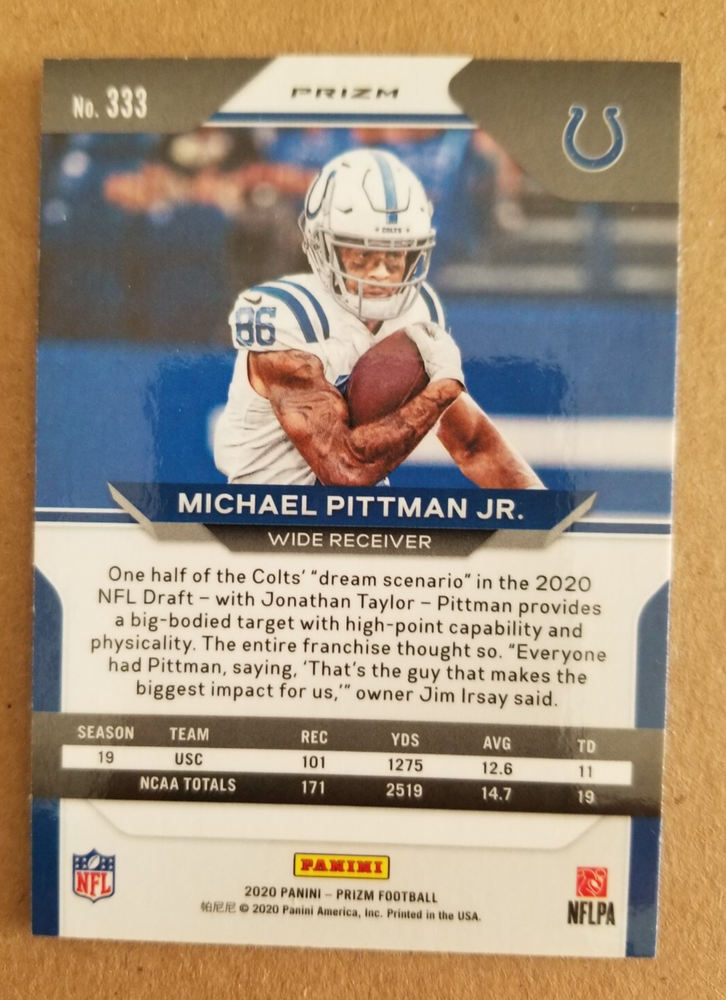 Card Name: Red White & Blue Prizm League: National Football League (NFL) Type: Sports Trading Card Card Condition: Near mint or better Sport: Football Features: Hologram, Parallel/Variety, Rookie Year Manufactured: 2020 Set: 2020 Panini Prizm Player/Athlete: Michael Pittman Jr. Manufacturer: Panini Season: 2020 Card Number: 333 Parallel/Variety: Red White & Blue Prizm Team: Indianapolis Colts
