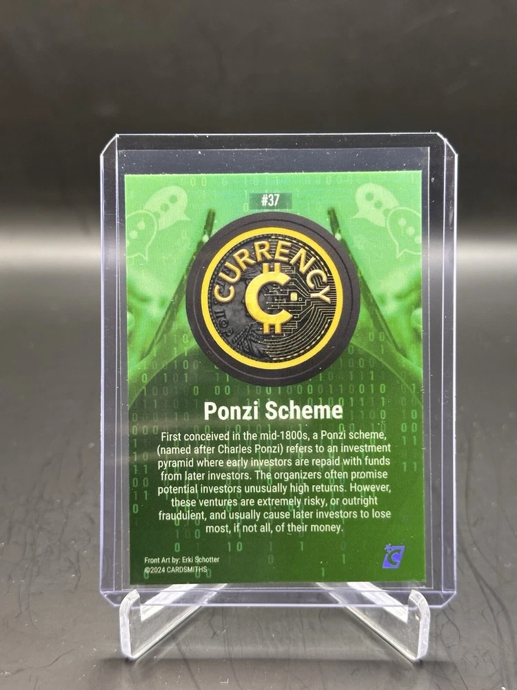This rare 2024 Cardsmiths Currency Series 3 #37 Ponzi Scheme Matrix Holo card is a must-have for any crypto enthusiast. Featuring a stunning hologram and exclusive design, this card is made of high-quality 20 Pt. card stock and is a part of the Series 3 insert set. The card is in standard size and has a parallel/variety of Matrix Holo. It is an original, non-sport trading card manufactured by Cardsmiths in the United States. The card is in English language and is suitable for ages 14+. The featured person/artist is Ponzi Scheme, and the card is a part of the Crypto franchise. This rare card is a perfect addition to any collection and is sure to impress. Card is in MINT condition and is ready for grading!