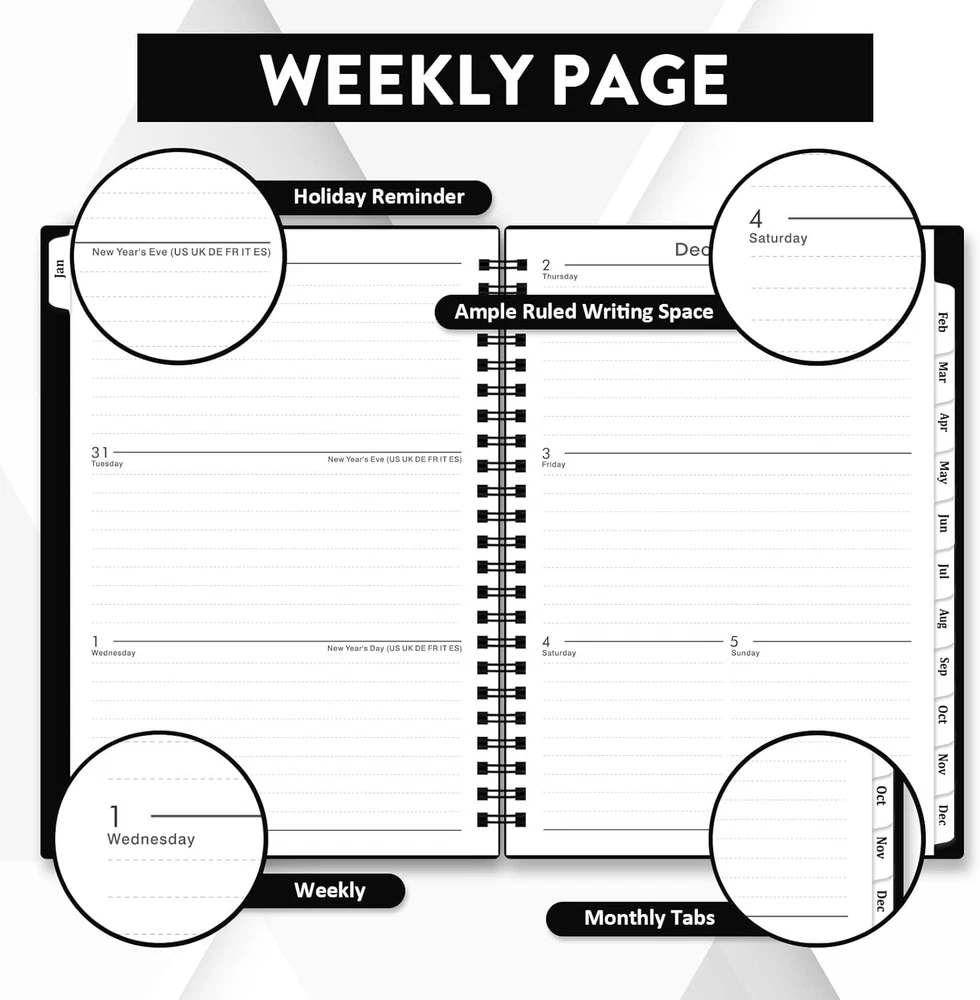 Sheet Size: A5 Cover Material: Paper Material Type: Paper, Metal Model Year: 2025 MPN: Does not apply Target Audience: Adult Additional Features: Flexible Cover, Twin-wire Binding Color: Black Recommended Uses For Product: Academic planning, daily, weekly, and monthly scheduling, noting Format: Day to Day Calendar UPC: 313108840844 Item Dimensions L x W x Thickness: 8.3"L x 6.25"W x 0.4"Th Item Dimensions L x W: 8.3"L x 6.25"W Binding: Office Product Brand: Does not apply Material: Paper, Metal Type: Does not apply gtin13: 313108840844 Calendar Type: Monthly, Weekly Year: 2025 Paper Size: A5