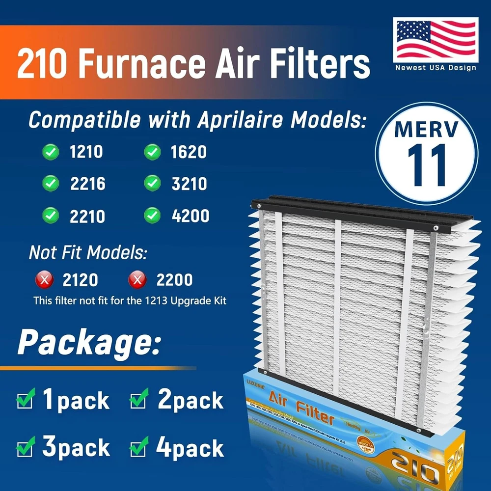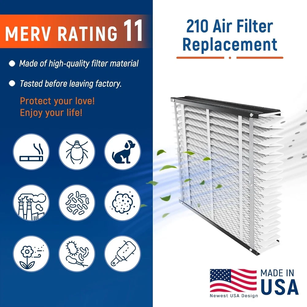 210 Replacement Air Filter MERV 11 Compatible with AprilAire Models 1210, 1620, 2210, 2216, 3210, 4200, 20x25x4 Furnace Filter, 210 Whole House Air Purifiers Replacement Filter - 1 Pack designed for AprilAire whole house air purifiers. With a MERV rating of 11, these filters have a filter life of 12 months and use self-seal technology. They are made with synthetic filter media and are suitable for air purification applications.
