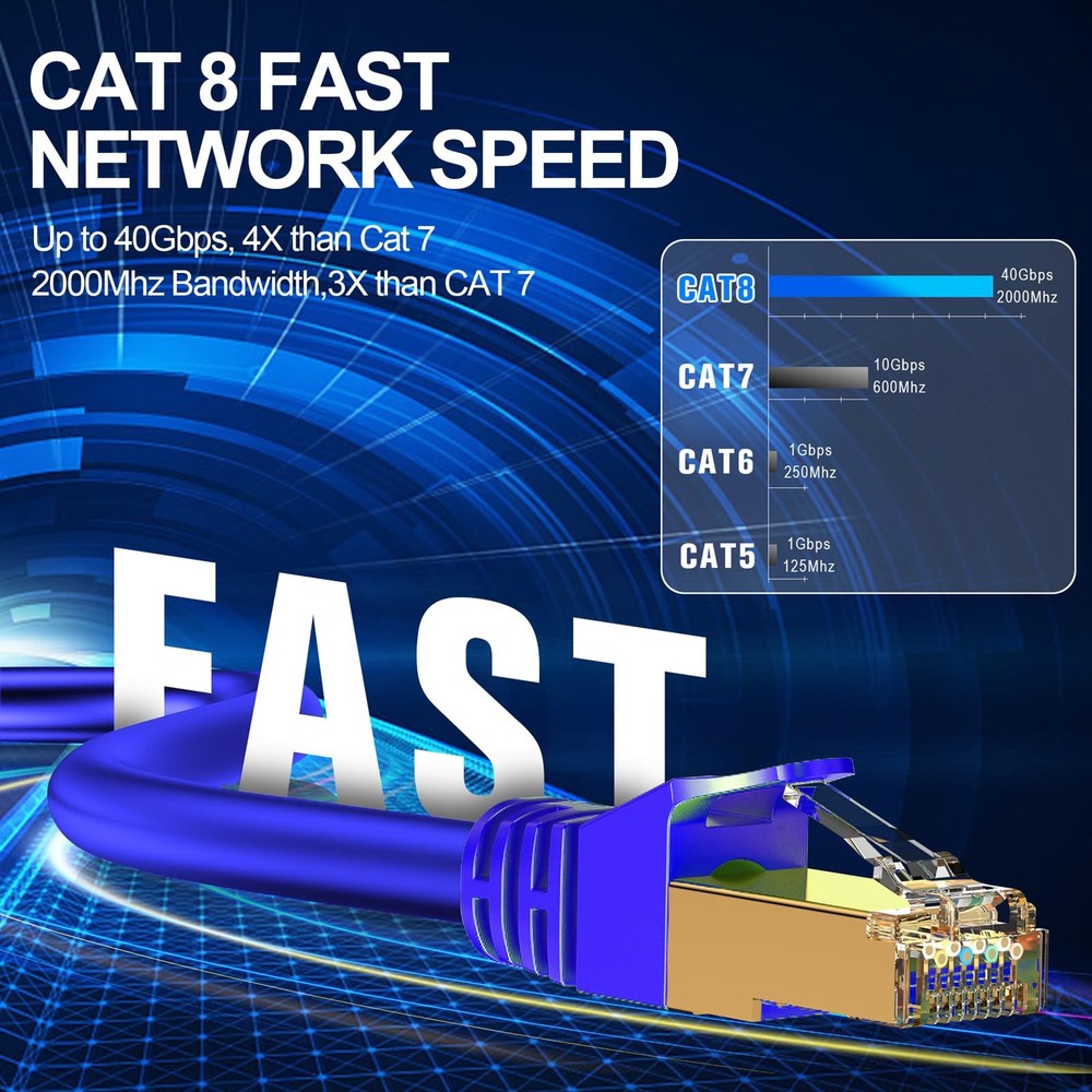 -Category 8 Blue Round Ethernet Cable, thicker core, high speed transmission, can be used in office home internet cafe as well as computer room. Network Patch Cords - Choose High Speed: Cat 8 Ethernet cable with 300FT high bandwidth up to 2000MHz and 40Gbps ensures high speed data transmission stability and faster LAN. Wide Compatibility: Cat8 Ethernet cable adopts gold-plated RJ45 connectors, which is perfectly compatible with routers, modems, switches, PCs, laptops, PS5, PS4, PS3, X-Box 360, X-Box One, couplers, hubs, Keystone outlets, Smart TVs, Imacs, etc. It is also backward compatible with Cat6, Cat5e, Cat5 SFTP Superior Interference Resistance: Cat 8 cables are constructed with 4 pairs of bare copper wires and SFTP (Shielded Twisted Pair) shielding to provide optimal protection against EMI/RFI (Electromagnetic Interference) and to reduce AXT (Crosstalk) for high fidelity, long distance data transmission, increasing the security and reliability of data transmission. Durable and Flexible PVC Jacket: The Cat8 cable is made of environmentally friendly PVC with a thick outer layer, which protects the inner core from damage and is resistant to abrasion and bending; the soft taps help us to insert it more easily without force. Available Lengths: Cat 8 cable is available in different lengths to meet your needs. 3ft/6ft/10ft/15ft/25ft/50ft/75ft/100ft/200ft available. 24 hours customer service. If there is any problem, please feel free to contact us, we will solve it for you as soon as possible.