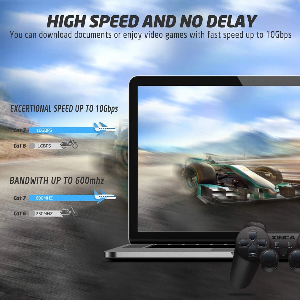 Thin and Flexible Only 0.1 inch thick, the cables fit easily in any cramped space. The slim profile is ideal for network rack wiring since it can leave plenty of ventilation space. The flat design is a great advantage. Fast and High Performance Designed for use with 10 Gigabit Ethernet, provides performance up to 600MHz, 10Gbps. Our cat 7 cables achieve higher performance than cat6e, cat6 or traditional cat5e, cat5, boost your online gaming experience. Interference Elimination Each of the four twisted pair sets is shielded by foil, and the patch cable is terminated with two shielded copper plated RJ45 connectors. Multi-protection mechanism significantly improves noise resistance and interference elimination. Designed for All Networking Applications Designed for Network Adapters, Hubs, Switches, Routers, DSL/Cable Modems, Playstation, Xbox, Patch Panels and other Computer Networking applications. Utilize your internet at superior speed, without the clutter of bulky wiring. Product Features: 600MHz speed 10 Gbps data transfer rate Double Shielded 50 Micron Gold Shielded RJ45 Connectors & Contact Pins Compatible with all CAT5, CAT5e, CAT6, CAT6a applications Compatible with 10BASE-T, 100BASE-TX, 1000BASE-T, 10GBASE-T Compliant with ANSI/TIA/EIA 568-B, 2-1 NOTE: Your network speed is determined by many factors, including the cable, your modem, router, other network components, and Internet Service Provider (ISP). Package Contents: 1 x Cat 7 Patch Cable 1 x Package of Sticky Cable Clips WARRANTY Lifetime guarantee for replacement or full refund! Lifetime Technical Support. ★ HIGH SPEED - Cat7 Ethernet cables support to 1000MHz and transmit speeds of up to 10Gbps, connect to LAN/WAN segments and networking gear at maximum speeds. ★ FLEXIBILITY - Flat Ethernet cables transmit flexibly under the carpet or on the smooth flat. With the cable clip to stick the Ethernet cable to the wall, which will protect the wall from being damaged. ★ RANGE OF APPLICATION - Cat7 flat ethernet cable perfect for the home server, Xbox, PS4, HDTV, RoKu, and switch.Cat7 Ethernet cables are compatible with Cat5, Cat5e Cat6, and Cat6A Ethernet cables. ★ SHIELDED TWISTED PAIR (STP) COPPER WIRES WITH TWO RJ45 CONNECTORS ON EACH END - Shielded wires are protected with 50 Micron gold plated contact pins which provide better protection from crosstalk, noise, and interference. ★ 90 Days WARRANTY: 90 Days Warranty. We have confidence in our products, so don't hesitate to e-mail us for 24x7days customer service. Thank you!