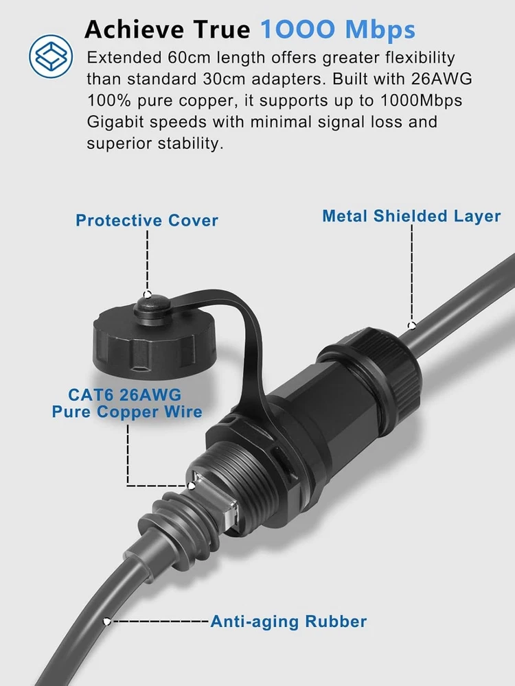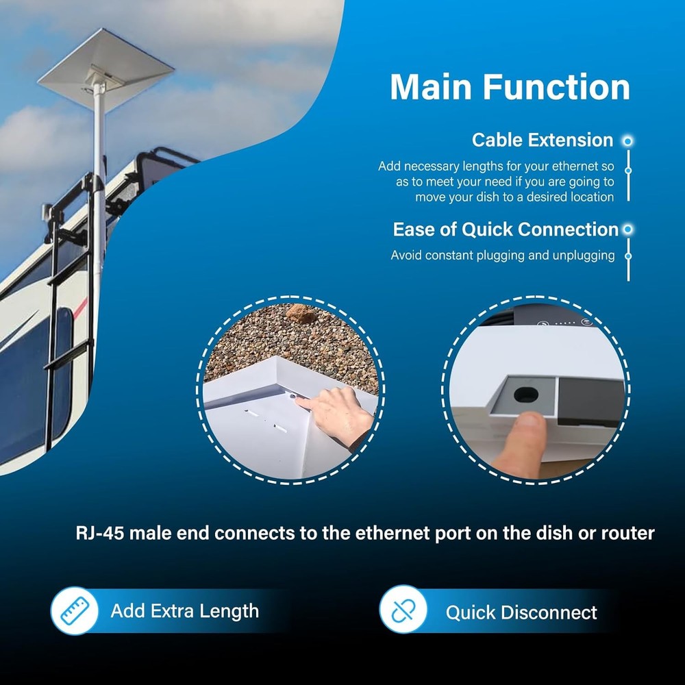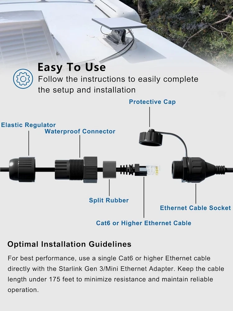 2-Foot Ethernet Adapter for Starlink Gen 3/Mini, Standard to RJ45 Coupler Features: Fitment: Fit for Starlink Gen 3 and for Starlink Mini. Connect to the dish/router Function: 1)Utilize this 2-foot adapter to add necessary lengths for your ethernet. 2) attached both to the dish and router and get an ease of quick connection and also avoid potential damages to your devices due to constant plugging and unplugging. Jaga-tools In Search of Excellence! 2-Foot Ethernet Adapter for Starlink Gen 3/Mini, Standard to RJ45 Coupler 2-Foot Ethernet Adapter for Starlink Gen 3/Mini, Standard to RJ45 Coupler Features: Fitment: Fit for Starlink Gen 3 and for Starlink Mini. Connect to the dish/router Function: 1)Utilize this 2-foot adapter to add necessary lengths for your ethernet. 2) attached both to the dish and router and get an ease of quick connection and also avoid potential damages to your devices due to constant plugging and unplugging. Brilliant Design: 1)Easy to connect/disconnect: taking use of this adapter, we are able to disconnect the dish quickly without having to made a strenuous effort to unplug the connector on the back of the dish which is, in most cases, mounted in an elevated location outdoors. Also makes it easy to connect the dish when needed. 2)Waterproof Cap: when disconnecting, such cap protects the connector from being damaged by rain, moisture, dirt and the like, well handling outdoor conditions. 2) Joiner: when connected to an extra cat 6 cable with rj-45 end, there is a IP68 Coupler protecting from water ingress. Premium Quality: Made of high-quality material, this adapter cable promises stable wired connection without drops, lag, or interruptions. With an IP68 rating, it shields from water/dust and thus ensures increased durability, which makes it a perfect choice for outdoor application. Specification: 2 foot. Standard RJ45 Connectors (male-to-female). Together with an additional cat 6 extension cable (not include), you will have a few link options based on your need. Friendly Service: A full return is available within 30 days if you are not satisfied; we also offer a 12-month warranty from the date of purchase to make sure that you have good experience. Item Specifics Brand JT-Motor Type Ethernet Adapter Fitment for Starlink Gen 3 and for Starlink Mini Manufacturer Warranty 1 Year Material Copper Features IP68 Waterproof Item Weight 3.68 ounces Connector Type RJ45 Color Black Payment Returns Jaga-tools In Search of Excellence! DESCRIPTION PAYMENT SHIPPING RETURN POLICY 2-Foot Ethernet Adapter for Starlink Gen 3/Mini, Standard to RJ45 Coupler 2-Foot Ethernet Adapter for Starlink Gen 3/Mini, Standard to RJ45 Coupler Features: Fitment: Fit for Starlink Gen 3 and for Starlink Mini. Connect to the dish/router Function: 1)Utilize this 2-foot adapter to add necessary lengths for your ethernet. 2) attached both to the dish and router and get an ease of quick connection and also avoid potential damages to your devices due to constant plugging and unplugging. Brilliant Design: 1)Easy to connect/disconnect: taking use of this adapter, we are able to disconnect the dish quickly without having to made a strenuous effort to unplug the connector on the back of the dish which is, in most cases, mounted in an elevated location outdoors. Also makes it easy to connect the dish when needed. 2)Waterproof Cap: when disconnecting, such cap protects the connector from being damaged by rain, moisture, dirt and the like, well handling outdoor conditions. 2) Joiner: when connected to an extra cat 6 cable with rj-45 end, there is a IP68 Coupler protecting from water ingress. Premium Quality: Made of high-quality material, this adapter cable promises stable wired connection without drops, lag, or interruptions. With an IP68 rating, it shields from water/dust and thus ensures increased durability, which makes it a perfect choice for outdoor application. Specification: 2 foot. Standard RJ45 Connectors (male-to-female). Together with an additional cat 6 extension cable (not include), you will have a few link options based on your need. Friendly Service: A full return is available within 30 days if you are not satisfied; we also offer a 12-month warranty from the date of purchase to make sure that you have good experience. Payment Returns All rights reserved.
