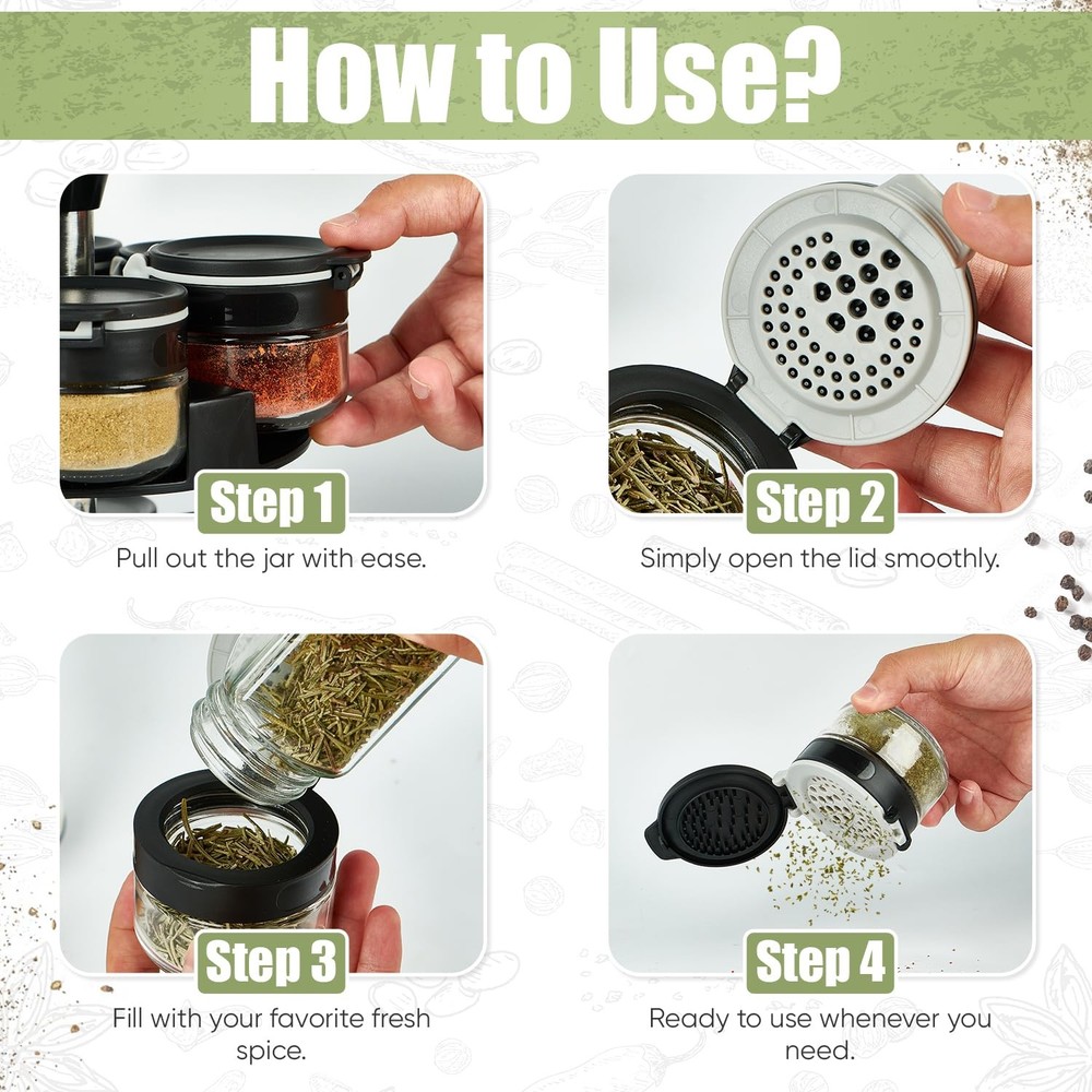 This rotating spice rack is a game-changer for my kitchen! The 360° spin makes finding spices effortless, and the glass jars keep everything fresh. I love how organized and clutter-free my counter looks now—plus, the dual-lid design makes seasoning precise and mess-free. Highly recommend for anyone who loves cooking!