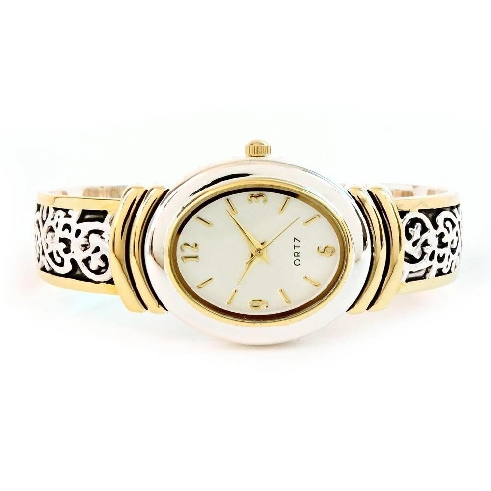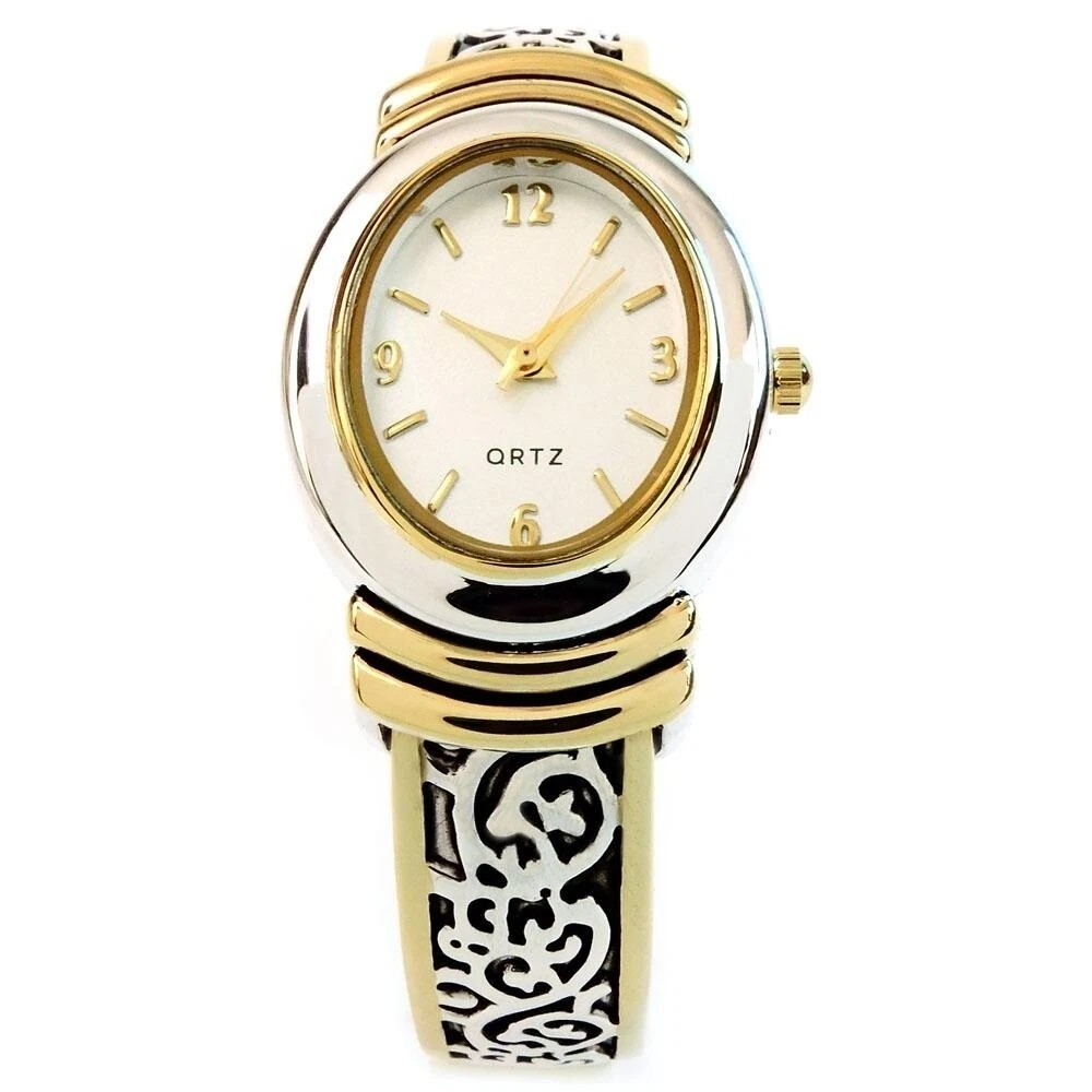 Beautiful 2Tone Western Style Bangle Cuff Watch by STC. The band is about 0.5 inches (14 mm) wide that will open to fit all wrists from 6.5 to 7.5 inches. The surrounding case is polished finish and has a white dial with gold hands and hours. \n\nCase Size is about 1x1.25 inch (27x32 mm)\nFits All Wrists from 6.5 to 7.5 Inches\nBand Width: 0.5 inch (14 mm)\nDecorated Band\nJapan Quartz Movement\n \n 2Tone Western Style Decorated Oval Face Womens Bangle Cuff Watch Beautiful 2Tone Western Style Bangle Cuff Watch by STC. The band is about 0.5 inches (14 mm) wide that will open to fit all wrists from 6.5 to 7.5 inches. The surrounding case is polished finish and has a white dial with gold hands and hours. Case Size is about 1x1.25 inch (27x32 mm) Fits All Wrists from 6.5 to 7.5 Inches Band Width: 0.5 inch (14 mm) Decorated Band Japan Quartz Movement < Product Attributes: Weight (lbs.) : 0.02 lb UPC: 00748296887744 Brand: ANT