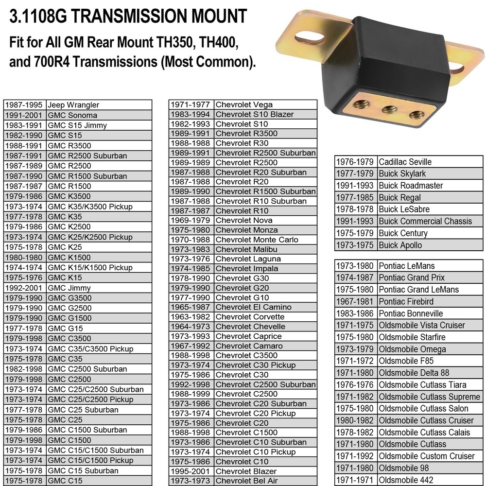 3.1108G General Transmission Mount Performance Polyurethane Mounts Bracket NO Description Fit for All GM Rear Mount TH350, TH400, and 700R4 Transmissions (Most Common). Features: APPLICATION: The transmission mount is compatible with All GM Rear Mount TH350, TH400 700R4 Transmissions (Most Common). Such as fit for 1963-2001 Chevrolet transmissions, 1973-2001 GM transmissions, 1973-1993 Buick transmissions, 1971-1992 Oldsmobile transmissions, 1987-1995 Jeep Wrangler transmissions, 1967-1987 Pontiac transmissions, and most transmissions. FUNCTION: The polyurethane transmission mount is specially designed to hold up to the torque and vibration generated from high-performance street and racing use. Replaces the original, short-lived, and typically too-soft rubber mounts and outdates those hard-running metal transmission mounts. FEATURES: The transmission mount has a strong zinc-plated steel bracket - for added durability when the application requires it and provides amazing performance for any vehicle that uses it. MATERIAL: The transmission mount is made of superior steel and high-performance polyurethane, treated with professional tech, solid and durable. Package included 1 mount, 1 zinc-plated steel bracket, 2 bolts, 2 lock washers, and 4 flat washers. Product Details: Handling We will ship all orders within 1 business day of payment. Delivery We Do Not Ship Outside of the Continental US. Return Policy All items qualify for returns within 30 days of receipt. Buyer is responsible for return shipping on any item that is not damaged. Feedback We take our reputation seriously, we buy and sell online, so we understand the value of trust. If you are unsatisfied with your order, please contact us and we will work with you to resolve it to your satisfaction.