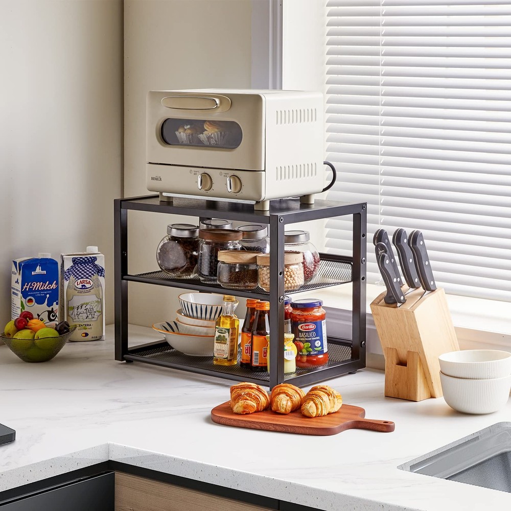 Desktop Printer Stand, 3 Tiers Desk Organizer with Adjustable Storage Shelves, Multi-Purpose Printer Shelf for Home Office, Fax Machine, Scanner, Files, Books, Black, HPT001B Multi Function Desktop Storage: This printer stand can be placed not only in the home office, but also in the kitchen to store tableware and microwave oven, in the bathroom to store toiletries, or in the living room to place decorations and plants. you can put it anywhere you need it Large Capacity Storage Space: Three layers of large capacity design help to store office supplies. The top panel can bear up to 44 pounds. It can hold printers, fax machines, or microwave ovens. The adjustable storage layer is convenient for taking documents. The bottom has adjustable feet to protect the desktop from friction Simple and Fashionable, Solid Structure: This desktop printer shelf is assembled with engineering wood and pure iron frame, which is enough to bear the weight of the printer fax machine. It is a retro industrial design, with matte black and warm brown matching, suitable for your family style Easy to Install: The package is equipped with illustrated instructions and required installation tools. Just follow the instructions to install, and you can quickly get a desktop storage rack Product Size: 17.32 * 13.78 * 11.02 In, Cleaning it easily just wipe with a soft dry cloth to get rid of the dust and grime