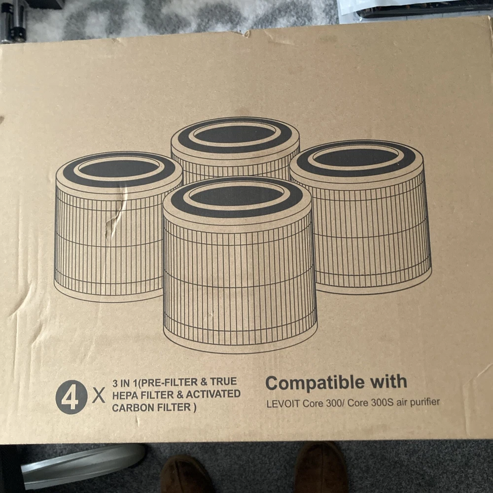 This product is a 4 pack of 3-in-1 replacement filters compatible with Levoit Core 300/ Core 300S air purifiers. The filters are pleated with a white color and a filter frame made of plastic. They feature True HEPA filtration technology and include carbon filter media. The filters have a lifespan of 6 months and were manufactured in 2022 in China.