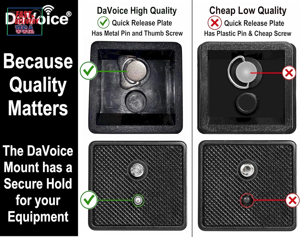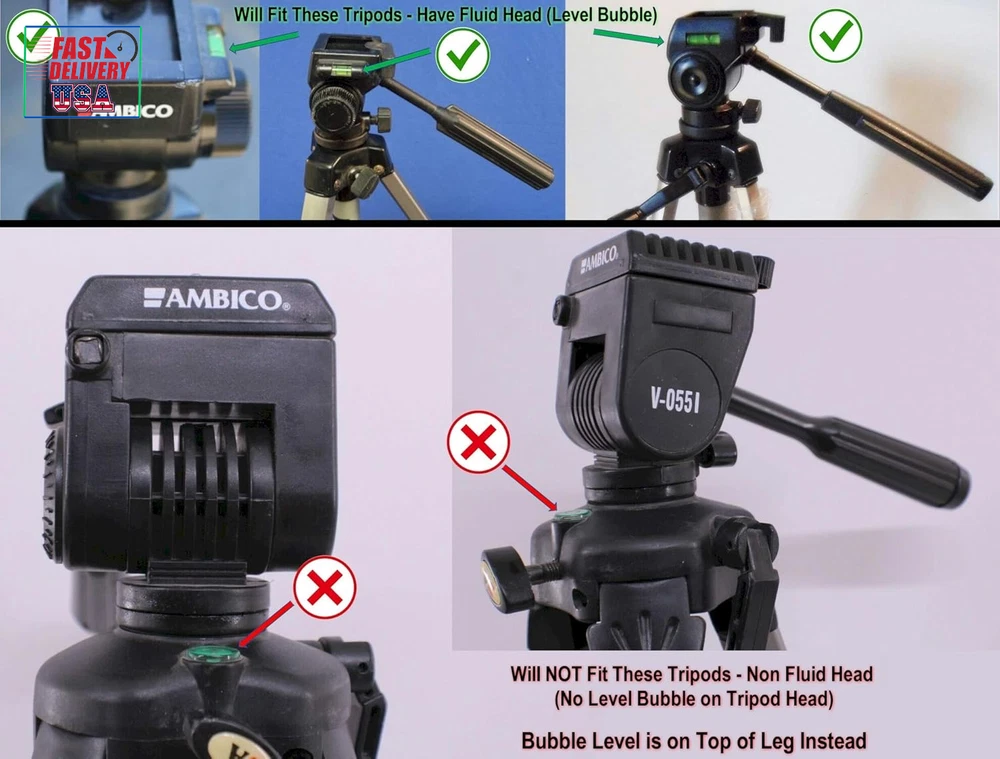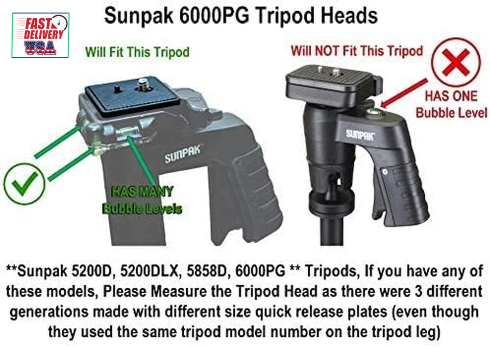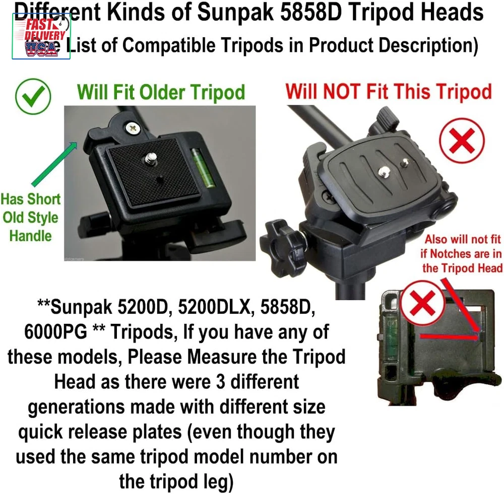 Store New Arrivals Add to Favorite View Feedback Contact 41Mm Tripod Quick Release Plate Camera Mounting Parts Replacement for Ambico V-0552 V-0554, Sunpak 7500 Pro 7500Tm 7575, Kalimar Pro-Tech V-40, Samsonite 1100 2601 Quantaray Tripod Mount 1 5/8 Description Color Black Product Dimensions 1.77 x 1.63 x 0.63 inches Country of Origin China Compatible Devices function(f) {var _np=(window.P._namespace("DetailPageProductOverviewTemplatesJava"));if(_np.guardFatal){_np.guardFatal(f)(_np);}else{f(_np);}}(function(P) { P.when('A').execute(function(A){ A.on('a:truncate:po-attribute-truncate-2:updated', function(data) { var isTruncated = !data.truncateInstance.getIfTextFits(); var seeMoreElement = document.getElementById('po-attribute-see-more-id-2'); if(seeMoreElement) { seeMoreElement.style.display = isTruncated ? '' : 'none'; } }) }); })); NOT Universal, fits certain tripods only. Bottom Base: 41mm x 41mm (1.63" x 1.63") for use with Ambico V-0550 V-0551 V-0552 V-0553 V-0554 Fluid Head Tripods (see notes, may require modification), Kalimar Pro-Tech V-40 Tripod with V40 Photo/Video Fluid Type Head, Pro-Tech V-60 & V-80 Tripod with Fluid Type Head, Sakar TR-64 Tripod, Samsonite 1100, 2600, 2601, 8801 and 8802 Tripods, Solidex Nextech VT200 Compact Tripod, Quantaray QSX 9500, QSX 9502, QSX9500, QSX9502 Tripods, Sunpak 7500 Pro, Platinum Plus 7500PG, Platinum Plus 7500 Pro, Sunpak 7500tm, Ultra 7500TM, Ultra 7575, Ultra 757, Ultra 757TM, Platinum Plus 757, Ultra 757B, Platinum Plus Ultra 757B, 9500, 9502TM, QSX 9500, QSX 9502 Tripods (Replaces Part Number 620-733 / QRP1) and only certain other models of Sunpak Tripods ** Please read the full compatible tripod list in the product description. ** See more Maximum Weight Recommendation 16 Grams Item Weight 0.04 Pounds **IMPORTANT** Base Size - 1 5/8" (41mm x 41mm square) - The tapered square base that fits into the tripod measures 1 5/8” (41mm) across in both directions – this is what fits into the opening mount of the tripod head For use with SOME Ambico V-0550 V-0551 V-0552 V-0553 V-0554 Fluid Type Head Only (SEE NOTES) Sunpak 7500 Pro 7500tm 7575, Kalimar Pro-Tech V-40, Samsonite 1100 2601, ONLY CERTAIN Quantaray tripods, see compatible tripod list in description. If you have an Ambico Fluid Head tripod V-055* READ THE NOTES UNDER THE PRODUCT PICTURE. A quick sanding adjustment may be reqired to get it to fit. 5% of the tripod heads are slightly out of spec, 20 seconds of light sanding on both beveled sides of the plate will make it fit. QR release plate mounts to the tripod mount allowing you to attach a camera, or cell phone tripod adapter, to a compatible tripod head quickly and easily. Extra QR plates allow you to conveniently swap out more than one camera or device without having to use the same tripod quick release base plate The DaVoice quick release plate features a metal pin and a high-quality metal thumb screw, unlike other brands. No tools required to tighten the screw Product Description ** IMPORTANT ** . Please measure your tripod shoe for compatibility . It should measure 1-5/8" x 1-5/8" (41mm x 41mm) to be compatible with this quick release plate. Extra QR plates allow you to conveniently swap out more than one camera or device with the same tripod DaVoice Tripod Quick Release Plate Camera Mounting Adapter Parts Replacement for use with Certain Ambico V-0552 V-0554, Sunpak 7500 Pro 7500tm 7575, Kalimar Pro-Tech V-40, Samsonite 1100 2601 Quantaray Tripod Mount 1 5/8 . ** SEE FULL COMPATIBLE TRIPOD LIST BELOW & NOTES ** The tapered square base that fits into the tripod base is 1-5/8" x 1-5/8" (41mm x 41mm) dimensions on the bottom (that fits inside the opening in the mount head of the tripod). Has 1/4 inch Camera Mounting Screw that fits most cameras and camcorders and cell phone tripod adapters. QR plates attach to the tripod mount on your camera and allow you to quickly and easily attach and detach your camera or device from a compatible tripod head. COMPATIBLE TRIPOD LIST ** Please measure the tripod head to ensure compatibility even if your tripod is listed here ** 1-5/8" (41mm x 41mm) may fit: MAY REQUIRE MODIFICATION TO FIT ** SEE NOTE BELOW. ** Ambico V-0550 V-0551 V-0552 V-0553 V-0554 Fluid Head Tripods ONLY ( Has bubble level on tripod head, see pictures for reference ) PLEASE MEASURE your Ambico tripod head, see pictures for example of correct tripod and the measurements. This is for the FLUID TYPE HEAD ONLY ( Does not fit the Non-Fluid Head ) ** AMBICO TRIPODS - PLEASE NOTE ** There is about a 5% possibility you will find the plate is BARELY too big and does not fit the Ambico Tripods listed here, but do not worry. By "barely too big" I mean just a "hair" too tight to fit. The problem is due to a "bad" batch of Ambico tripods with a manufacturing specification that was off slightly. The easy fix is to to file off / sand off a tiny bit of the base of the plate (on the 2 beveled sides, not the straight sides), or alternately do this to the tripod opening where the plate goes. By removing just the slightest amount of plastic, it will fit into the tripod head and work great. Kalimar Pro-Tech V-40 Tripod with V40 Photo/Video Fluid Type Head, Pro-Tech V-60 & V-80 Tripod with Fluid Type Head Kodak older tripods that measure 41mm x 41mm tripod head opening ONLY Sakar TR-64 Tripod Samsonite 1100, 2600, 2601, 8801 and 8802 Tripods Stitz Video CV550Q Tripod Solidex Nextech VT200 Compact Tripod Quantaray QSX 9500, QSX 9502, QSX9500, QSX9502 Tripods OLDER Sunpak 5200D & 5200DLX Tripod ( 1st Generation ONLY - See reference picture at top of page, PLEASE MEASURE carefully as there were DIFFERENT models labeled 5200D and 5200DLX and this quick release plate ONLY FITS THE OLDER VERSION ) Please be sure your tripod head looks like the photo and measures in the receptacle 41mm / 1.6" wide (Replaces Part Number 620-762 / 620-733) OLDER Sunpak Platinum Plus 5858D Tripods ( 1st Generation ONLY - See reference picture at top of page, PLEASE 