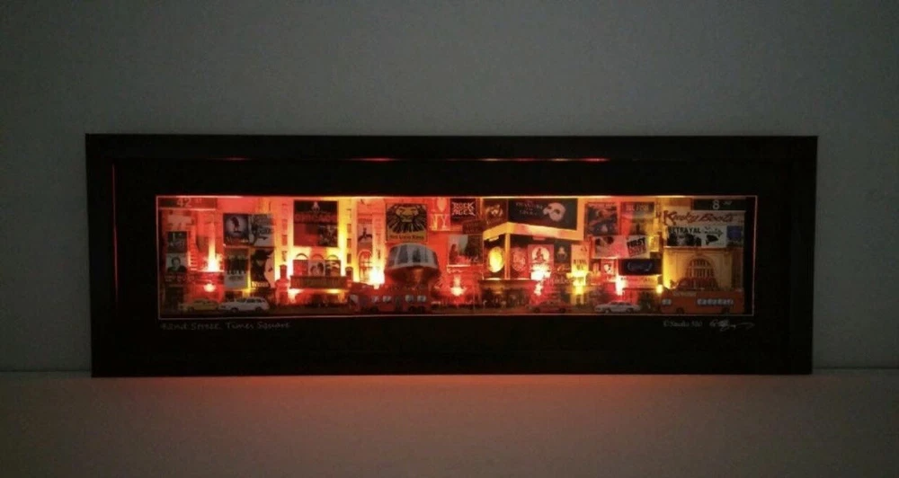 This one-of-a-kind 3D paper cut artwork depicts the iconic 42nd Street in New York City, featuring LED lights that bring the scene to life. Measuring 24 inches in width, 10 inches in height, and 1 inch in depth, this piece is framed and ready to hang. The artwork is handmade and signed by artist Ge Wang, who created a detailed 3D representation of the street, complete with copyrights and a certificate of authenticity. This piece is perfect for any art enthusiast or lover of New York City, and would make a great addition to any collection.