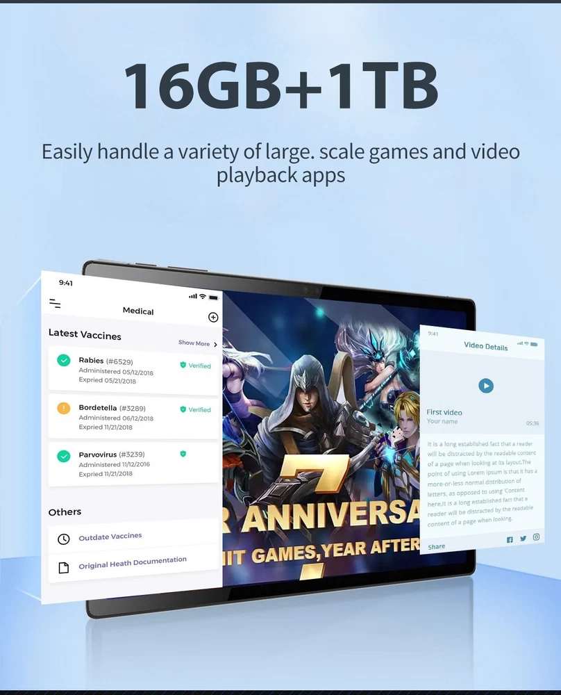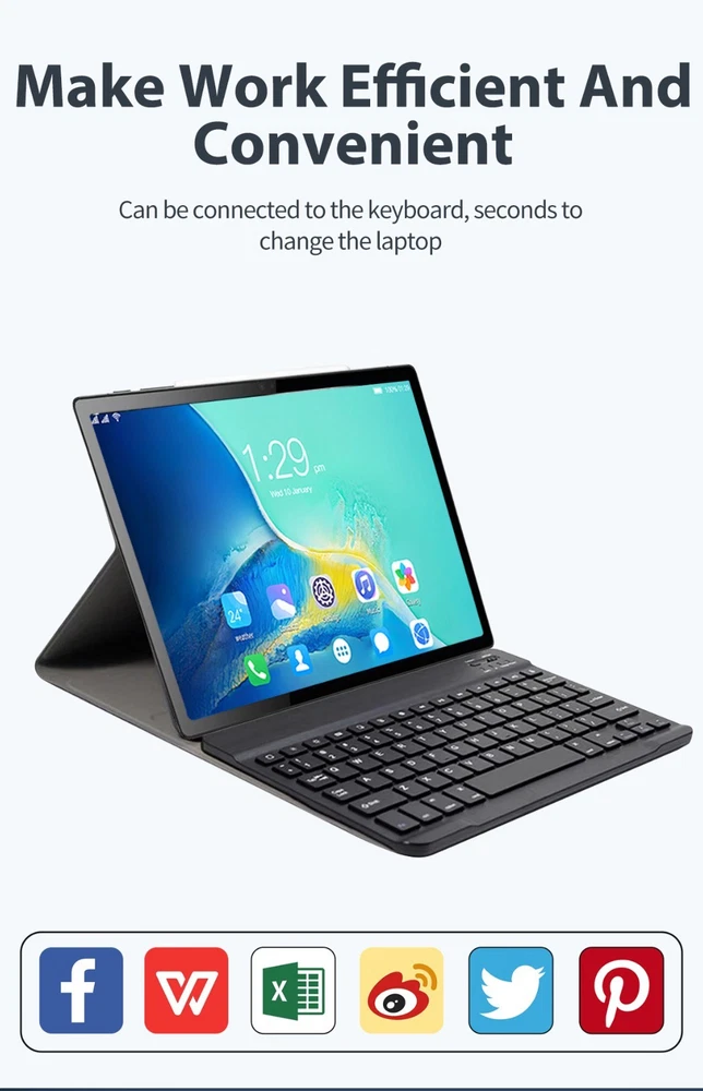 Tablet 11 inch Ultra Big Android 13 Tablets, 1TB Storage,16GB RAM, 10500 mAh Battery , 10-Core 2.5GHz ,2 Speakers, 4G/5G WiFi with Case Bullet Point ★ 11inch LARGE DISPLAY& 10 CORE CPU: Experience ultimate performance with the Weiboer Android Tablet featuring a robust 10-core CPU, 16GB RAM, and 1TB internal storage. Expand up to 1TB with microSD (sold separately). Enjoy seamless multitasking on the fast and responsive tablet. Its 11 inch 3840x2160 full screen with a wide viewing angle offers high-resolution images, providing a more realistic and powerful visual experience. ★ UPGRADED ANDROID 13 TABLET: 11 inch google android tablet is equipped with a new upgraded system "Android 13", providing a more personalized, safe and easy-to-operate system experience. You can install apps like Netflix, TikTok, YouTube, LINE, Yahoo, Twitter from the Google Play Store on your GMS certified tablet. ★ 8800MAH LONG LASTING BATTERY: The 11 inch Computer Tablets is equipped with battery up to 10500mAh. Achieve up to 8 hours of video battery life, and use the Type-C port to charge more easily, regardless of positive or negative. With a weight of 996g, it is very convenient to carry it with you whether you are working, studying or going out. ★ MULTIFUNCTIONAL 10.1 INCH TABLET: Equipped with a 16MP + 24MP camera and By combining it with the flash, it is thought that shooting in dark places will be really improved. iMeshbean tablets android Bluetooth 5.0 supports high-fidelity headphones for sound quality enjoyment. Great for work or pleasure, use this tablet for video conferencing, gaming, streaming, or even as an e-reader in your preferred language. ★ 2 IN 1 TABLE WITH KEYBOARD LEATHER CASE: Tablet connect with Keyboard, change 2 in 1 laptop; Tablet case, Screen protector and Touch pen can better use. ★ SEAMLESS CONNECTIVITY: Get fast and stable internet connectivity with 2.4G/4G/5G WiFi that offers better range and speed, undisturbed streaming, gaming or browsing. The sturdy metal frame adds durability to this WiFi Android tablet, making it perfect for everyday use . ★ IDEAL CHOICE FOR GIFT: With exceptional performance, a chic aesthetic, and exquisite packaging, this tablet stands as the ideal gift for occasions like Christmas, Valentine's Day, birthdays etc, Its impressive features ensure a memorable and versatile present for your loved ones. Specification 11 inch Tablet Brand JWEIBK Model GT30 Shell Metal aluminum alloy shell Color Black Blue Display 11 inch Resolution 3840X2160 Keyboard Backlight Bluetooth Keyboard(Support external keyboard) CPU MTK Core 10 core Storage 16GB RAM +1000GB ROM Camera Front Camera:1600W Rear Camra:2400W Battery 10500mAh Operating system Android 13 Bluetooth BT5.0 Processor Speed 2.5 GHz Microphone 42db 2.2kΩ Speaker Built-in 8Ω 1W TF Card Micro SD Earphone 3.5MM Interface Type Cx1, headphone jack 3.5 mm x1, microSD slot x1 DC power x1 Power adapter 5V 3A Package included 1x11inch Tablet 1xbluetooth keyboard 1xCharger 1xKeyboard Case 1xWireless Mouse 1xTouch pen 1xEarphone 1xEnglish Manual Package List 1x11 inch Tablet 1x11inch bluetooth keyboard 1xCharger 1xKeyboard Case 1xTouch pen 1xEarphone 1xEnglish Manual
