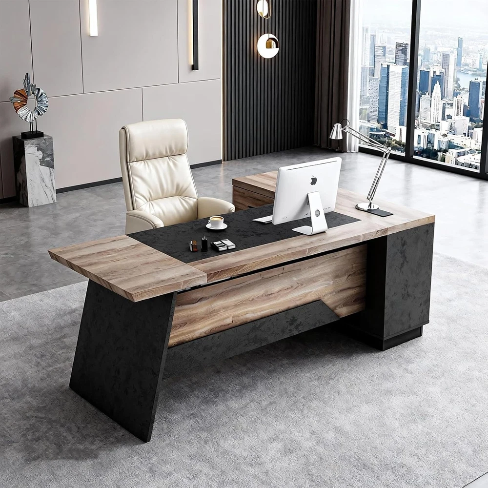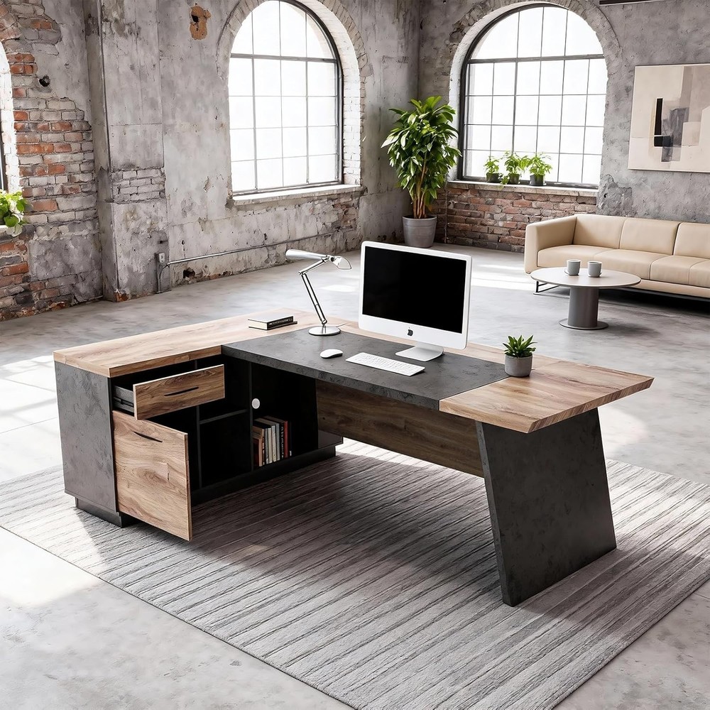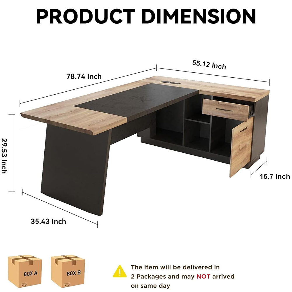 The 78.7" L-Shaped Executive Desk is a stylish and functional addition to any home office or study. Made from durable particle board and MDF, this desk features a dark wood tone and a contemporary/modern style. With built-in outlets and drawers, this desk offers both convenience and organization. The free-standing design and adjustable height make it suitable for adult use, while the 300 lb weight capacity ensures stability. Assembly is required, but no additional parts are needed for a complete and functional desk setup.