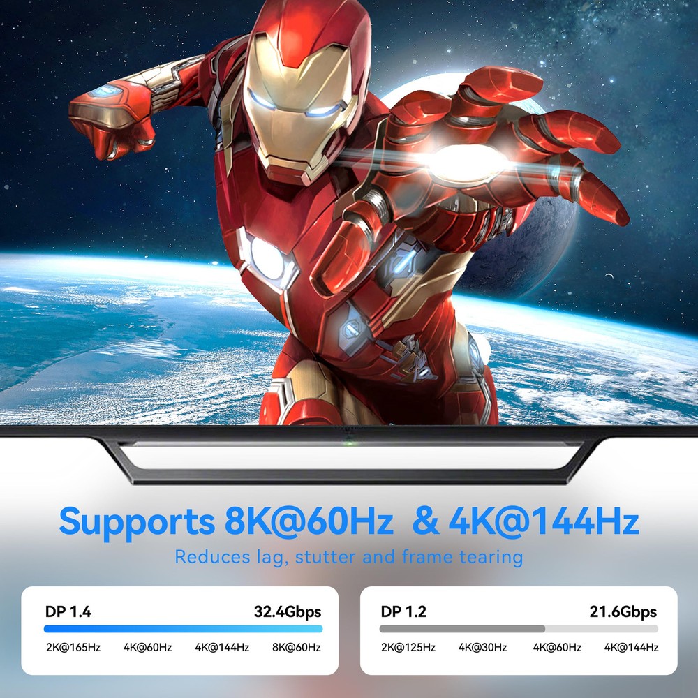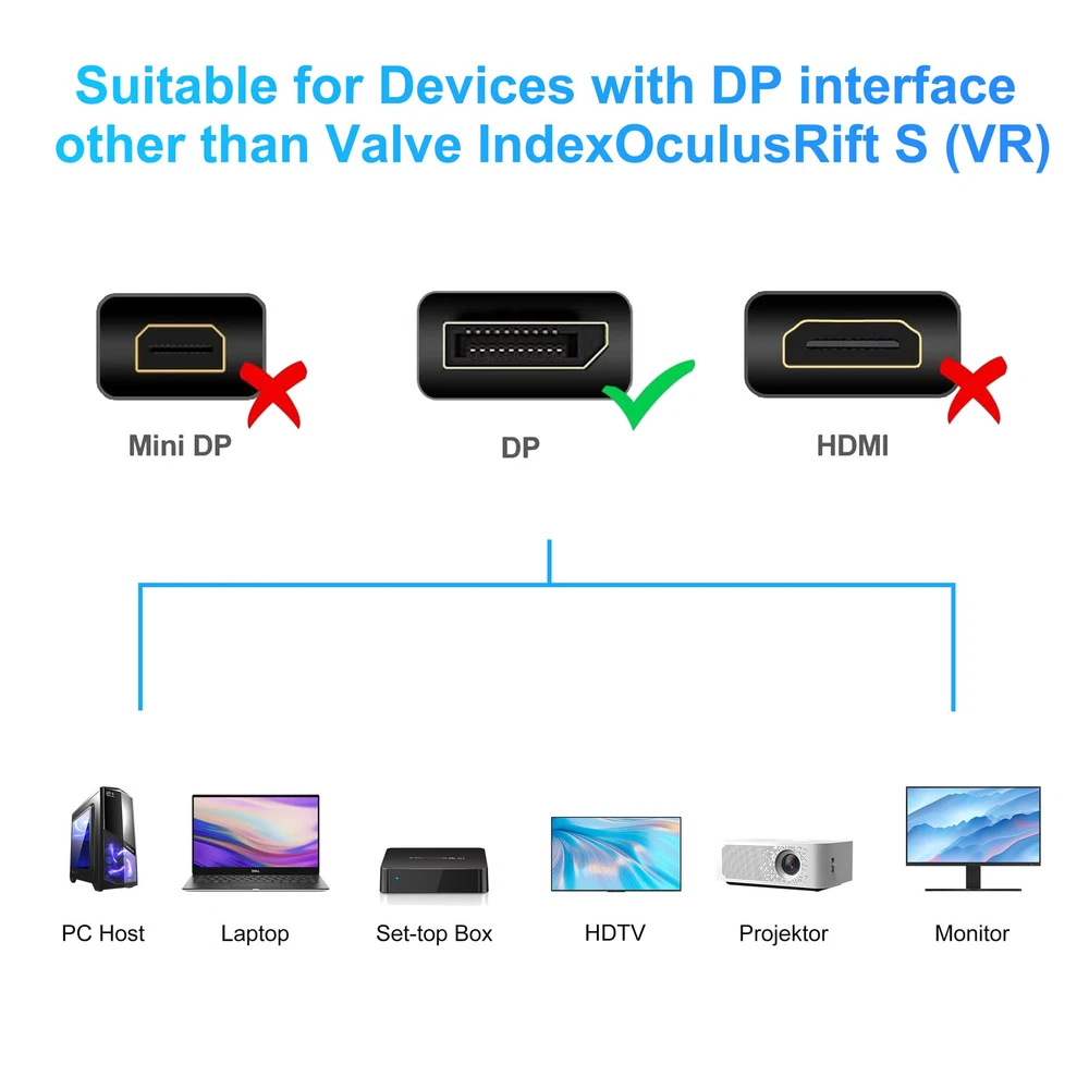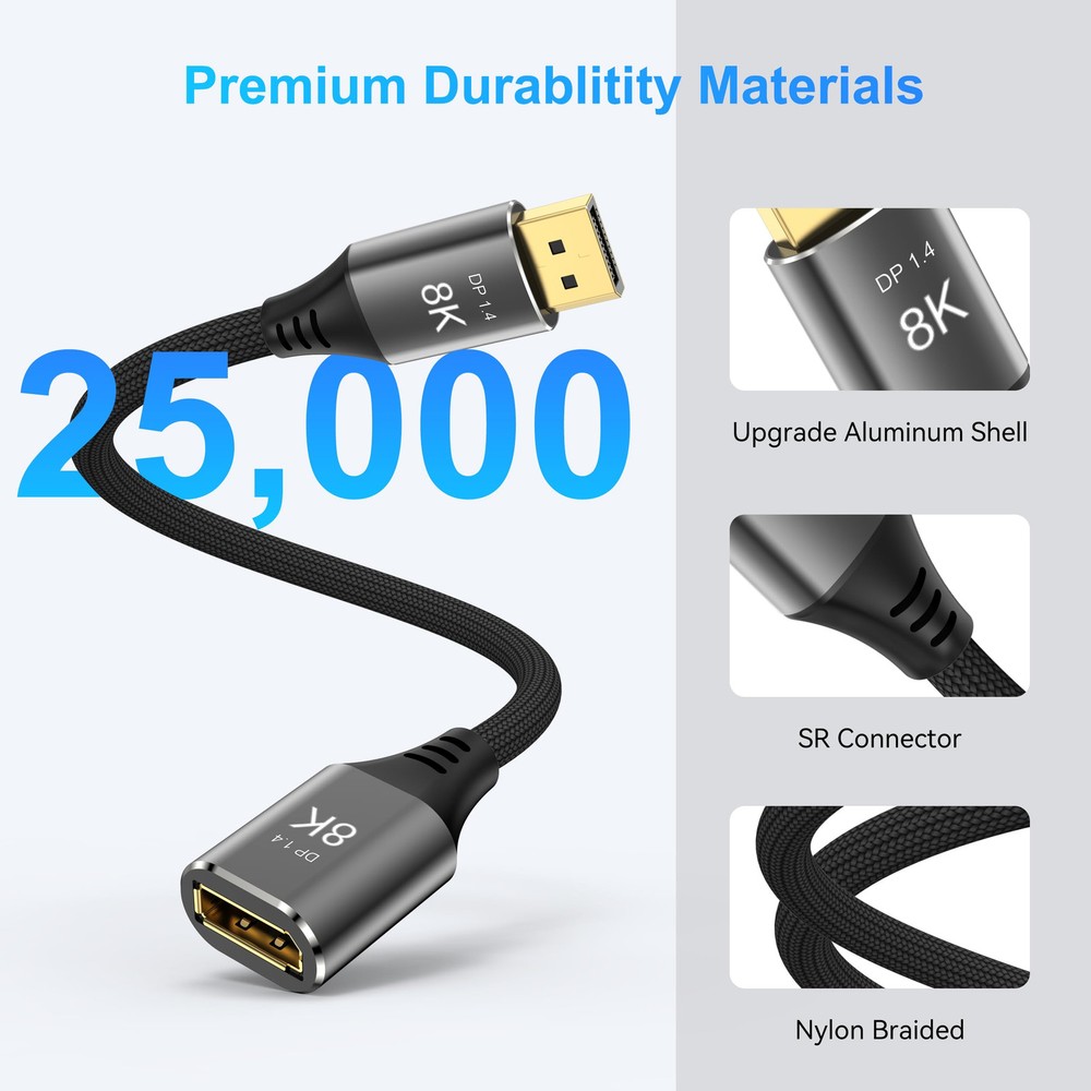 【8K High Resolution,DP1.4 Standard】- This Displayport extension cable supports 8K ultra-high resolution and is backwards compatible with 4K @ 144Hz, UHD and HDR. Upgraded to DP1.4, is also compatible with DP1.2 version. With a maximum bandwidth of 32.4 Gbps, signal transmission is smooth and stable. With HDCP 2.2 / Dynamic HDR / DPCP1.0 / DP++ / DSC / FEC / MST / HBR3 and more, you can enjoy perfect high frame rate video and multi-channel audio and stereo presence. 【Signal Extension and Freedom of Movement】- This DisplayPort extension cable connects a DisplayPort-compatible laptop or PC to a monitor/TV/projector equipped with DisplayPort inputs. A convenient accessory for extending the connection between DisplayPort input/output terminals, it provides stable transmission and can be applied when DisplayPort cable lengths are insufficient, giving you more freedom when wiring. It helps to increase the distance to the screen and expand the range of movement. 【Superior Stability and Durability】- DisplayPort extension cable has a 24K gold-plated connector that resists corrosion and oxidation. Assembled with an aluminum shell and copper foil spot welding, it provides better protection for internal materials and stable signal transmission. Made of flexible PVC and cotton braid, this DisplayPort extension cable is waterproof, handy and durable. No worries about failure or signal degradation, even after prolonged use, ensuring excellent durability. 【Wide Compatibility】: DisplayPort Extension Cable compatible with devices with DisplayPort terminals. DP input destinations can be connected to laptops, mainframes, etc., and DP output destinations can be connected to monitors, displays, projectors, etc. is a brand that specializes in the production of DisplayPort /USB/HDMI cables, we committed to providing quality products and services for customers, please us if you have any questions.