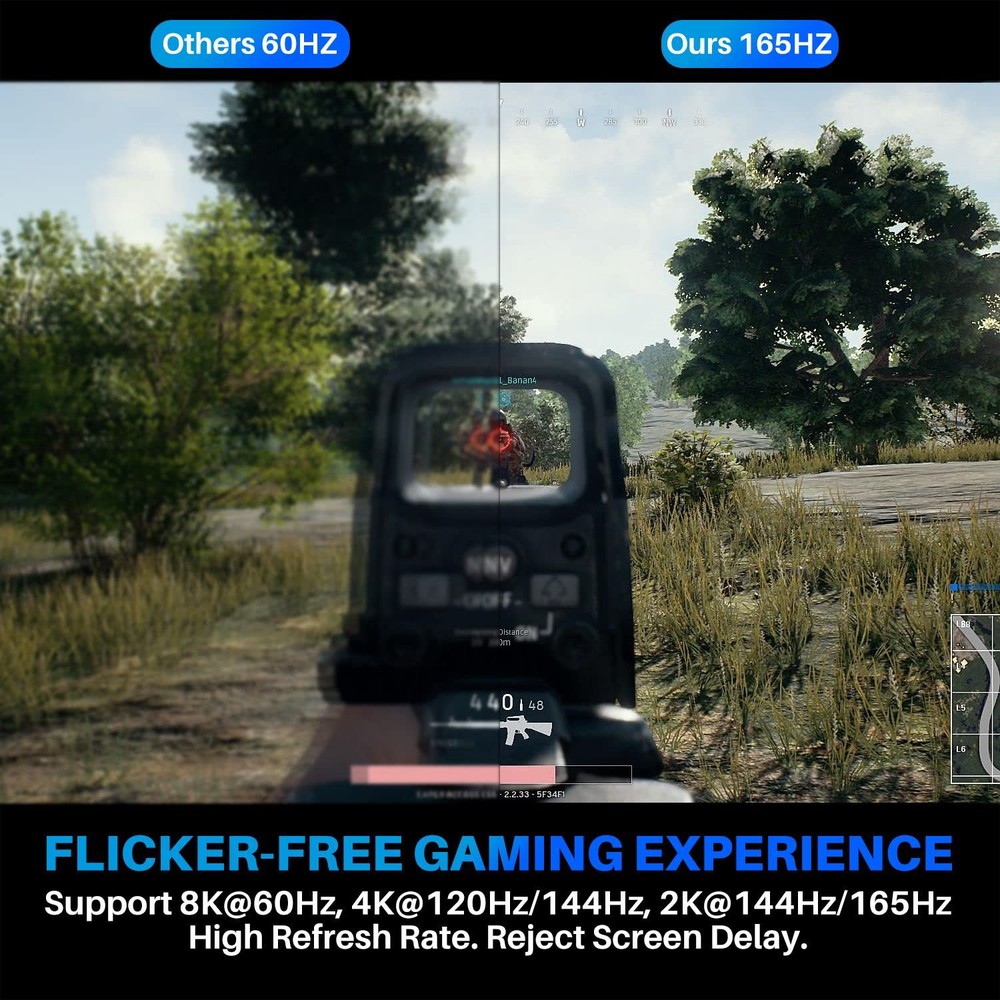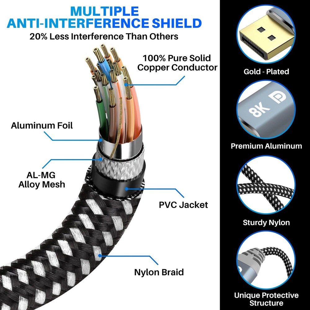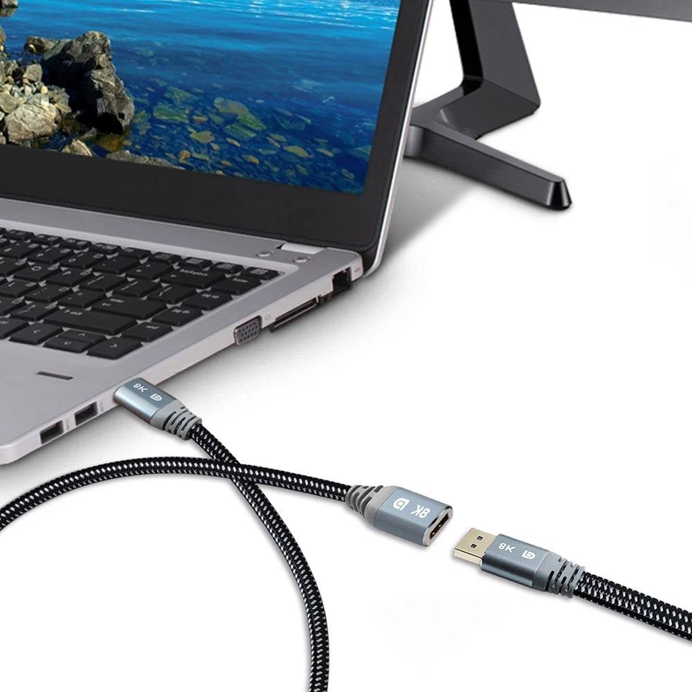 8K DisplayPort Extension Cable Male to FeMale DisplayPort 1.4 Cable supports the resolution up to 8K 7680x432060Hz, 4K 3840x2160144Hz and 2K165Hz, ideal for doing high performance gaming or watching a HD movie on your television. 8K UHD DisplayPort 1.4 Cable 8K60Hz(7680x4320P60Hz);4K144Hz;2K165Hz 32.4 Gbps bandwidth HBR3, CEC, EDID, HDCP2.2,HDR10 4:4:4 3D Format,32 audio channels Backwards compatible with DisplayPort 1.3/1.2/1.1. High Reliability Materials Tripel-Shielding 100% Pure Solid Copper Conductors 24K Gold-plated Connectors Nylon Braid 【Notice: Not DP to HDMI;Not Mini Displayport】【8K UHD DisplayPort Cord】Ultra High Speed DisplayPort 1.4 Cables Support Resolution up to 8K (7680x4320) including 5K (5120x2880 @ 60Hz), 4K Ultra HD (3840x2160 @ 144Hz) and 2K 1440P 1080P240Hz @165Hz120Hz.Support 32.4 Gbps bandwidth, DSC 1.2 display stream compression, FEC forward error correction, 32 audio channels and HDR10.Backwards compatible with DisplayPort 1.3/1.2/1.1. 【Extended Cable and Add 5 Cable Ties】: Display port Extension cable supports extending an existing DisplayPort cable with the DisplayPort extension cable for more convenient connection at office or home. When you need to plug frequently, it is a good choice to use our DisplayPort extender to reduce the wear of graphics card or display port 【High Reliability Materials】8K DisplayPort 1.4 Cables are Made of 26-30AWG 100% pure solid copper with triple-layer shielding to resist interference and ensure stable signal transmission. Durable and thickening housing, 24K Gold-plated connectors to ensure a superior durability and reliability.The nylon braided jacket can resist corrosion and stand 10000+ plugs and unplugs. 【Wide Compatibility With Gaming Monitor】Compatible with Samsung, Dell, LG, HP, ASUS, Acer, Alienware gaming monitors. Supports DP, DP++, and DisplayPort++.It will be so great to use Displayort 1.4 cable to show your Cyberpunk 2077 gaming skill on RTX3080. Also compatible with graphics cards, like Radeon R9 290, Geforce GTX 980/1080, HD Graphics 4600,ASUS HD 7970 DCII. 【Unconditional 2 Years 】We offer 2 years Breakage assurance for all of the 8K DP 1.4 Cables in case of defective product.Please feel free to us if you have any questions or concerns. Our reliable will reply within 24 hours.