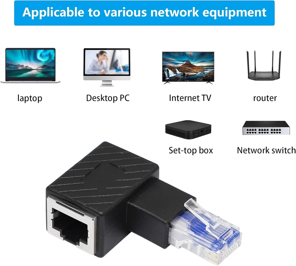 This adapter is a lifesaver for tight spaces! The 90-degree design makes it easy to connect cables behind furniture or TVs without bending or straining the cord. The gold-plated connectors ensure a stable, high-speed connection, and it works perfectly with Cat5e and Cat6 cables. No more struggling with bulky plugs—this little gadget keeps everything neat and secure. Highly recommend for anyone dealing with cramped setups!