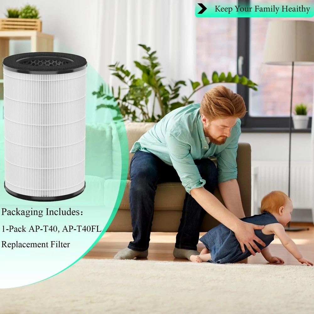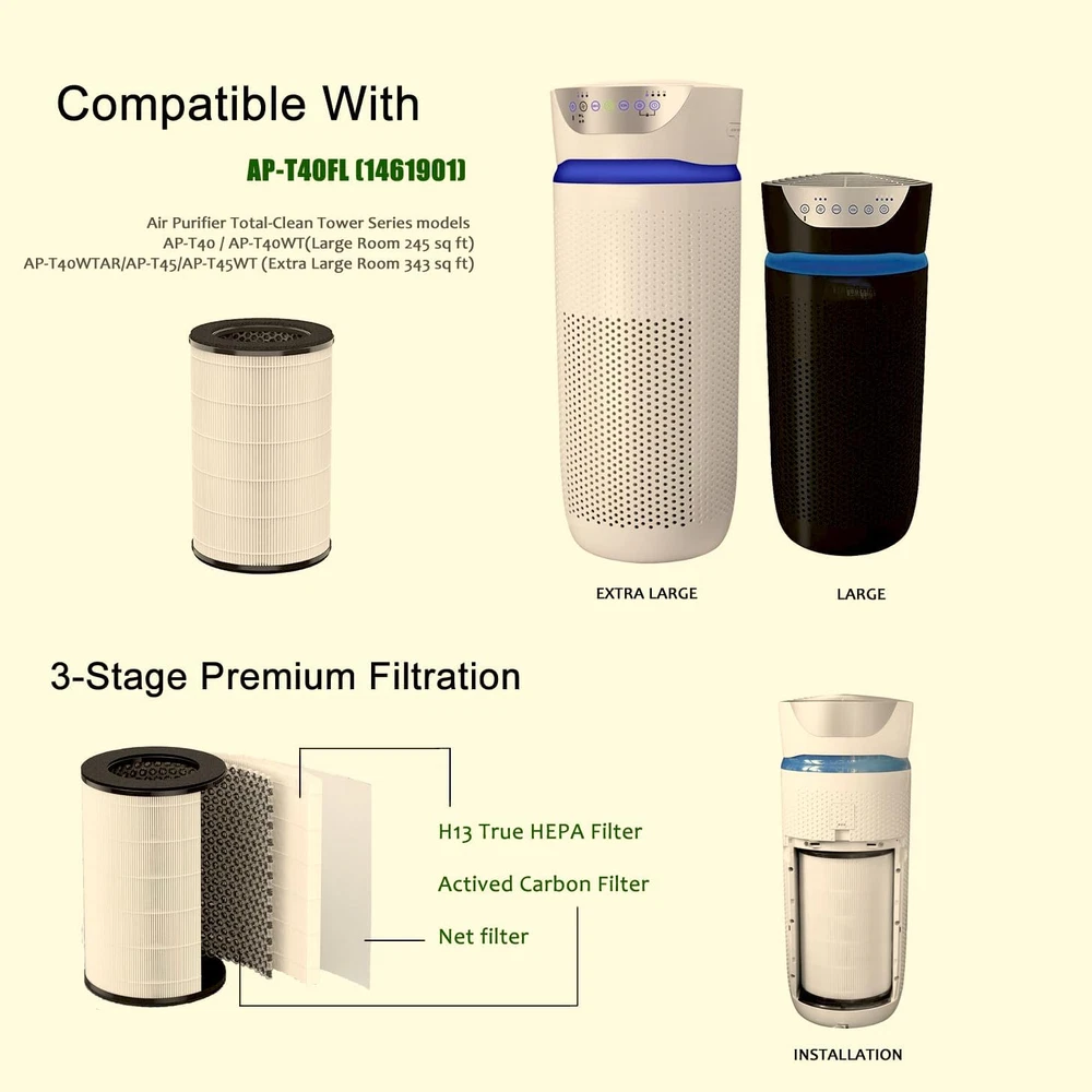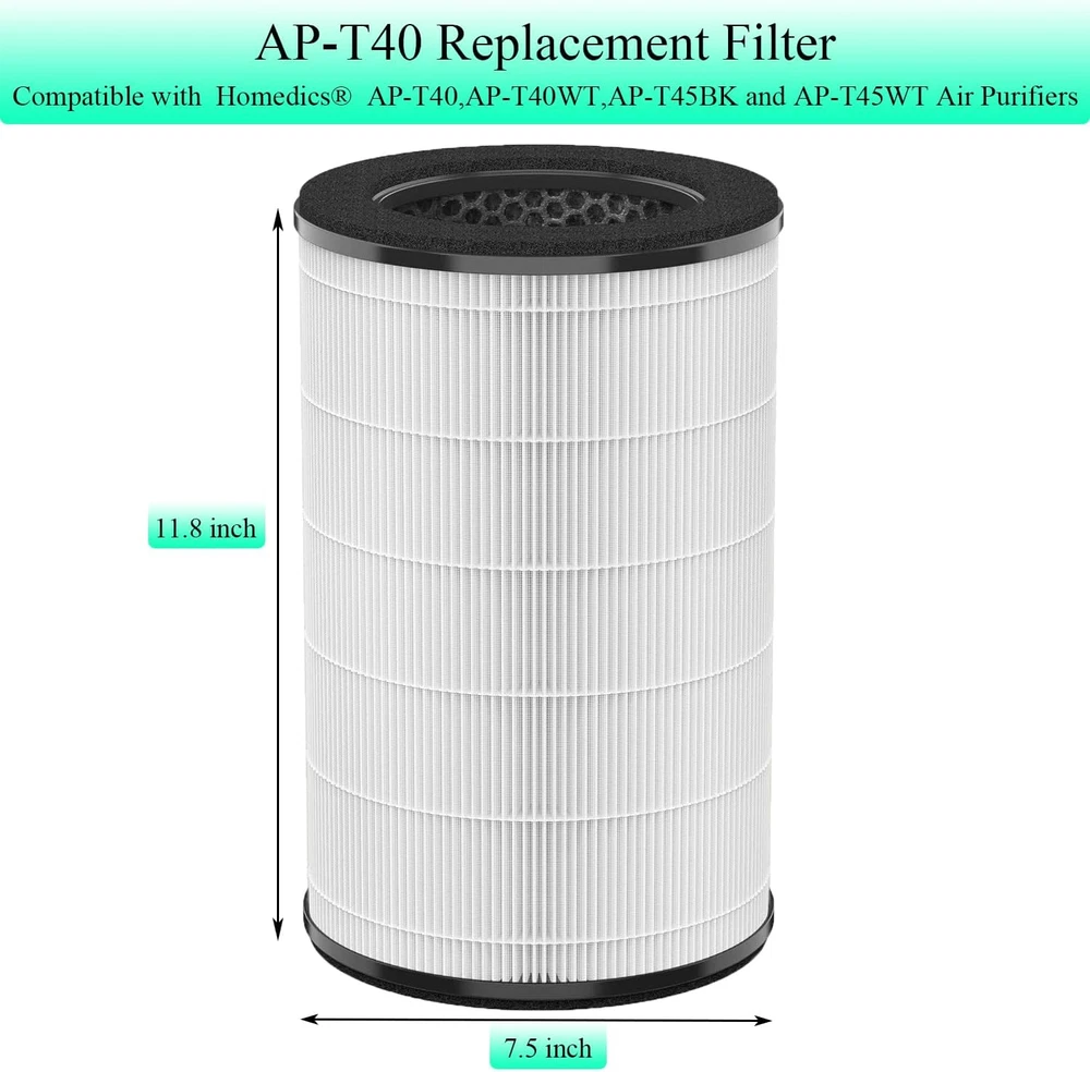 【Perfect Compatibility】AP-T40 Homedics air purifier Replacement Filter ,Compatible with Homedics Air Purifier Total-Clean Tower Series models AP-T40 AP-T40WT (for Large Room 245 sq ft), AP-T40WTAR AP-T45 AP-T45WT (for Extra Large Room 343 sq ft), compare to part# AP-T40FL. It also compatible with Costco 1461901. It works as well as the original ones.Please check the model before purchase. 【H13 True HEPA Filter】 This homedics filter replacement has 3-stage premium filtration: H13 True HEPA Filter, actived Carbon Filter and net filter. 5 layers H13 true HEPA filter help create a cleaner & healthier breathing experience,with capturing up to 99.97% of airborne particles as small as 0.3 microns such as dust, pollen, dander. 【Build in Activated Carbon Pre-filter】Inside of the AP-T40FL replacement filter is the net filter, which can capture large particles. The activated carbon can built-in prefilter captures large particles, The activated carbon can efficiently absorb unwanted odors,fume,smoke,cooking smells,pet odors,VOCs ect. Improving indoor air quality and helping to extend the life of the HEPA filter. 【Valuable Package】It is recommended to replace the homedics air purifier filter every 6-12 months depending on air quality and frequency of use. This package contains 1 packs of AP-T40 replacement filter helping you cost effective price, saving much cost for your all year round air cleaning need. 【100% Quality Guarantee】 No matter what time of the day or night you have a question about your ap-t40 filter, please don't hesitate to give us a call or send us an E-mail, our customer support team will be happy to help you!Filter Dimension 11.81"x 7.52"x 7.52". Please CHECK your air purifier model number before purchase. Product Description Focuses on the development and manufacture of high-quality and efficient air purifier filters.We committed to selling high-quality air purifier filters that truly improve air quality. Improving indoor air environment,Bringing wellness and joy to your home! AP-T40 Replacement Filter 3-in-1 purilcation function -Pre-Filters help to remove large particleslike lint,pet dander&fur, hair. -H13 Grade HEPA filter Effectively capture 99. 97% of airborne particles as small as 0. 3 microns such as pollen, allergies, dust, mold spores, germs and more, helping you breathe fresh air at your home, office or other places. -Activated Carbon help to remove odor absorb odors from cooking, chemical, pet. It can extend the service life of HEPA and save costs Compatible with Homedics AP-T40, AP-T40WT, AP-T45-BK and AP-T45-WT Air Purifiers. Filter Size :11.8x7.5 inches. Package includes:1-Pack AP-T40 Replacement Filter. Recommend to replace the filter on average 6 months or depend on usage. Excellent Purification Performance AP-T40 Replacement Filter can absorb, decompose and transform various air pollutants (including PM2.5, dust, pollen, odor, formaldehyde and other decoration pollution, bacteria, allergens, etc.), effectively improving air cleanliness. Disclaimer This is not an OEM product, any use of the brand name or model designation for this product is made solely for purpose of demonstrating compatibility. Nyingchi filter is trustworthy for you.