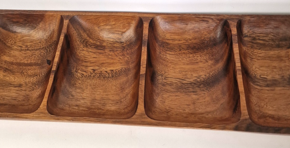 Stunning Acacia Wood 4 compartment snack tray. The piece measures 52 cm long and 15 cm from front to back, 3.5 cm tall. A Beautiful piece of Treen, the colour may vary slightly from the photographs. Please refer to the photographs as they do form part of the description. All items are professionally packed using lots of Fragile Tape where applicable. I use the courier Evri and they estimate 2/3 working days to get your item to your location. You may like to look at my husbands E Bay Shop, Quality Antiques and Vintage. Thank You for Looking and good luck with your bidding.
