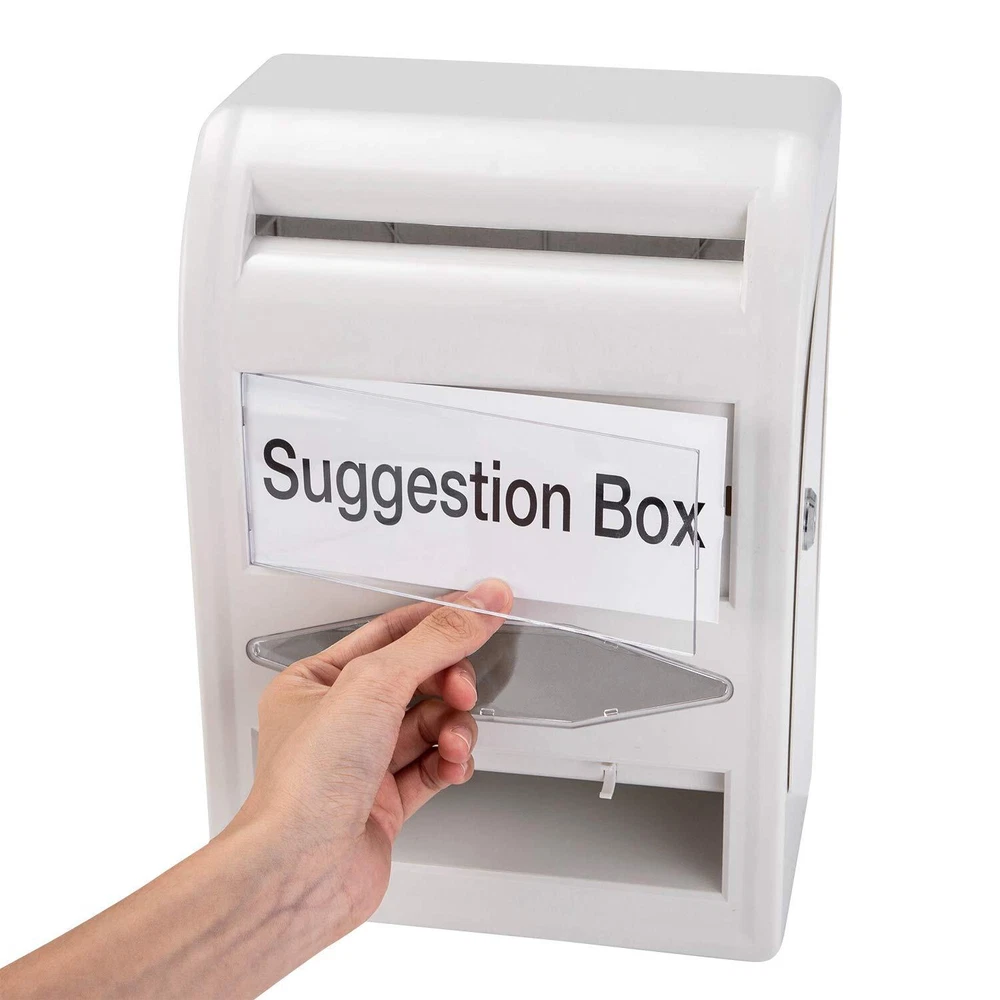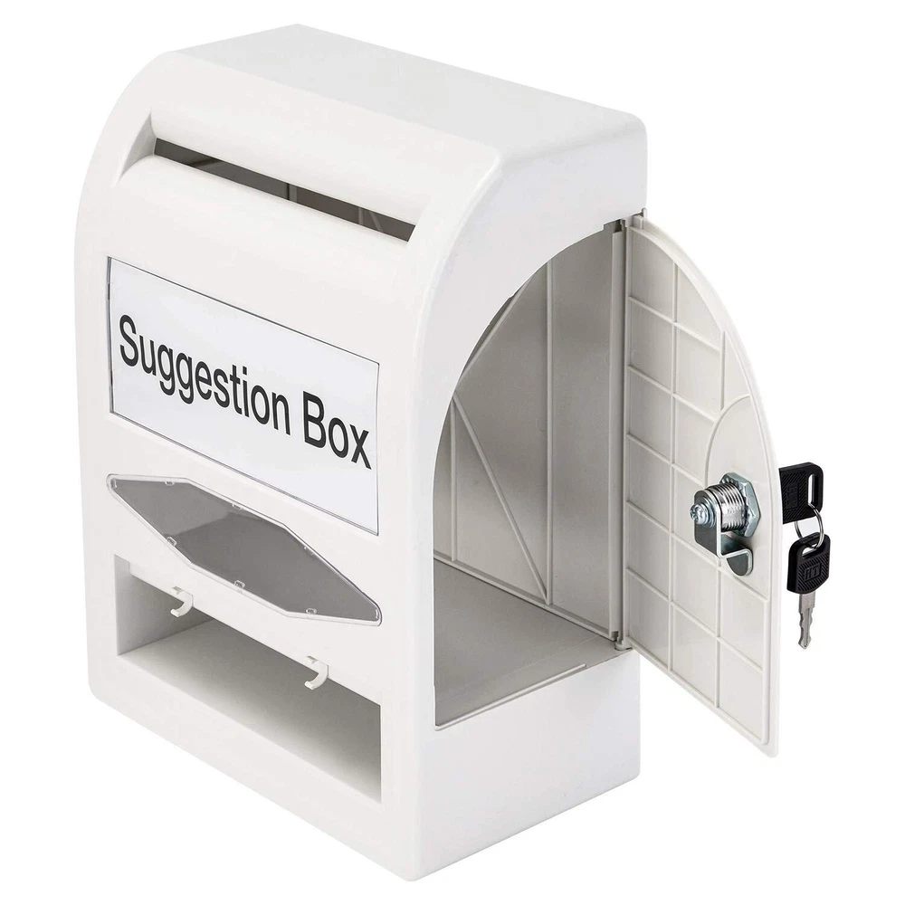 Product Description Amazon Basics ABS Ballot Box With Lock From the Manufacturer Amazon Basics Durable construction: made of rugged ABS plastic in a non-transparent white color Keyed entry: locked box requires a key to open; set of 2 keys are included Versatile: can be used for collecting voting ballots, letters, suggestions, complaints, and more Customizable: 6 replacement tags allow for creating unique signage; front window cover made of plastic protects the tags Warranty: backed by an Amazon Basics 1-year limited warranty