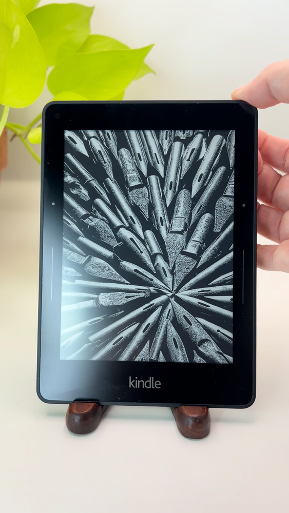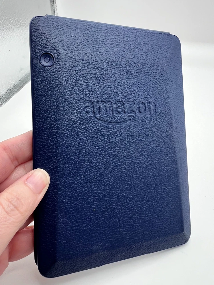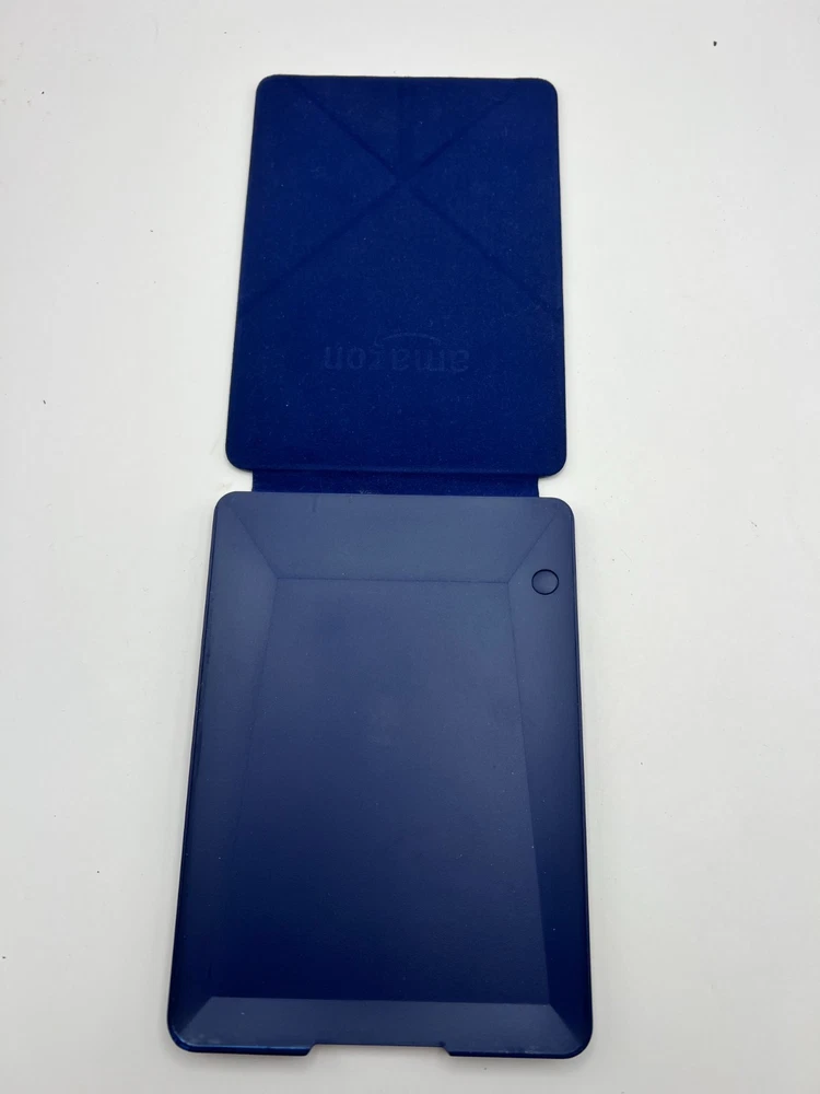 This Amazon Kindle Voyage e-reader is a highly regarded discontinued model known for its sharp 300 PPI display and intuitive page press sensors. The Voyage features an adaptive front light that automatically adjusts to ambient lighting, making it comfortable to read in both bright and low-light environments. Many Kindle users still consider this model a favorite due to its slim profile, premium screen clarity, and tactile page-turn controls. The device powers on properly and presents the setup screen. A blue origami-style protective case is included.