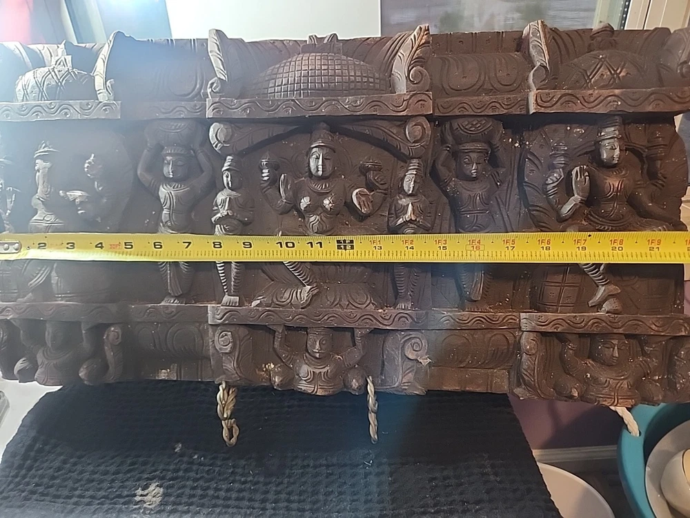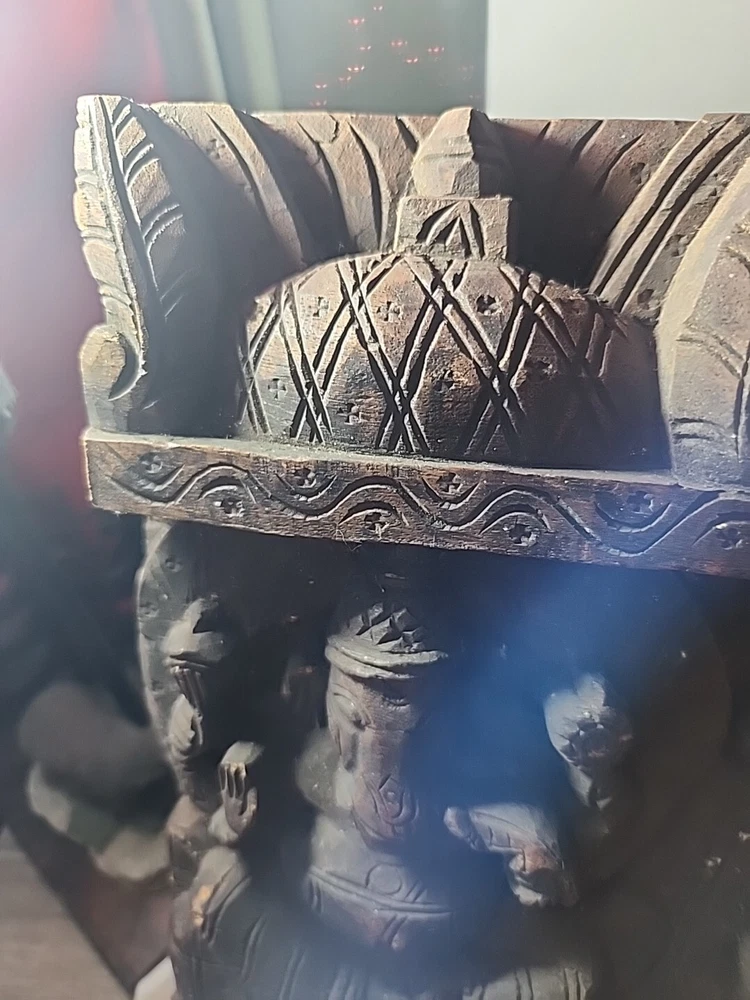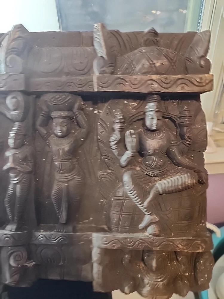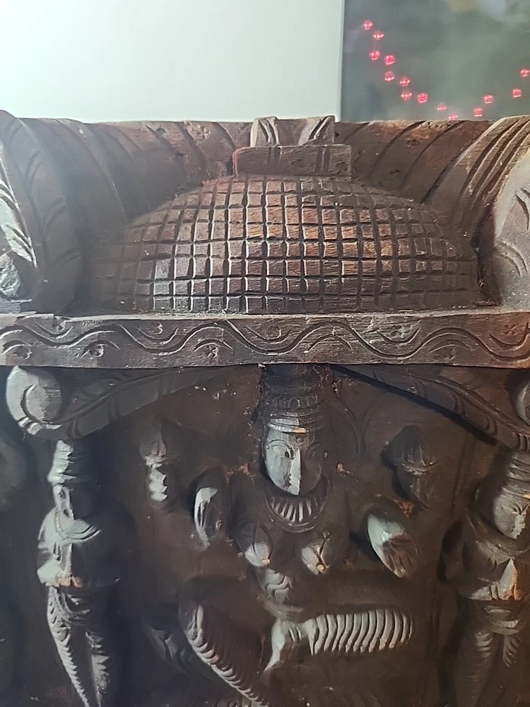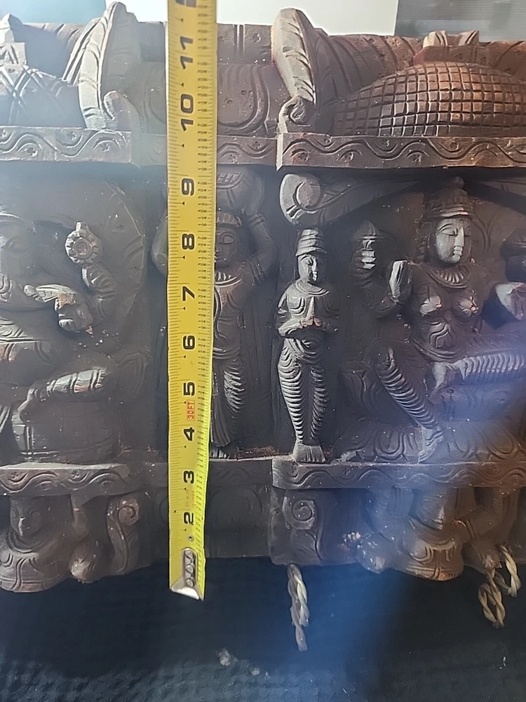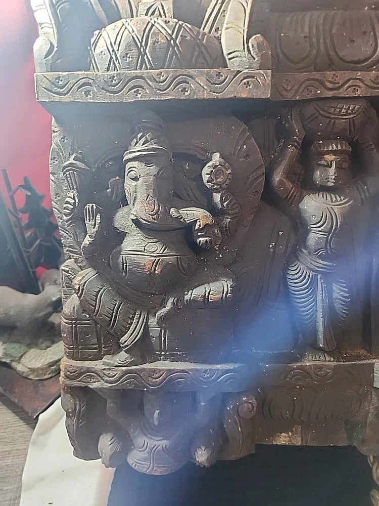 Hindu antique old rare find hand carved wood Hindu Ganesha unique panal. Has varies chips and scratches. Some white marks in some area. Used. Discoloration. Still a very beautiful piece. Some hands and eyes have chips. The back is scratched up and had chips. All these are shown in the pictures