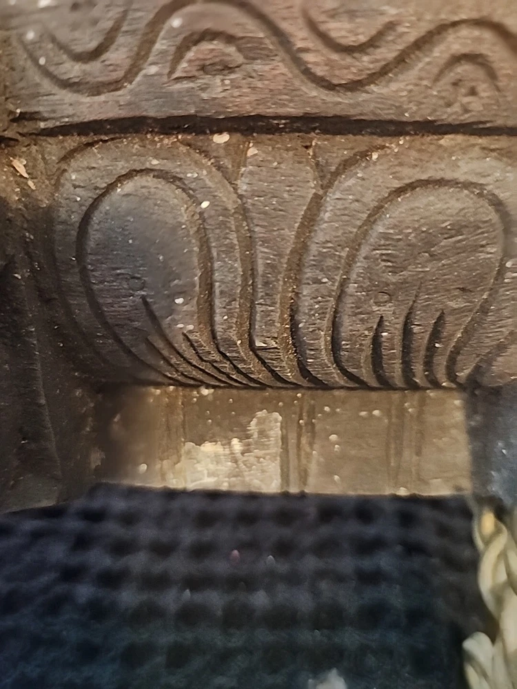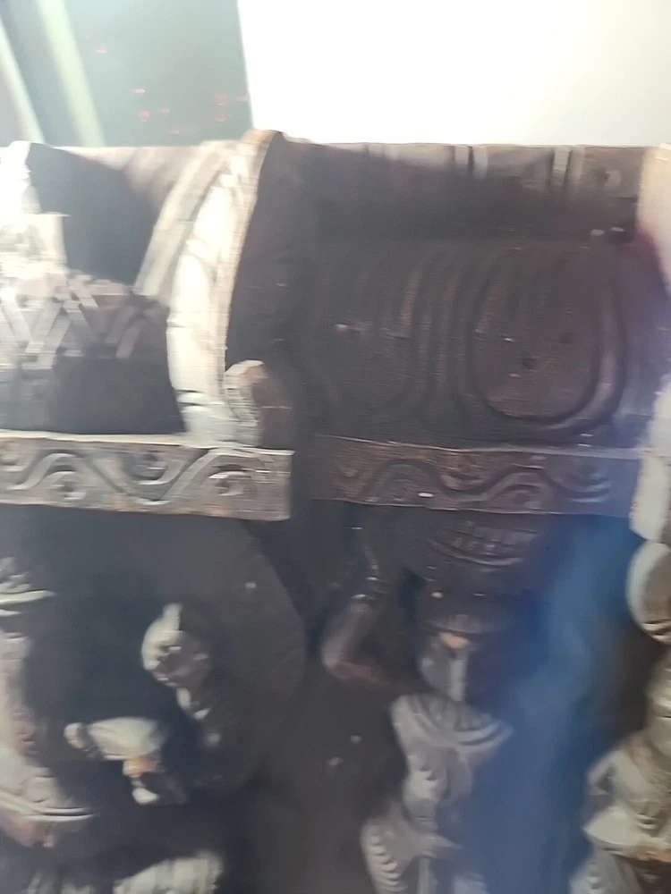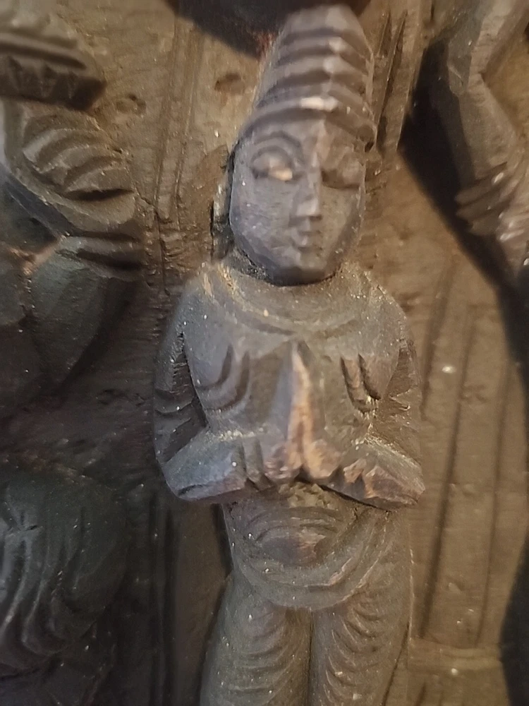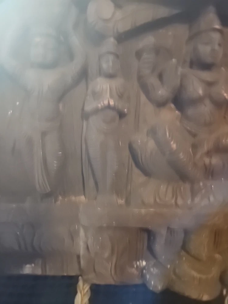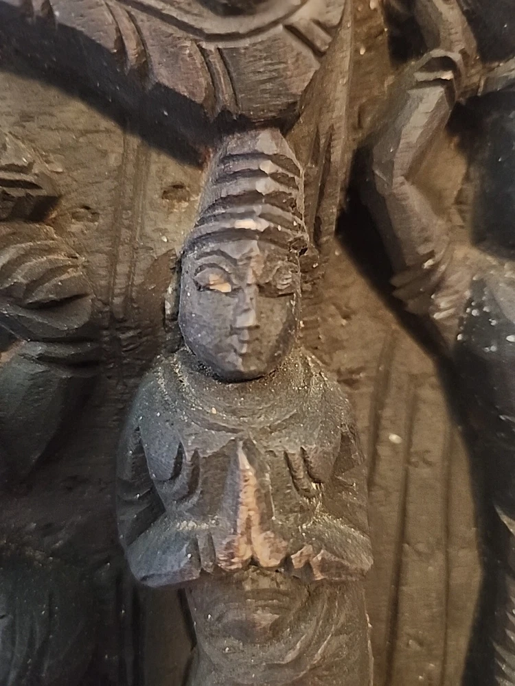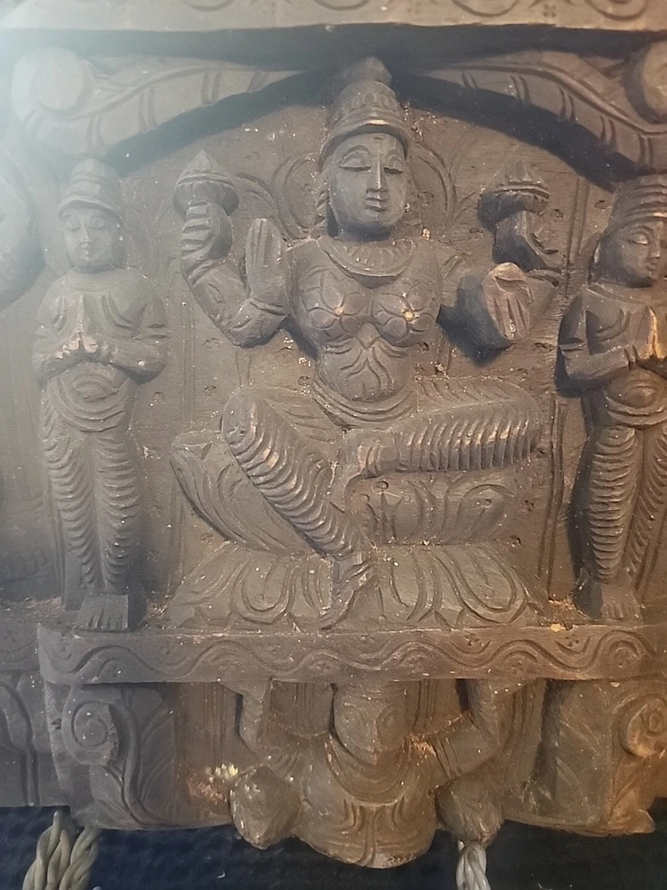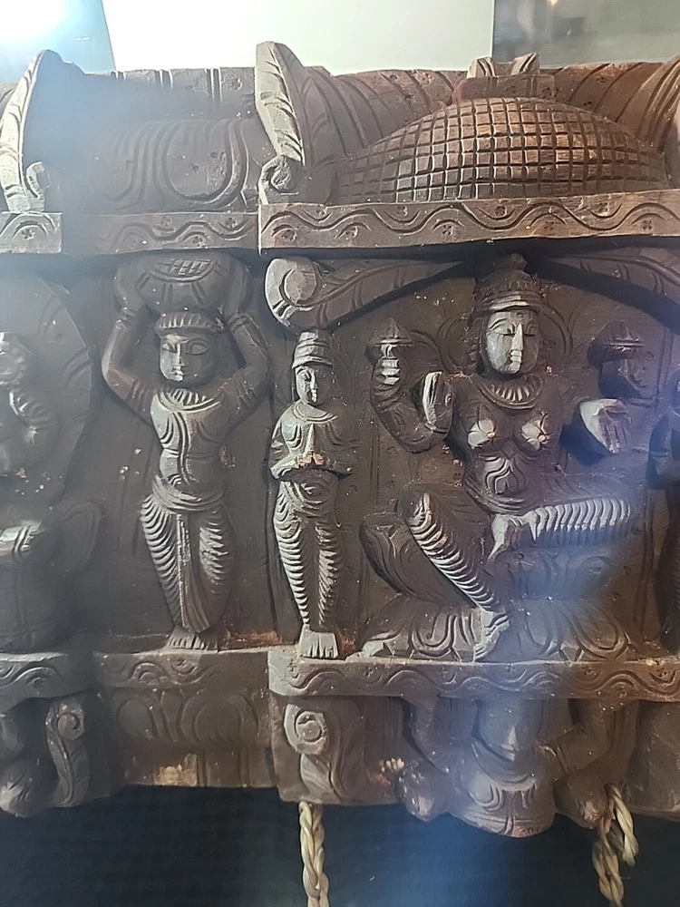 Hindu antique old rare find hand carved wood Hindu Ganesha unique panal. Has varies chips and scratches. Some white marks in some area. Used. Discoloration. Still a very beautiful piece. Some hands and eyes have chips. The back is scratched up and had chips. All these are shown in the pictures