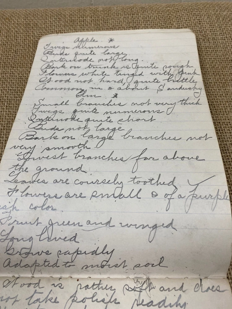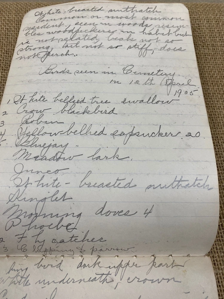 This an old notebook in which the writer studies birds, religion, foliage and more. The book is filled in from the front and the back. The center of the notebook is empty. There are only a few blank pages. It measures 6”x9”.