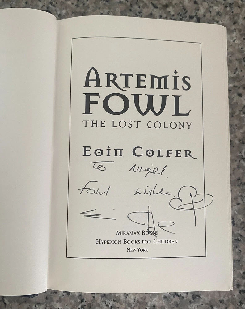 This Book is in Very Good Condition with no Rips, Tares, Writing or Damage to the cover. There is no Dust Jacket. This Book ls Signed by the Artist to a Nigel with more inscription than you see normally with a book signing. It is from a Smoke Free Home. Will Ship with Care in 1 Business after Purchase. This would make someone that likes the Author Eoin Colfer an excellent Christmas Present.