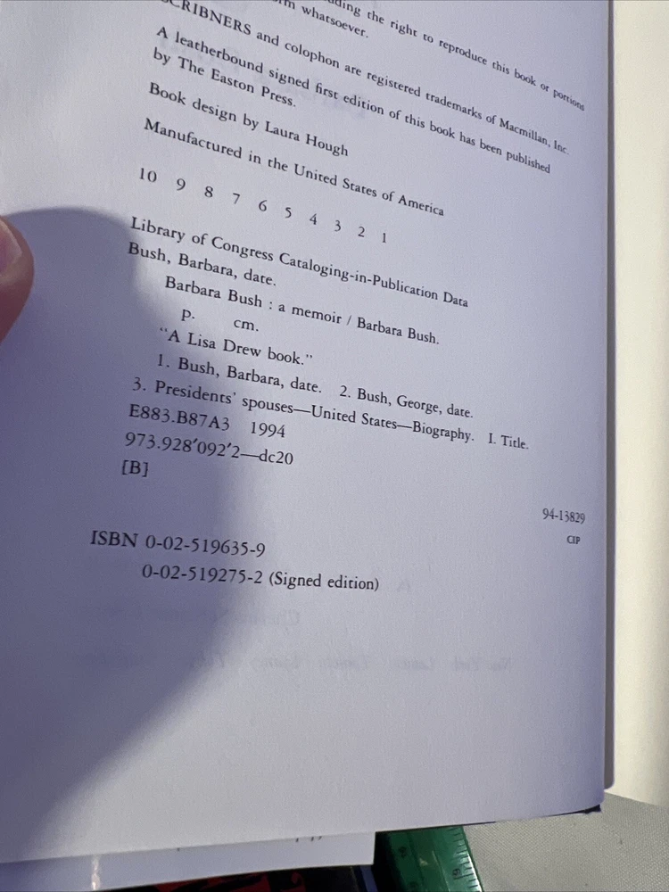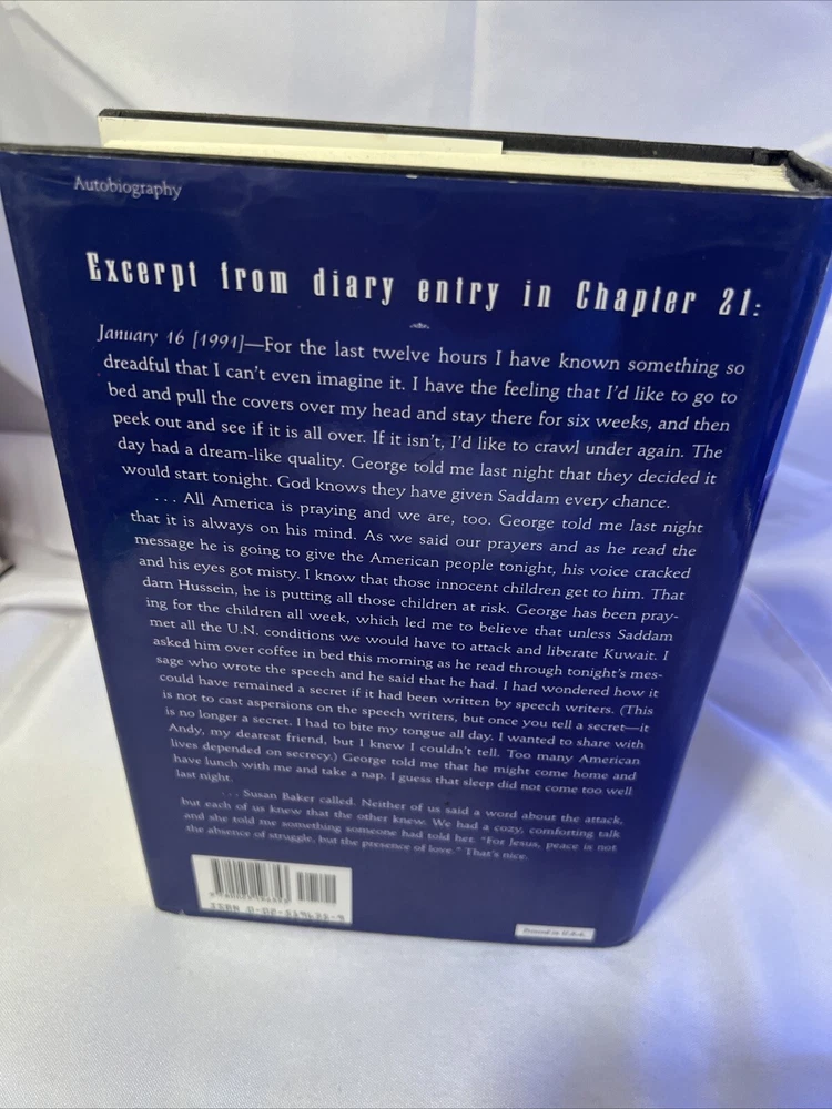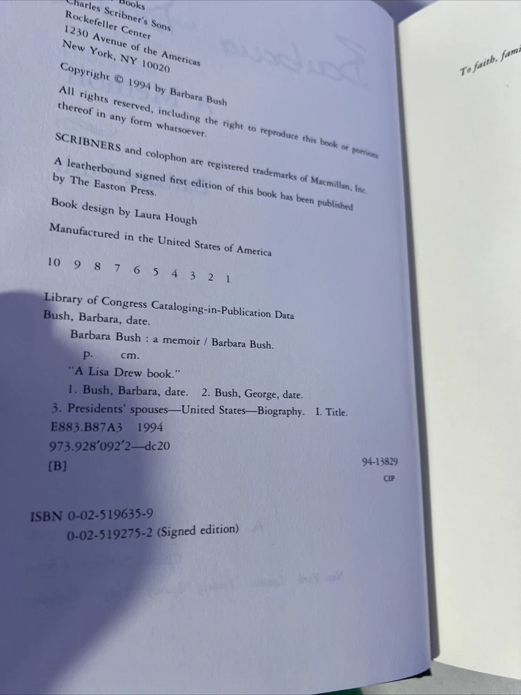 This rare, signed copy of Barbara Bush's memoir is a must-have for any collector or fan of the former First Lady. Published by Scribner in 1994, this hardcover book is in excellent condition and features 512 pages of insight into the life of one of the most influential women in American politics. The book measures 9.6 inches in length, 6.5 inches in width, and 1.8 inches in height, with a weight of 37 ounces. The memoir is written in English and explores topics such as women's rights, general biography, and the lives of presidents and heads of state. The book's genre is biography and autobiography, and it is illustrated by a variety of artists. This first print copy is a valuable addition to any book collection and provides a unique glimpse into the life of Barbara Bush.