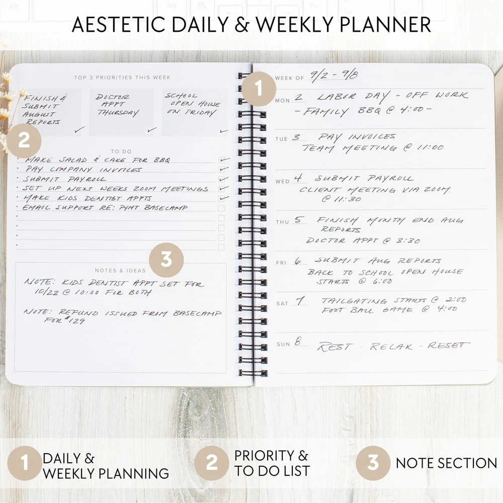 Transform Your Weeks By Planning For Success With The Beautiful Undated Weekly Planner By ZICOTO! Turn your weekly schedule into a smooth organizational masterpiece with ZICOTOs’ undated planner, designed to effortlessly tackle every week's tasks. The minimalist planner ensures 52 weeks of well-organized priorities, to-dos, ideas and more, offering efficient planning to streamline and de-stress your life. Experience the natural surge in focus and productivity with the functional to do list planner. The simple and clean layout enables you to maximize your focus, keeping your mind clear as you structure your weeks towards achieving your weekly goals. The 8.3x6.5” productivity planner offers plenty of space to unleash your inner organizational genius. Each week unfolds with two pages, offering ample space for priorities, to-dos, notes, and creative ideas. Seize the opportunity to get the most out of your weeks – and ultimately, your life. Each glance at your planner becomes an inspiring moment! Not only do you feel empowered by your new-found planning mastery, the beautiful design of the to do planner sparks creative flow and motivation. Furthermore, the sturdy ring wire binding adds stability and durability to your planner. Start your journey towards enhanced organization and reduced stress anytime you want - the undated design of the weekly planner makes it possible. Whether you're embarking on a weekly planning session, using it as a daily journal, a habit journal or simply freeing your mind with a daily brain dump, the undated planner is ready for you to grasp the opportunity and make a positive change in your life. Manage Your Weekly Agenda With Ease: Tackle each week effortlessly with Zicotos’ undated weekly planner. The versatile to do planner is designed for 52 weeks of organized priorities, to-dos, schedules and more. Streamline your life with efficient planning! Ultimate Focus & Productivity Boost: Thanks to the straightforward layout of the minimalist to do list planner you can transform your weeks into a well-structured, fulfilling journey towards your goals & aspirations by maximizing your focus and keeping a clear mind Plenty Of Space To Ignite Planning Mastery: Find ample space in the 8.3x6.5” undated planner to stay on track and get the most out of your weeks - and life. The productivity planner offers 2 pages per week with space for priorities, to do’s, notes & ideas Absolutely Beautiful & Modern Design: Turn your weekly planning routine into an inspiring experience! The top-notch undated planner stuns with a minimalist, stylish cover in timeless beige with an elegant gold foil and a robust golden ring wire Perfect To Start Anytime - Seize The Moment: Enhance planning, reduce stress - kickstart your life upgrade whenever you're ready! As a weekly planner, daily journal, habit journal or for your daily brain dump, the undated planner is ready for you to start anytime