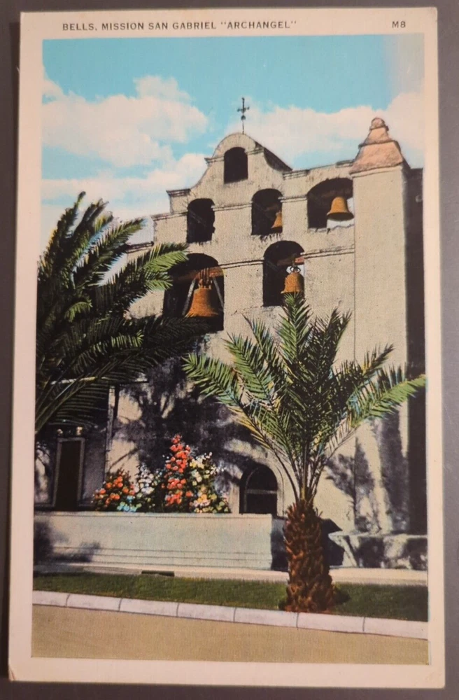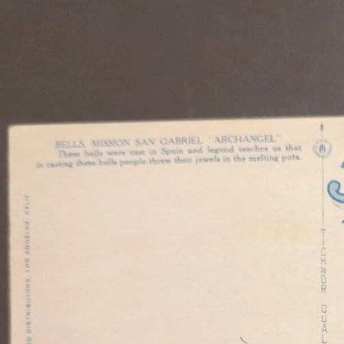 VTG Souvenir Postcard Bells of Mission San Gabriel "Archangel" California. There may be wear on the edges or a bent or torn corner, staining or writing on the card, creasing, or the card may have a cancellation mark. Most of the postcards I sell are 50 to 100+ years old and will never be perfect. Please examine the photos carefully for condition information. All postcards with a value of less than $20 are shipped via eBay Standard Envelope with a 2 mm postcard sleeve and a piece of cardstock on either side, taped closed with masking tape and placed in a heavy cardboard mailer. Postcards with a value of more than $20 are sent Ground Advantage in a 2 mm postcard sleeve, sandwiched between cardboard and shipped in a padded polybag. Both methods are provided with tracking.