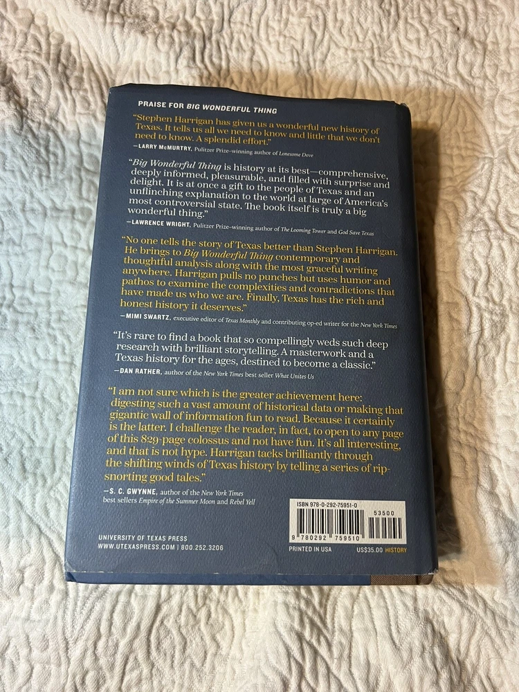 Number of Pages:944 PagesItem Length:9.5 inPublication Year:2019Language:EnglishPublisher:University of Texas PressISBN:9780292759510Item Width:6.3 inBook Series:The Texas Bookshelf Ser.Format:Hardcovergtin13:9780292759510MPN:Does not applyAuthor:Stephen HarriganItem Height:2.5 inBook Title:Big Wonderful Thing : a History of TexasItem Weight:61.1 OzBrand:UnbrandedTopic:United States / State & Local / Southwest (Az, NM, Ok, Tx)Illustrator:YesGenre:History