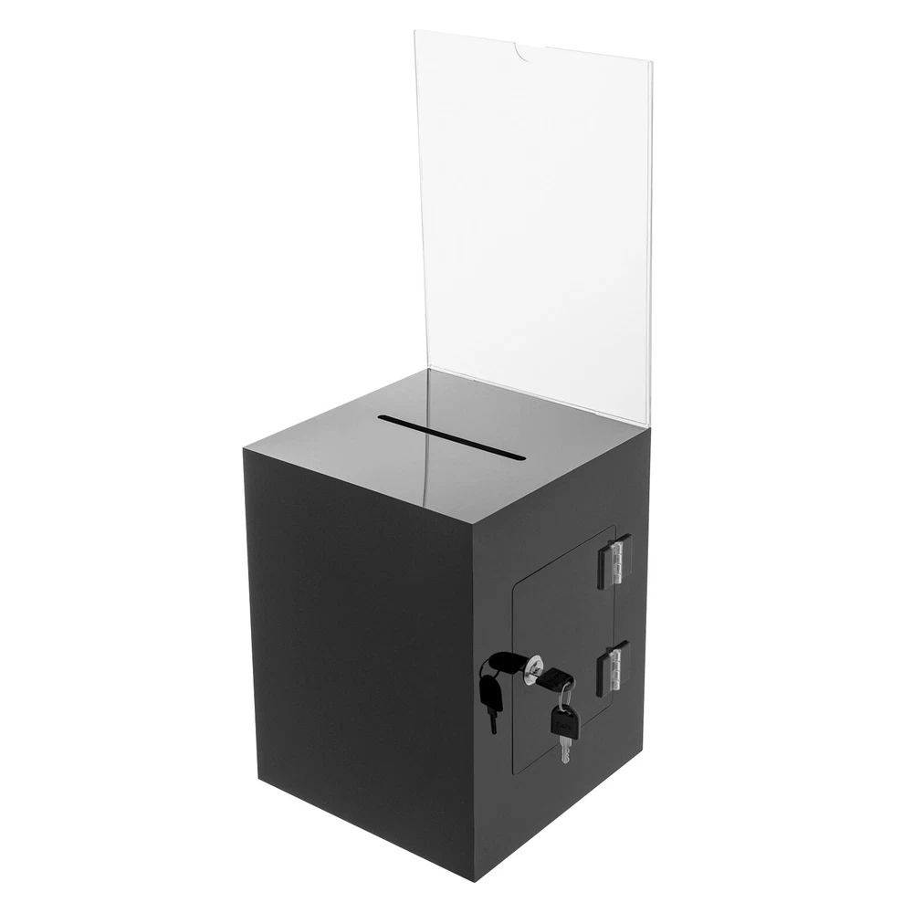 Package Included 1* Ballot Box 2* Keys Specification Color: Black Style: Modern Shape: Rectangular Material: Acrylic Process: Assembling, Bonding Assembly Required: No Mounting Type: Tabletop Lock Type: Key Number of Keys: 2 Capacity: 0.0075m³/0.26ft³ Suspended Load Capacity: 2kg/4.4 lbs Thickness: 3mm/ 0.12in Product Overall Height: 56cm/ 22in Package Size: 25*33*30cm/9.84*12.99*11.81in Box Size: 21.6*21.6*28cm/8.5*8.5*11in Box Door Size: 12.7*15.24cm/ 5*6in Sign Holder Size(L*H): 22*28cm/8.5*11in Slot Size: 100*5mm/ 3.93in*0.2in Gross Weight: 2.8kg/ 6.17lbs Net Weight: 2.3kg/ 5.07lbs Black Donation Box with Lock Ballot Box with Sign Holder Suggestion Box USA Description Voting or fundraising activities are right in front of you, but do you lack practical voting boxes? Let's take a look at our acrylic ballot box! With a lock and two keys, it can help you organize more professional voting and fundraising activities. Why wait? Choose our ballot box at the heart of your activities now! Key Features High-quality and Durable: It is made of high-quality acrylic with assembling and bonding processes, which has high tenacity and is not easy to break and deform. Suitable Size: The box size of 8.5*8.5*11 in ches provides sufficient space to accommodate items like coins and coupons while only taking a small footprint, making it a very suitable size. Professional and Modern: It can be used as a ballot box, charity box, etc., and the black, modern appearance adds a solemn and professional image to your activities. Good Protection: It has a lock with 2 keys that can prevent the loss of internal items and also provide convenience for you to take out internal items. Good Helper: With the help of this ballot box, you can easily accept the opinions of employees or customers and solve existing problems promptly, which is conducive to improving your image and providing better services for them. Easy to Clean: The smooth surface and simple structure allow you to easily remove dust from the surface with a towel. Ideal Gift: This practical product will be a wonderful surprise for your friends who need voting and fundraising activities , making their activities more professional. Buy with Confidence: We stand behind all our guests and look forward to assisting you with your purchase. It is our pleasure to answer your confusion and questions. The end of the story between us is not "we sell and you buy". Details Sign Holde r : You can insert paper with voting or donation promote information into it without the need for glue. The curved groove design makes it more convenient for you to take out the paper from the sign holder. Slot : It is convenient for you to put in letters or cards. Application It is suitable for restaurants, companies, churches, coffee shops, hotels, salons, bars, proms, parties, marketing promotions, tradeshows, exhibitions, etc., to accommodate donations, ticket comments, suggestions, coupons, ballots, notes, coins, business cards, and tips. Specification Color: Black Style: Modern Shape: Rectangular Material: Acrylic Process: Assembling, Bonding Assembly Required: No Mounting Type: Tabletop Lock Type: Key Number of Keys: 2 Capacity: 0.0075m³/0.26 ft³ Suspended Load Capacity: 2kg/4.4 lbs Thickness: 3mm/ 0.12in Product Overall Height: 56cm/ 22in Package Size: 25*33*30cm/9.84*12.99*11.81in Box Size: 21.6*21.6*28cm/8.5*8.5*11in Box Door Size: 12.7*15.24cm/ 5*6in Sign Holder Size(L*H): 22*28cm/8.5*11in Slot Size: 100*5mm/ 3.93in*0.2in Gross Weight: 2.8kg/ 6.17lbs Net Weight: 2.3kg/ 5.07lbs Package Included 1* Ballot Box 2* Keys Notes Please confirm the dimensions before purchasing. Please note this product does not include any card or money. Please allow the slight color difference caused by the shooting light and 1-3 cm error due to manual measurement, and make sure you do not mind before ordering. Payment Delivery details Terms of sales About us Contact us Payment We accept ebay payment 。 Fees such as import duties, taxes are not included in the item price or shipping costs. These charges are the buyer's responsibility. Delivery details Shipping: 2-9 working days to: USA Terms of sales We maintain high standards of excellence and strive for hundred percent customer satisfaction. Feedback is very important to us. We hope that you contact us immediately before you give neutral or negative feedback, so that we can address your concerns. It is impossible to address issues if we do not know about them! About us Your satis faction is our ultimate goal. We work hard to earn your trust and future business. Our certified technicians have tested each item before shipping. The unit comes with 1 year limited warranty on all manufacturing defects. a) If you receive a defective item, you may return it or ask for a discount. Please contact us within 14 days after you receive the package. b) What you returned must be intact and in its original packaging as re? u. Customer is responsible for shipping costs of the returned item. c) We will cover the cost of shipping back t with the shipping rate indicated in the registration page. We will send you a new unit or refund the full payment you paid. Thank you. Contact us Business Hour Business Hour: Monday To Friday: 8:30 AM to 5:00 PM (Beijing China time) Due to time zones, our reply to your questions may not be immediately. But within above working time, we will reply your email within 24 hours. If it's non-workdays, please kindly be patient and wait till Monday. Please contact us with ebay message. Please feel free to contact us if you have any questions. Monday To Friday: 8:30 AM to 5:00 PM (Beijing China time) Due to time zones, our reply to your questions may not be immediately. But within above working time, we will reply your email within 24 hours. If it's non-workdays, please kindly be patient and wait till Monday. Please contact us with ebay message. Please feel free to contact us if you have any questions. On Nov 5, 2024 at 18:28:39 PST, seller adde
