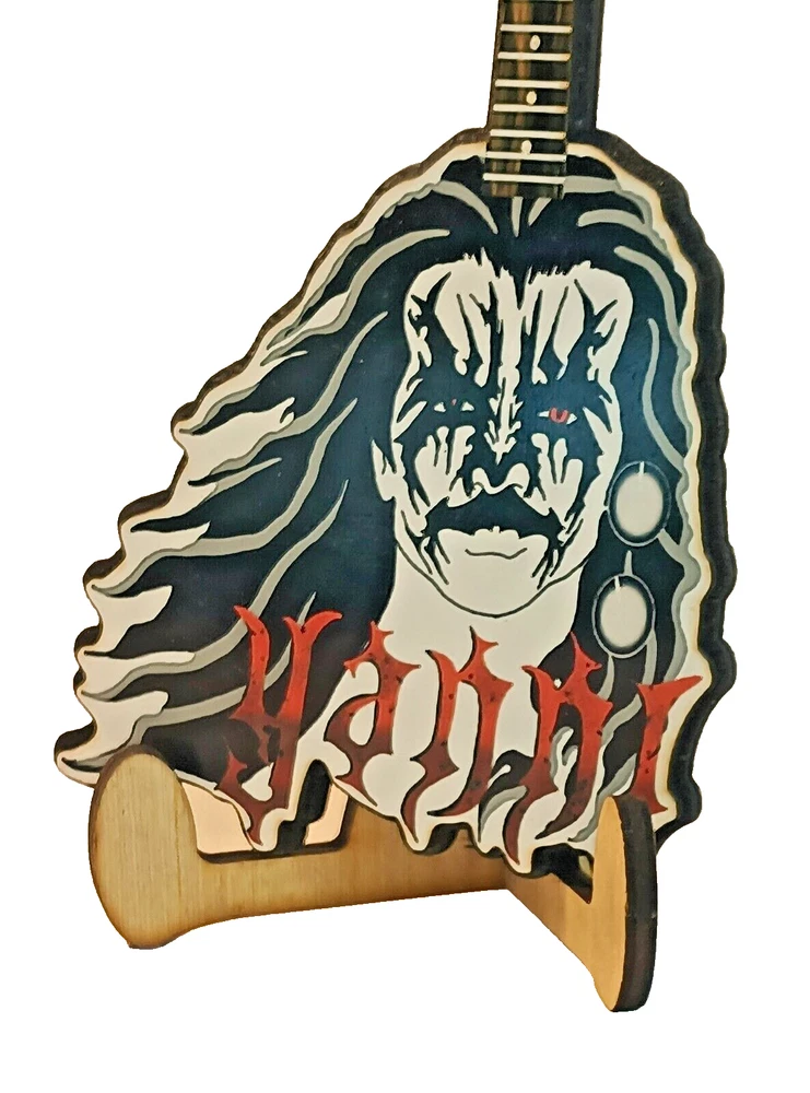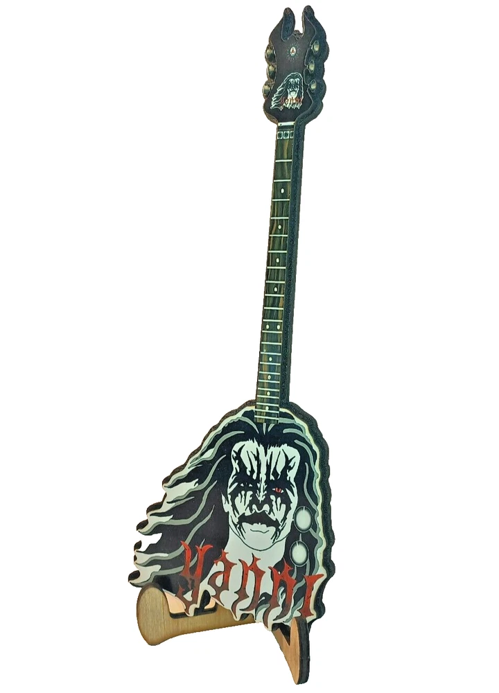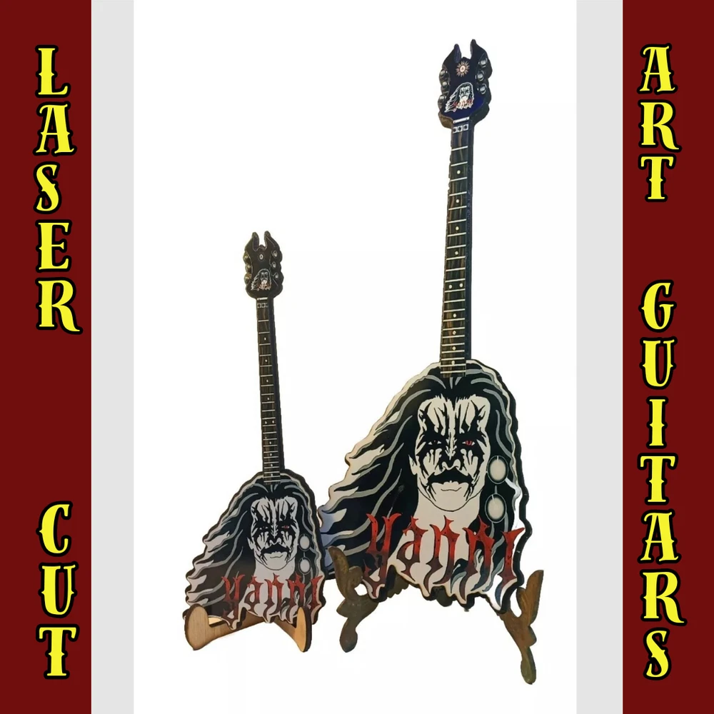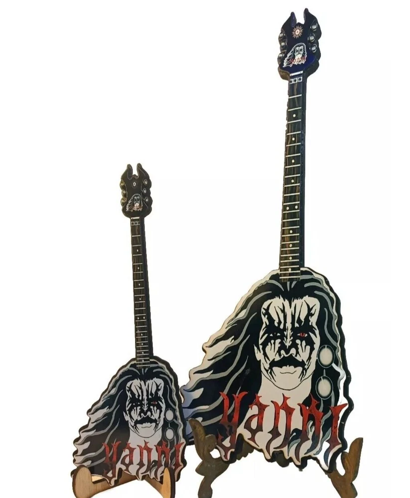 ***Treasure Suite offers you many pieces of my art prints now*** ###This section is for large sized laser cut art guitars,cellos,etc. Approximate measurements are 17"hx6"wx.25"d. ### Nobody asked for a mini black metal Yanni art guitar with an even smaller version of him as headstock, but you got it anyways. Live a little and git some. Welcome to my unique collection of digital art, where creativity meets craftsmanship! Each piece in this category features my original designs, heat pressed into vibrant sublimation prints on laser cut wood or polyester canvas material. These art pieces are not just decorations, they are collectibles that bring a touch of gothic, rock and roll, horror, pin-up, and lowbrow art into your space. Explore an array of striking designs on my mini guitars to other stringed instrument laser cut art pieces, available in 2 sizes and complete with custom laser cut foldable stands that I personally designed. These pieces are perfect for adding a distinctive edge to your home or office, and they make fantastic gifts for art enthusiasts and collectors alike. Looking for something truly one-of-a-kind? I may accept custom orders to bring your unique vision to life. Dive into a world of bold, expressive art that stands out and speaks to the rebel in all of us!