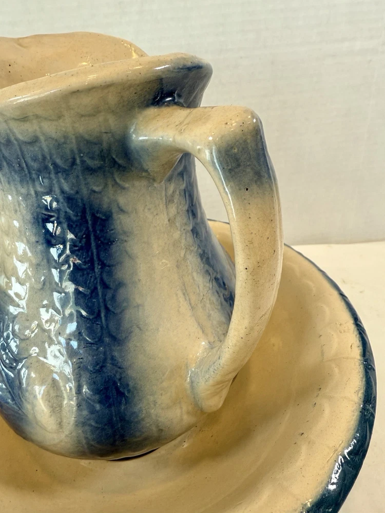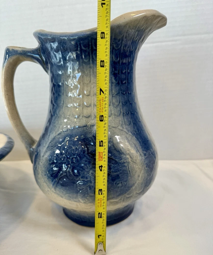 ** see pics for small chip (not all the way thru). This two-piece Blue & White Stoneware Wild Rose Pitcher & Bowl Basin Wash Bath Set is an antique Victorian-era piece handcrafted in the United States. The set features a beautiful fishscale and wild roses pattern on semi-gloss finish stoneware, with a blue color scheme. The pitcher and bowl are both round in shape, with the pitcher standing at 10 inches tall and the bowl having a diameter of 15.25 inches. This vintage wash set is perfect for all occasions and adds a touch of floral charm to any home decor.