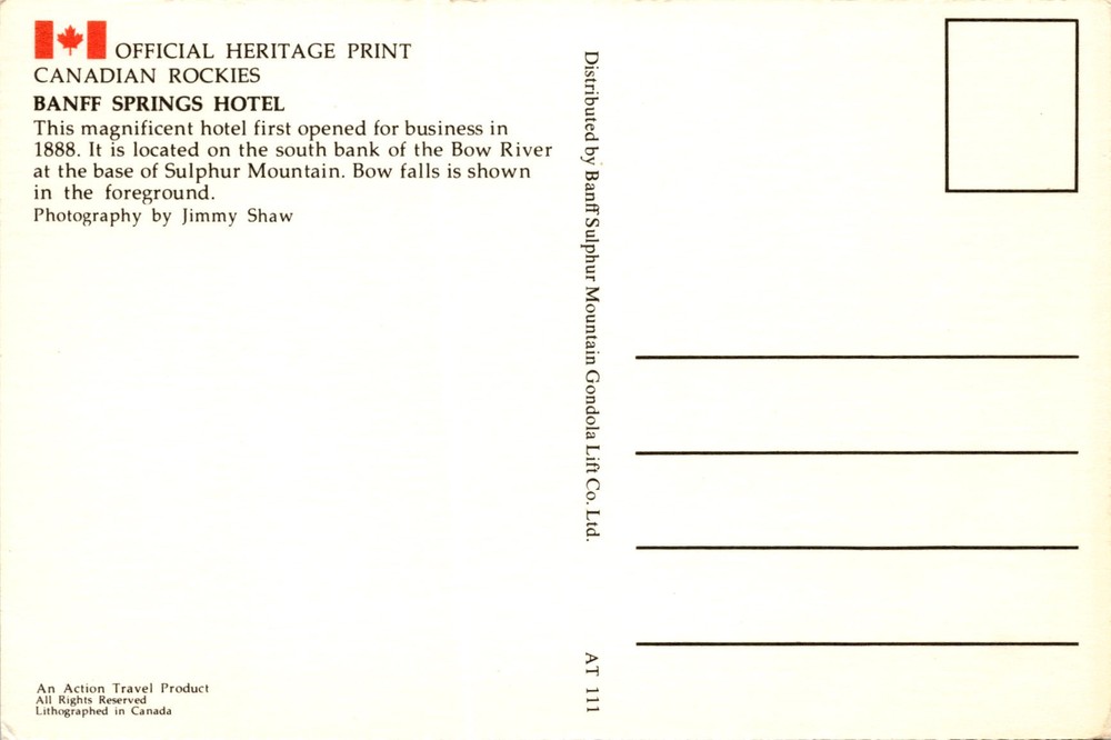 CANADIAN ROCKIES, BANFF SPRINGS HOTEL, Bow River, Sulphur Postcard. MAKE AN OFFER. THE MORE YOU BUY THE BETTER DEAL I WILL ACCEPT The postcard features a photograph of the Banff Springs Hotel in the Canadian Rockies. The hotel, which opened in 1888, is situated on the south bank of the Bow River at the foot of Sulphur Mountain. The image on the postcard includes a view of Bow Falls in the foreground.