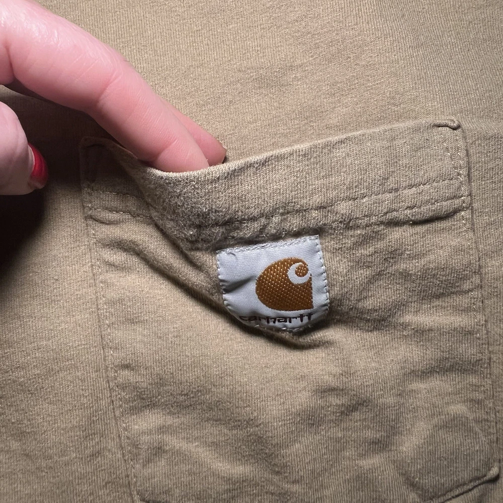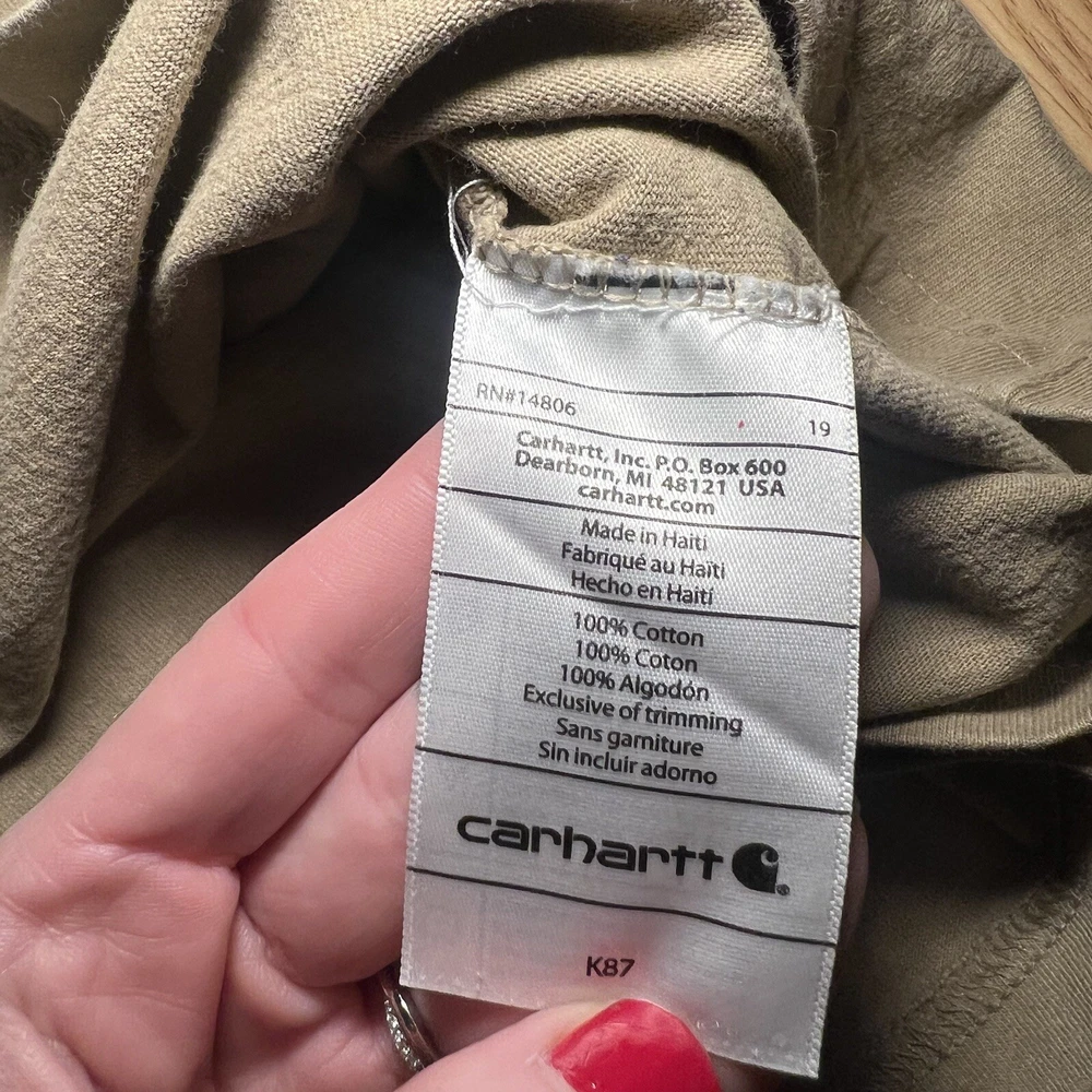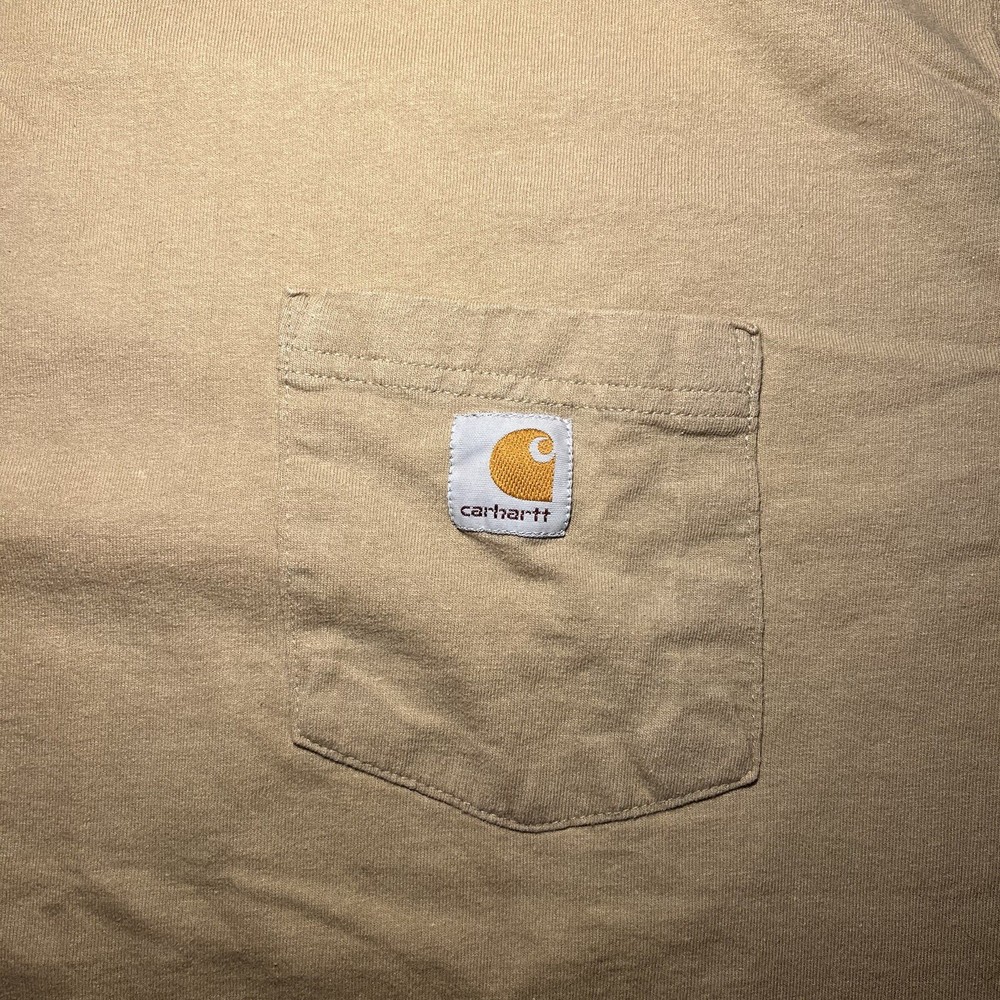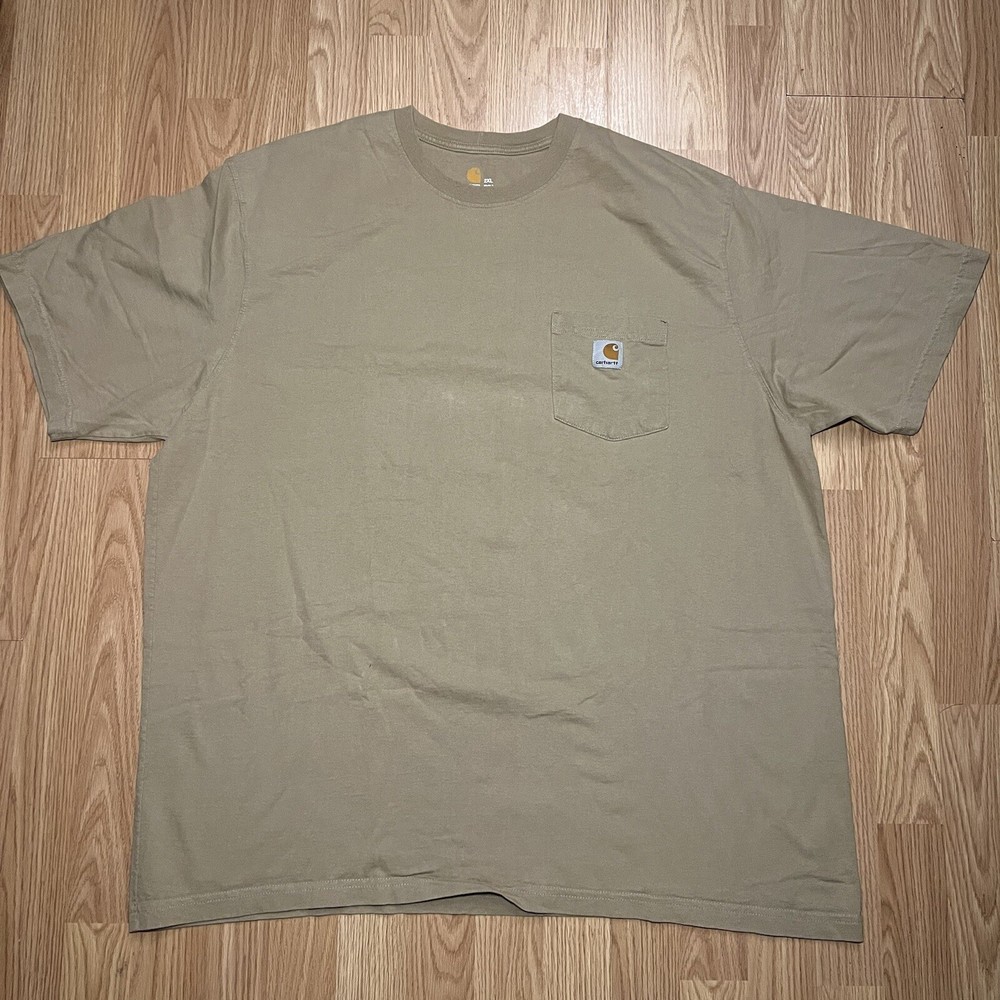 Neckline: Crew Neck Country/Region of Manufacture: Haiti Size: 2XL Department: Men Model: Carhartt K87 Color: Tan Material: Cotton Sleeve Length: Short Sleeve Garment Care: Machine Washable Features: Heavyweight, Pockets, Easy Care Accents: Logo Pattern: Solid Season: Fall, Spring, Summer, Winter Theme: Classic, Outdoor, Workwear Type: T-Shirt Size Type: Regular Fit: Original Fit Brand: Carhartt